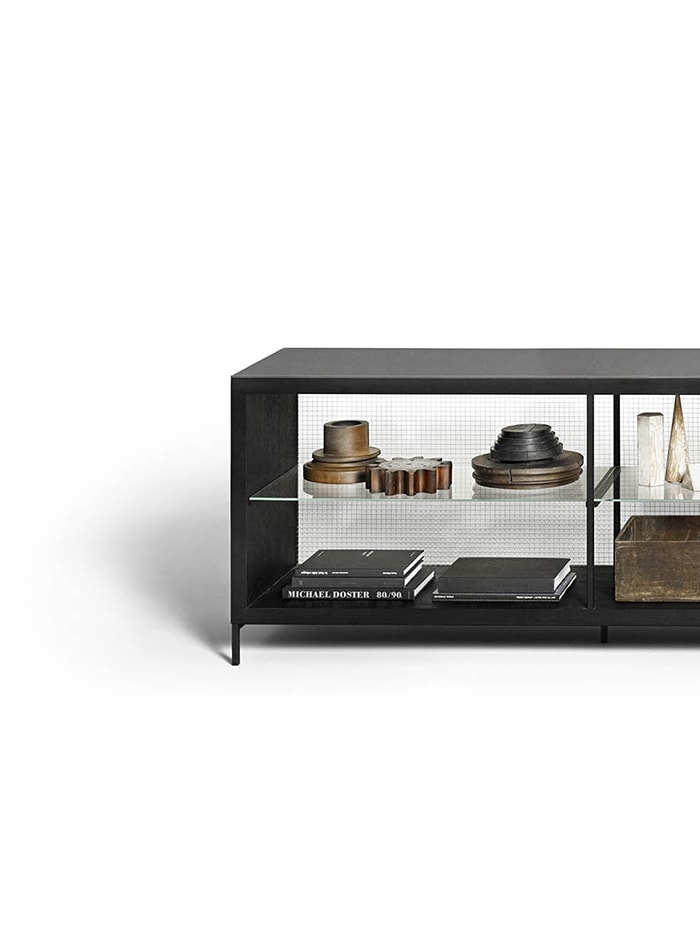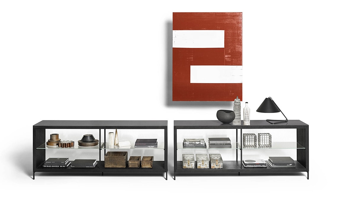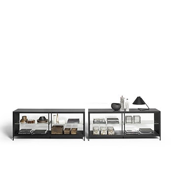 方形,光滑,易于插入客厅。由Piero Lissoni设计的Combi餐具柜是两种不同高度的开放式橱柜,并带有可选的内部照明,可展示物品和餐具。在哑光黑钢底座上采用天然、深色或炭灰色橡木制成的全套饰面确保了最大的定制性。