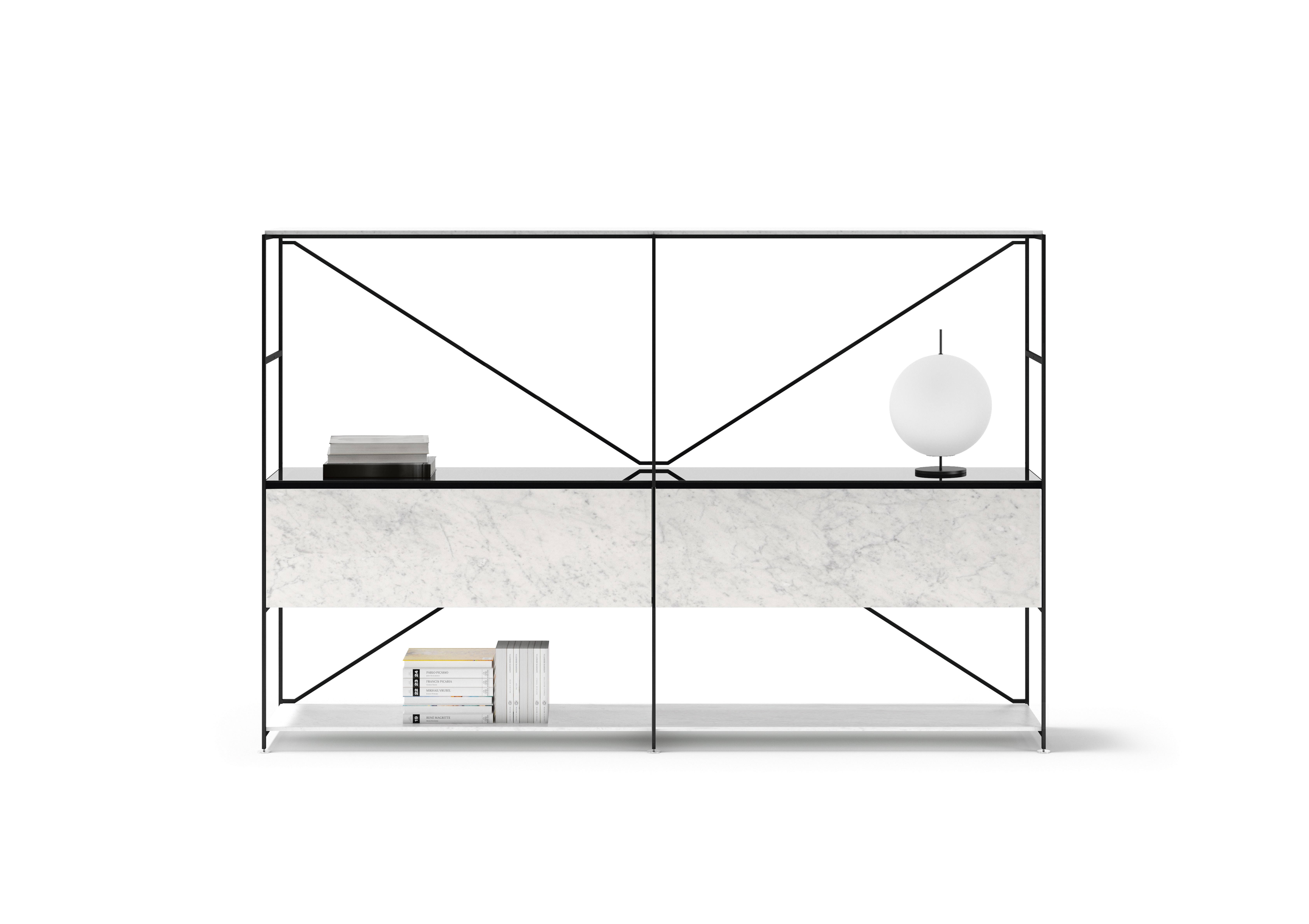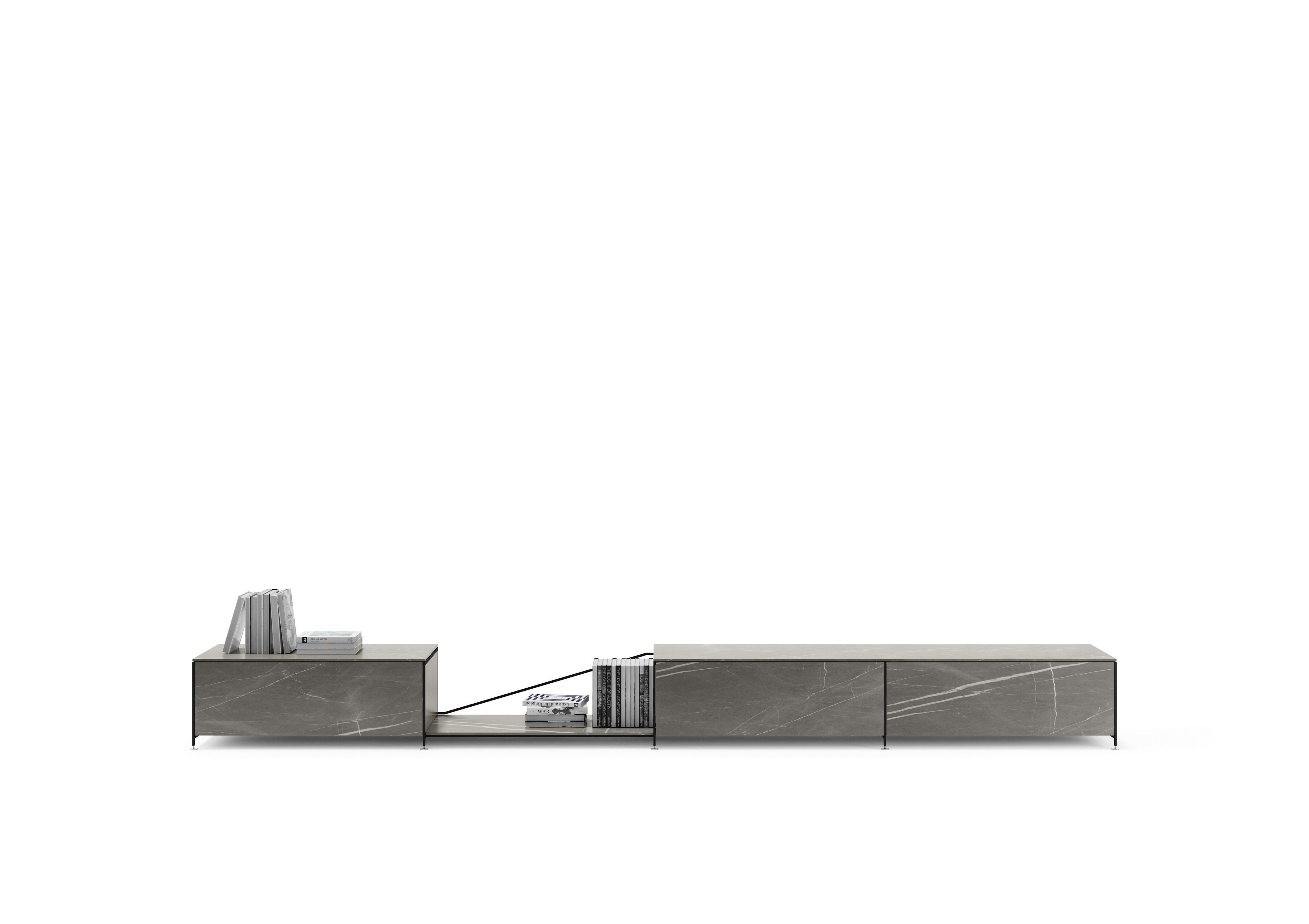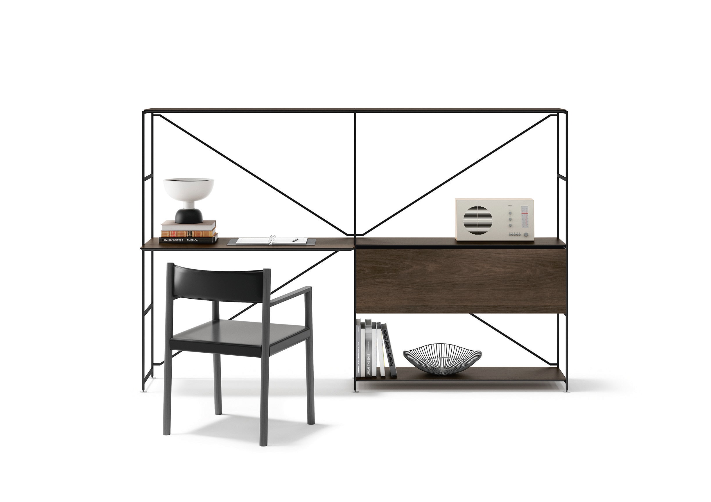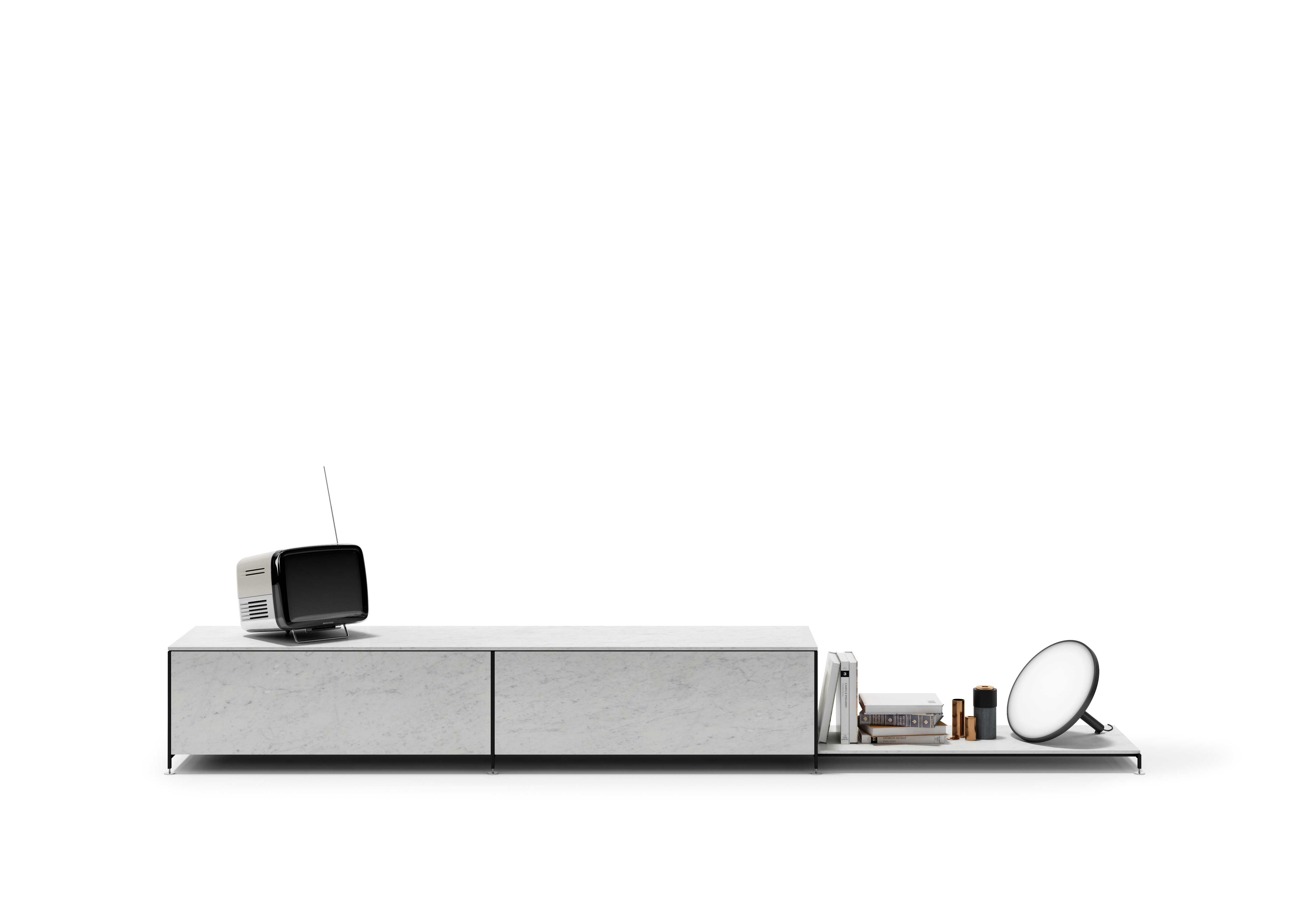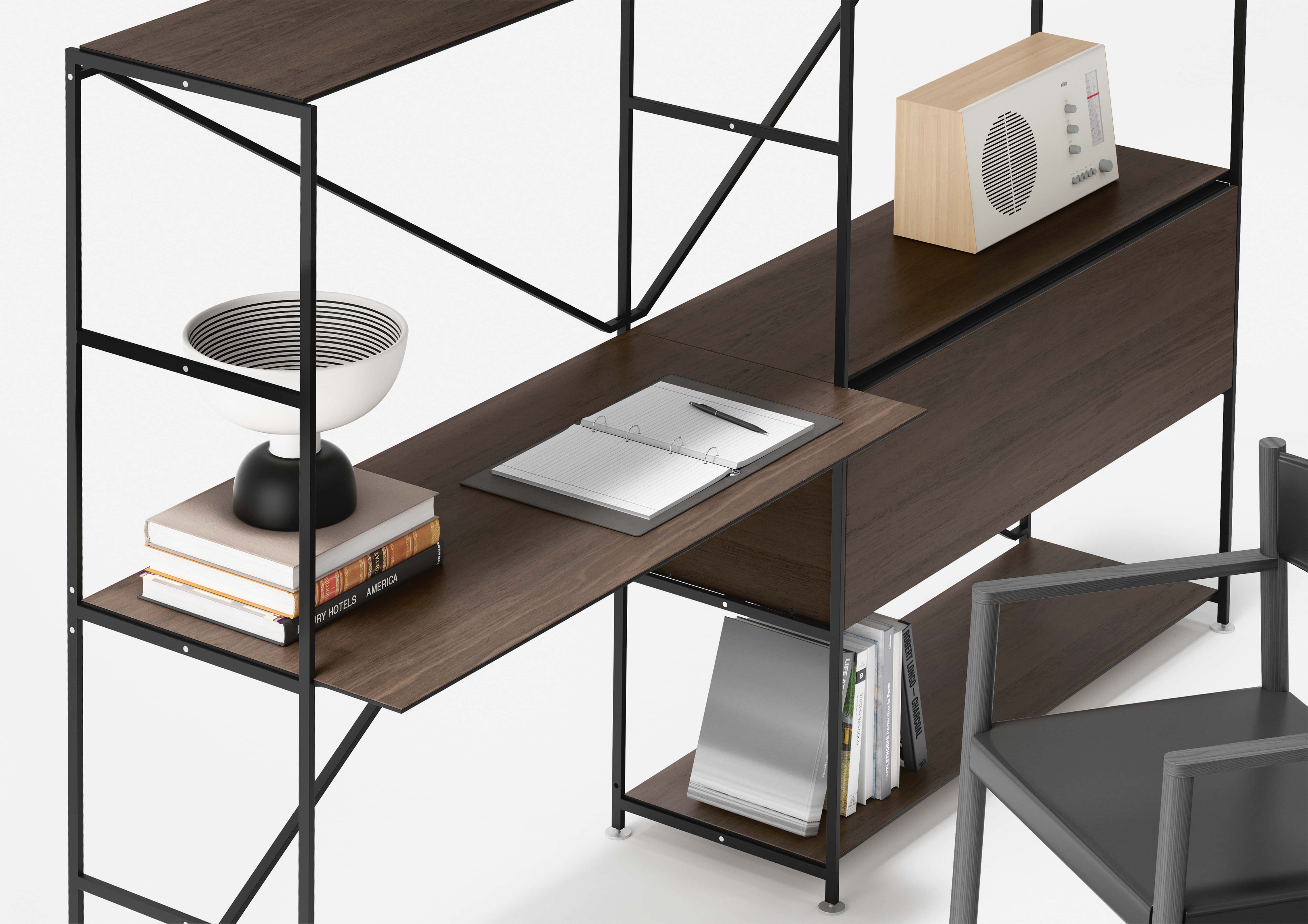 模块化的R.I.G.搁架系统能够转换为适用于客厅,书房,门厅和餐厅的任意数量的薄型家具解决方案,包括电视架,用于照明的小桌子,书柜和低高度书柜。