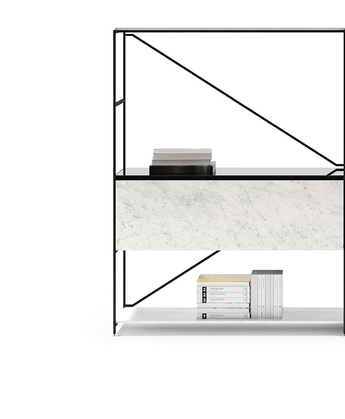 在起居区,R.I.G.可以布置成书柜,桌面,用于音频和视频系统的低矮家具。它可以装饰墙壁或留在房间内独立放置。将模块化的智能质量与每个独立元素的美学价值相结合,因为独特的结构轻便性和材料为配件提供了便利:不同深度的货架和包含的模块。