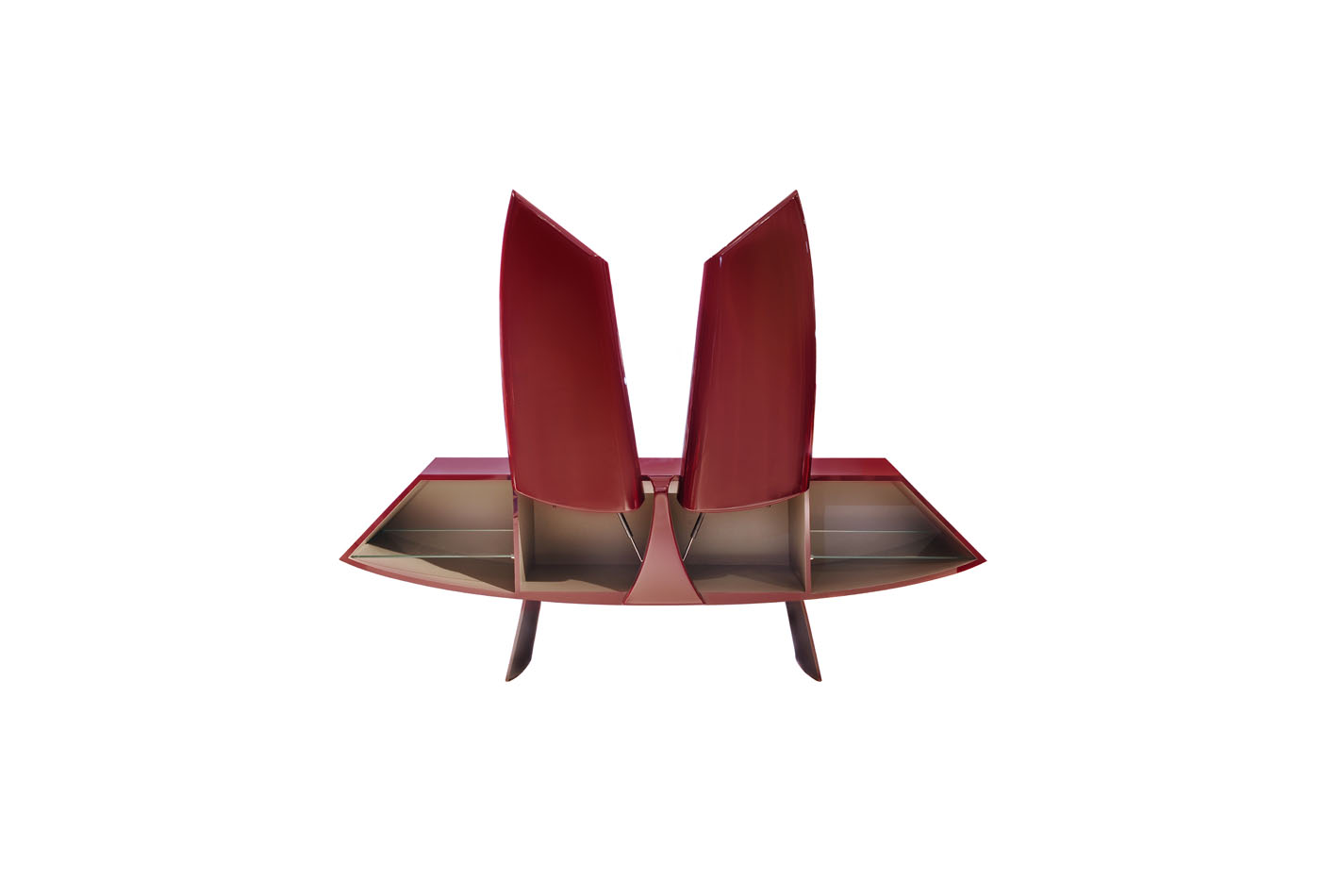 结构采用Daquacryl®(3毫米厚高光泽PMMA工程复合木材单板,37个颜色可用),门有垂直开口,带千斤顶。内部架子采用8毫米厚的透明玻璃。腿胶合板漆面,只有灰色。