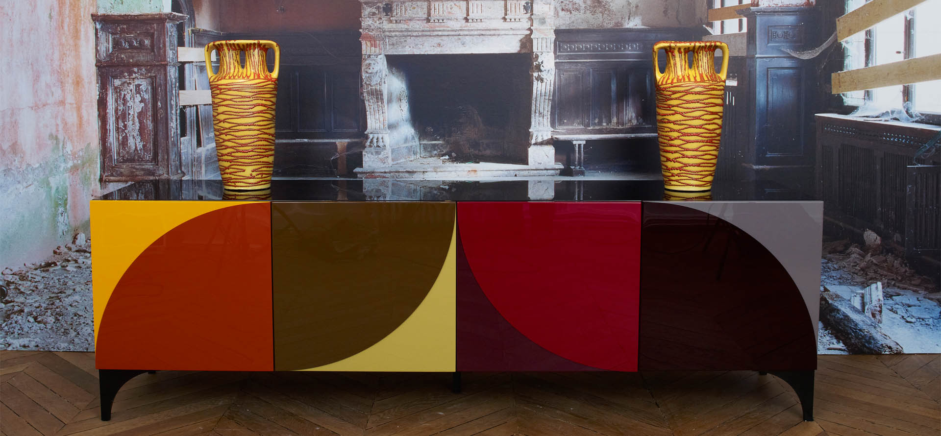基材:餐边柜(4门); 柜体与支脚为黑色。门面板Daquacryl 从左往右颜色依次为:Moutarde; Terracotta; Cobalt; Violet; Framboise;MANGUE; Ani