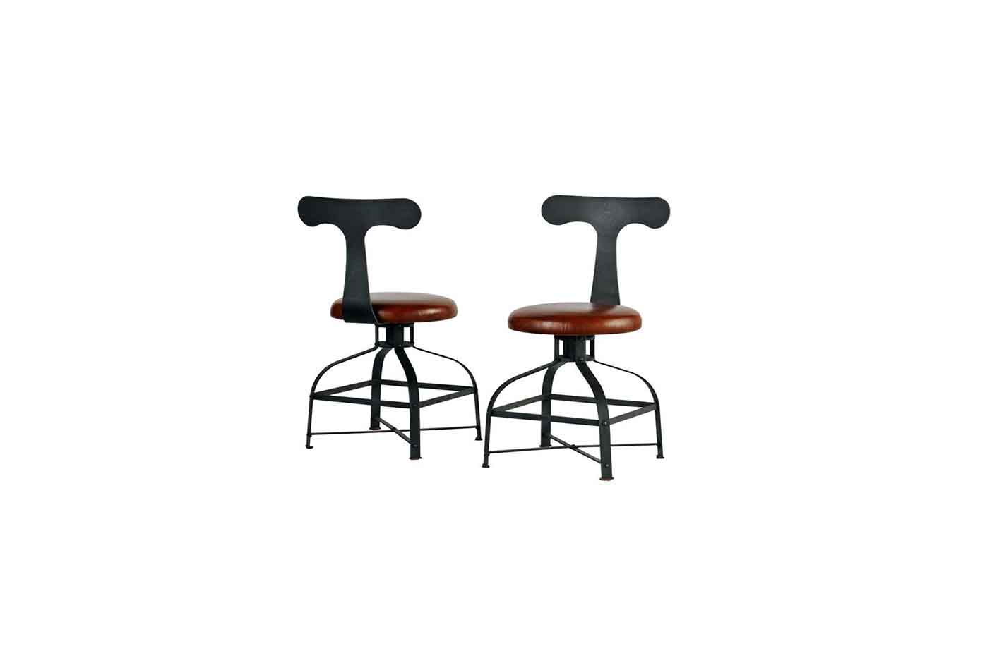可旋转的皮革坐垫座椅,铁的框架结构。扶手椅用厚皮革,凳子用皮革。