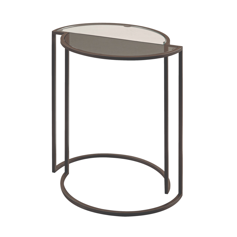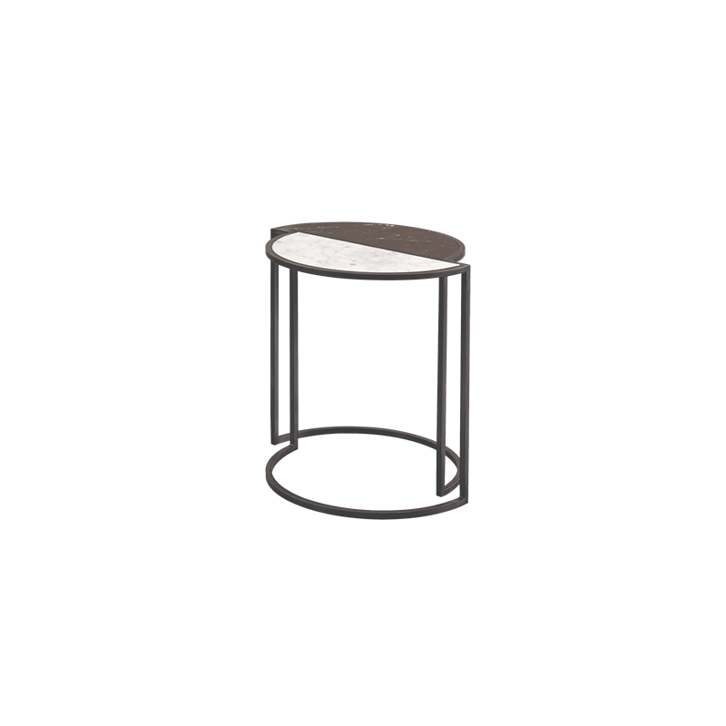 描述:茶几桌面为两个半圆的大理石盘子,金属底座有两种饰面可选。