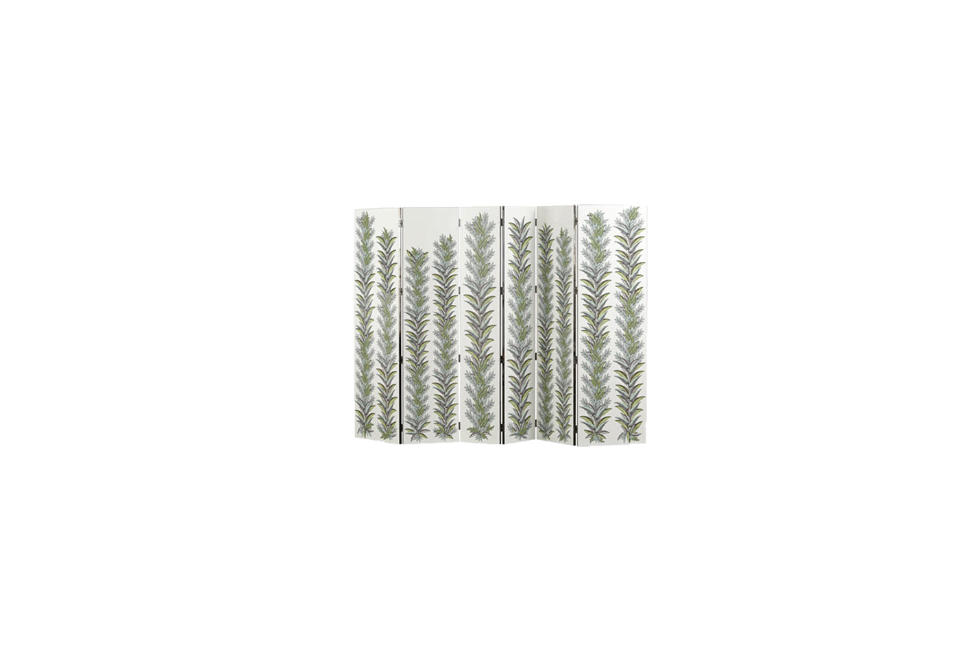 描述:屏风使用数字印刷技术,一面是水滴效果搭配“群鸟交响乐”的图案,另一面是植物纸条的图案。