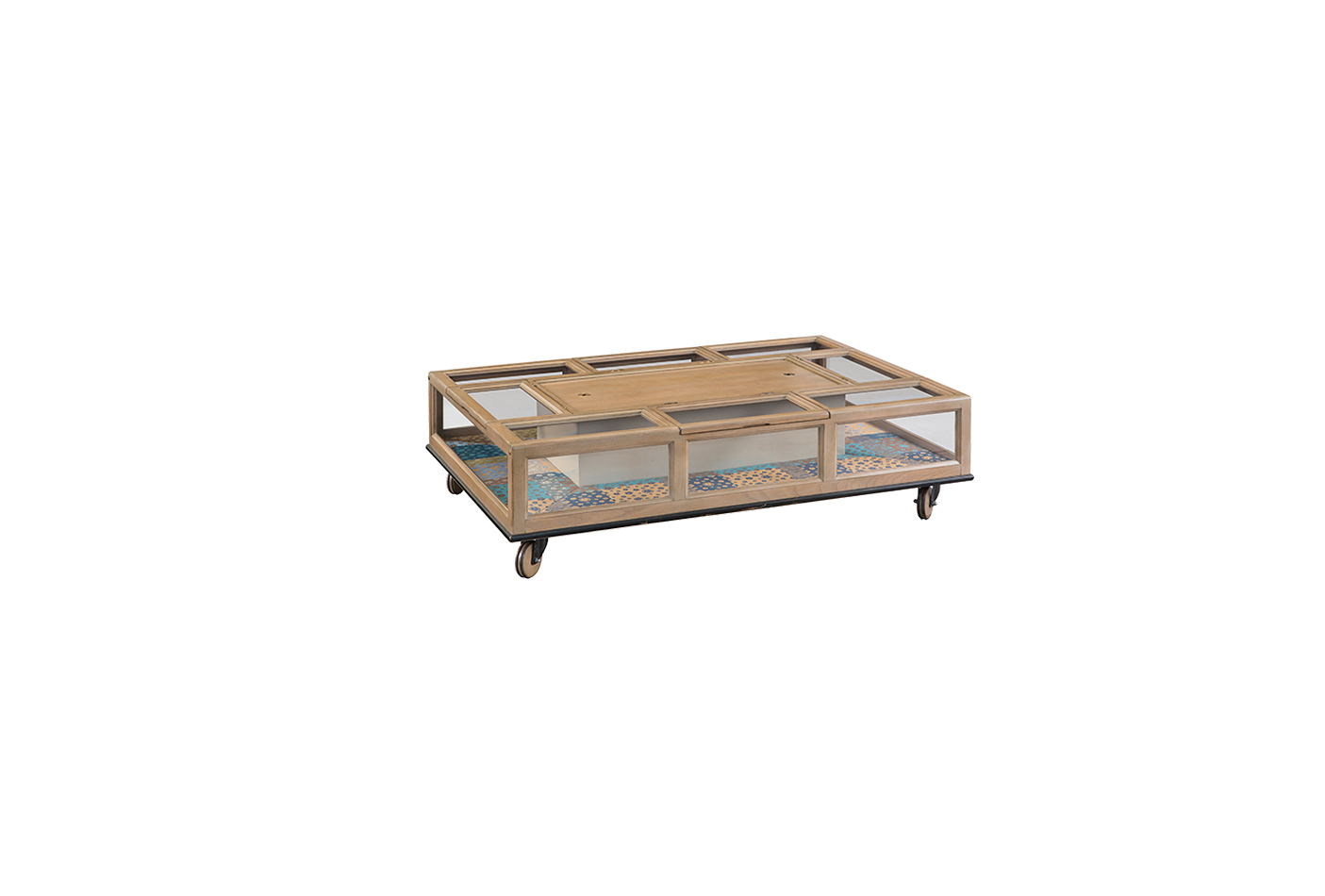 描述:由4面的玻璃分区和1个中央储物空间组成,樱桃木结构框架,茶几顶面、底面和存物格采用樱桃木贴面复合木材,带有4个滚轮,多种漆面可选。