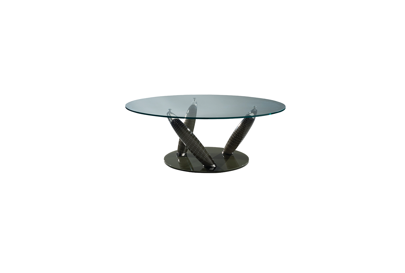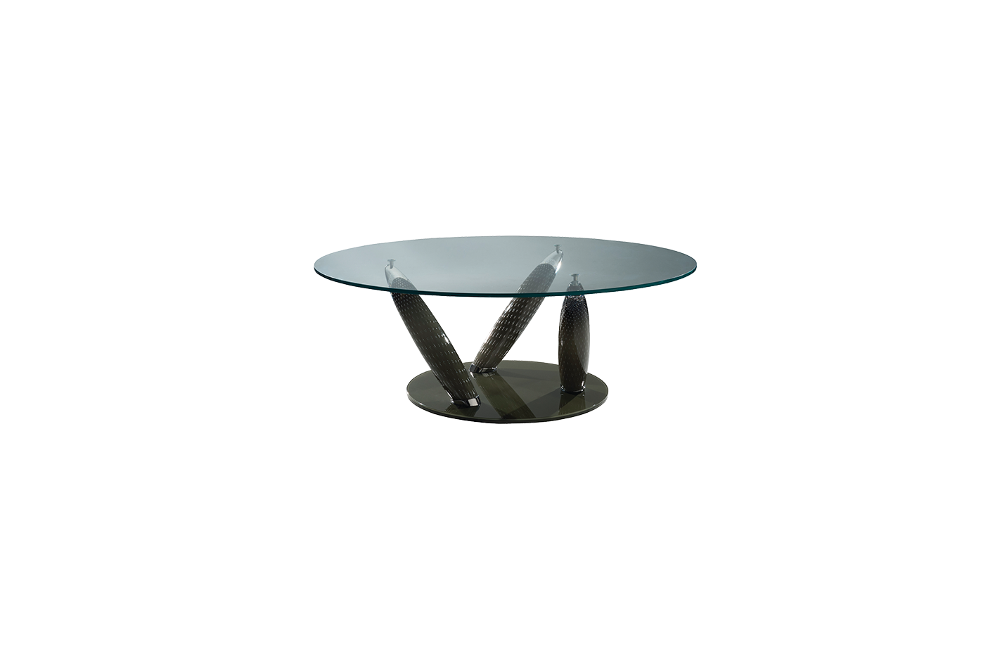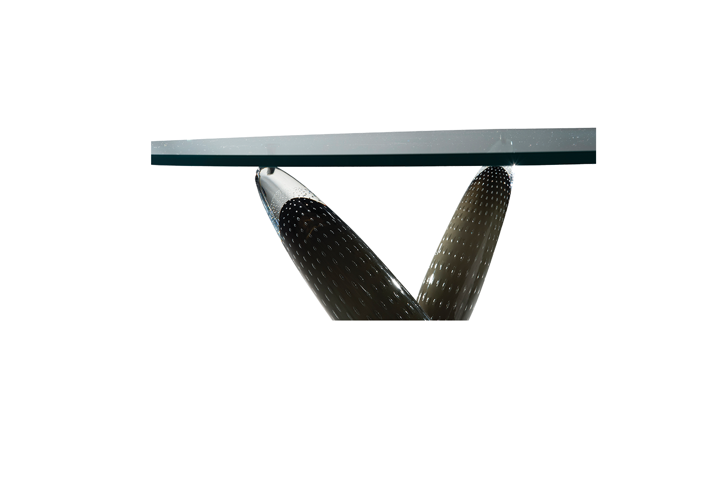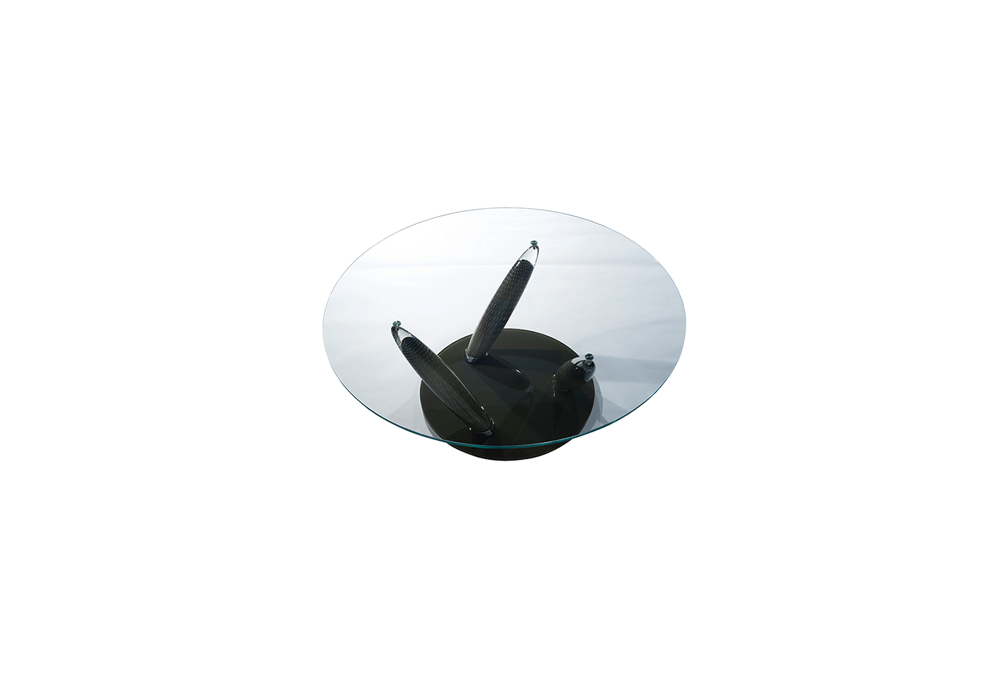描述:三脚吹制玻璃茶几,底座用钢覆盖玻璃,漆面为青铜色或白色,桌面为10mm厚的钢化玻璃。