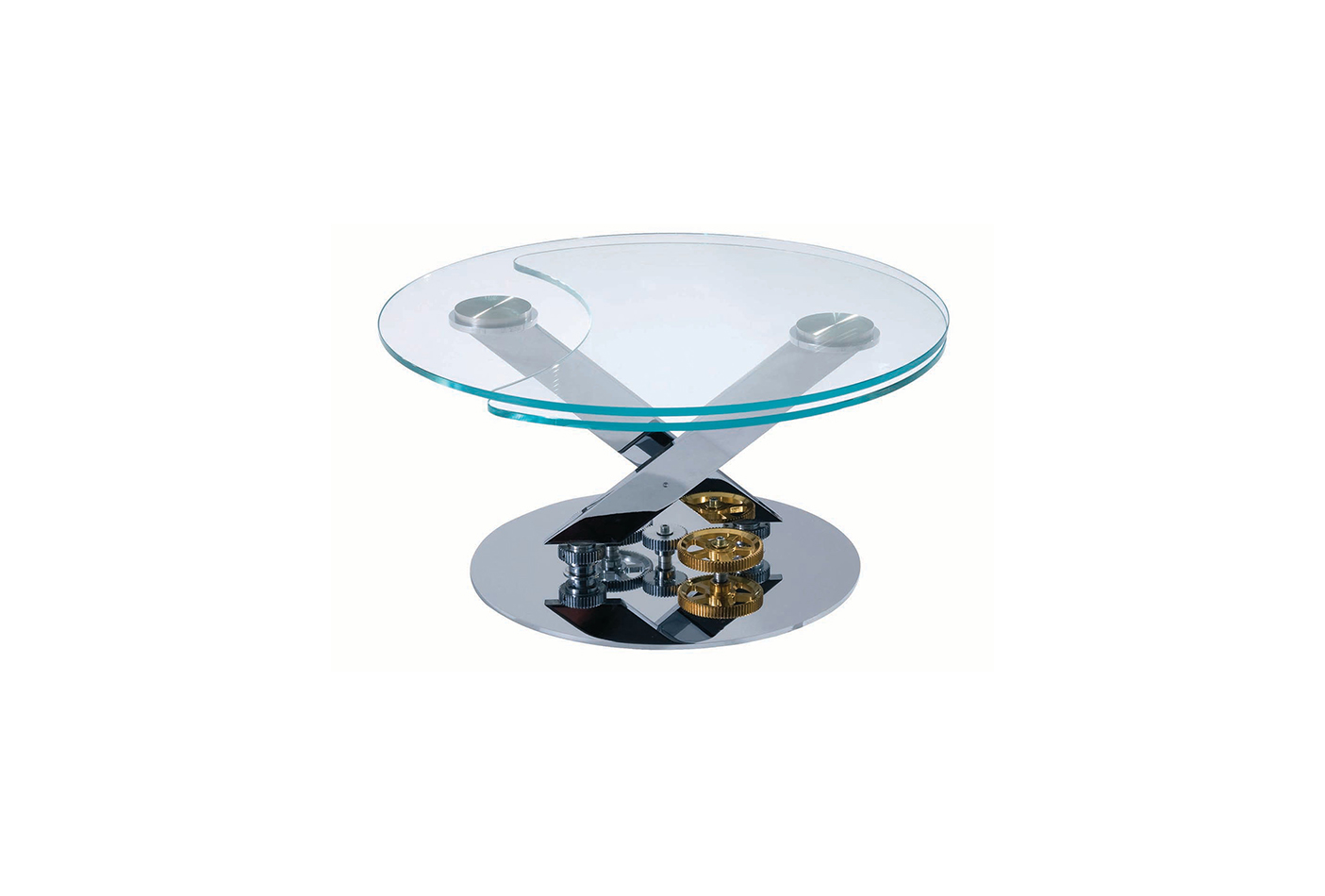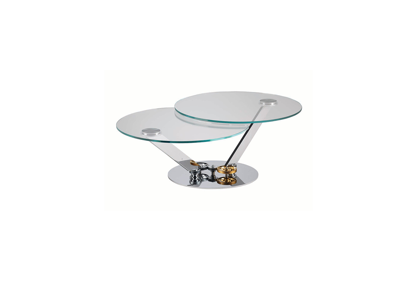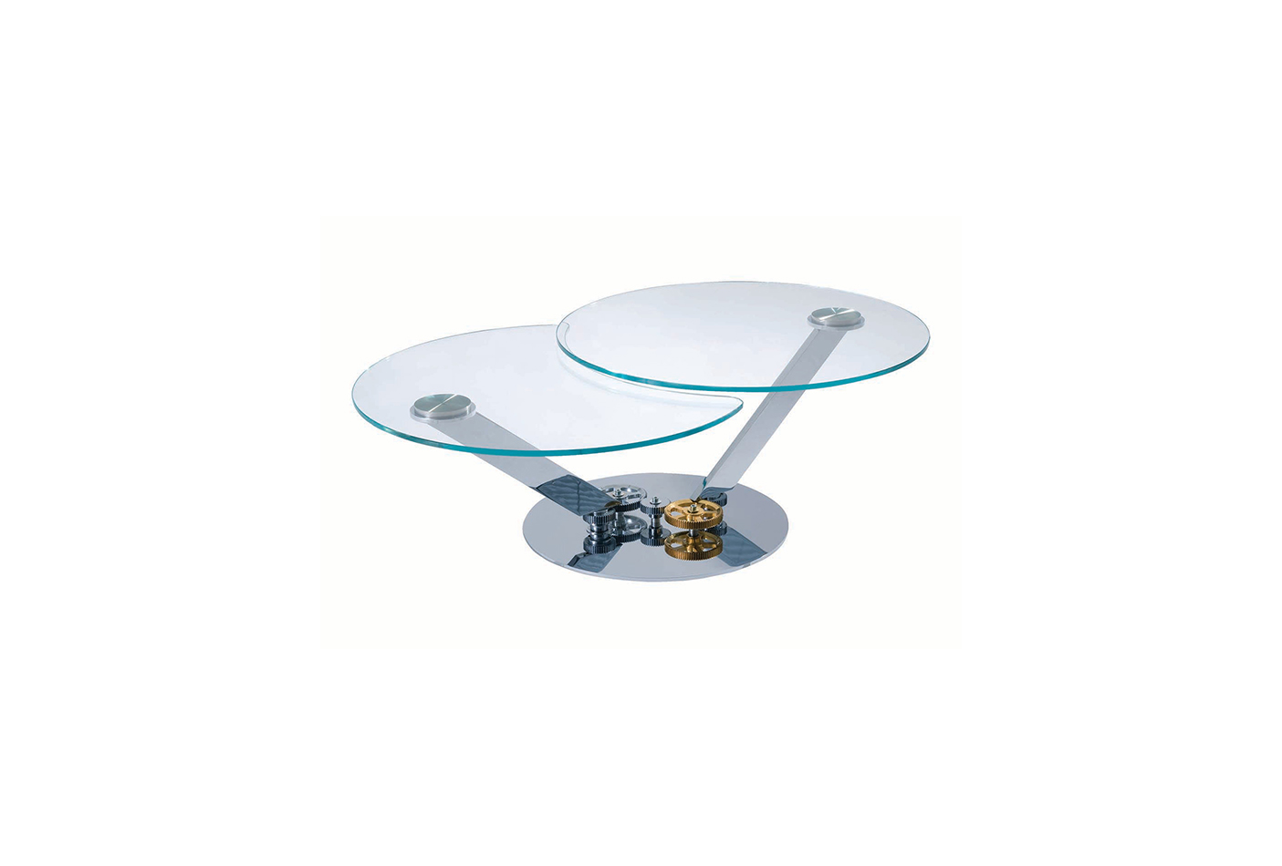 描述:鸡尾酒桌顶部有2个12毫米厚的天然玻璃或特别透明玻璃。可同步开启,含有可见的齿轮。底座和支架的表面镀铬。