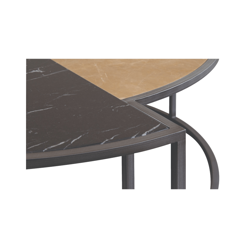 描述:茶几桌面为两个半圆的大理石盘子,金属底座有两种饰面可选。