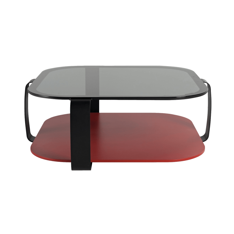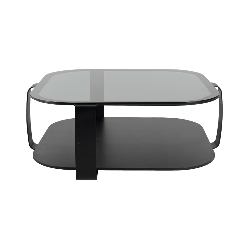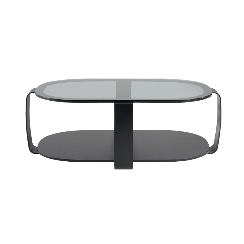 描述:茶几的上盘为烟熏玻璃,下盘为漆垫(多种颜色可选),黑漆钢结构。