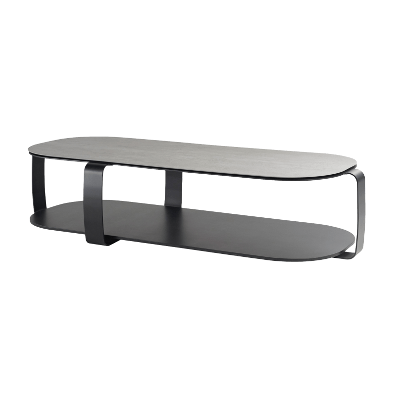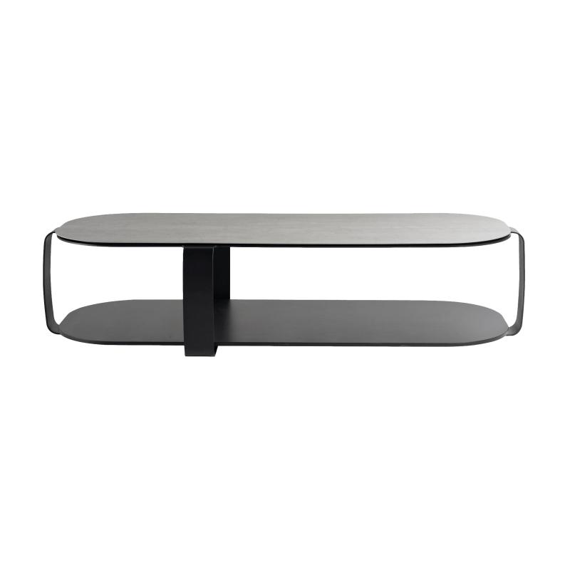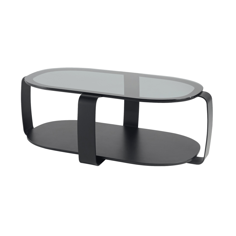描述:茶几的上盘为烟熏玻璃,下盘为漆垫(多种颜色可选),黑漆钢结构。
