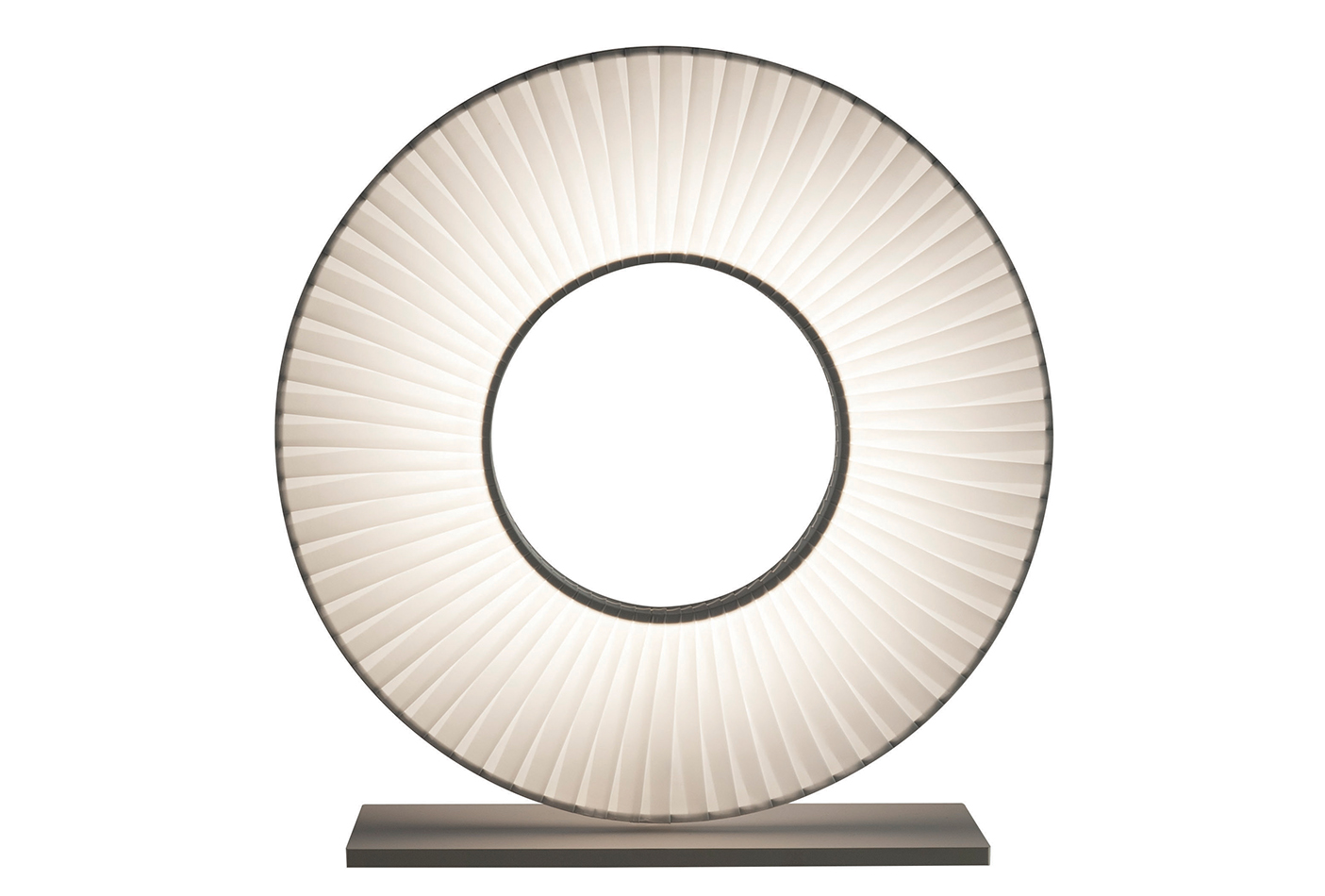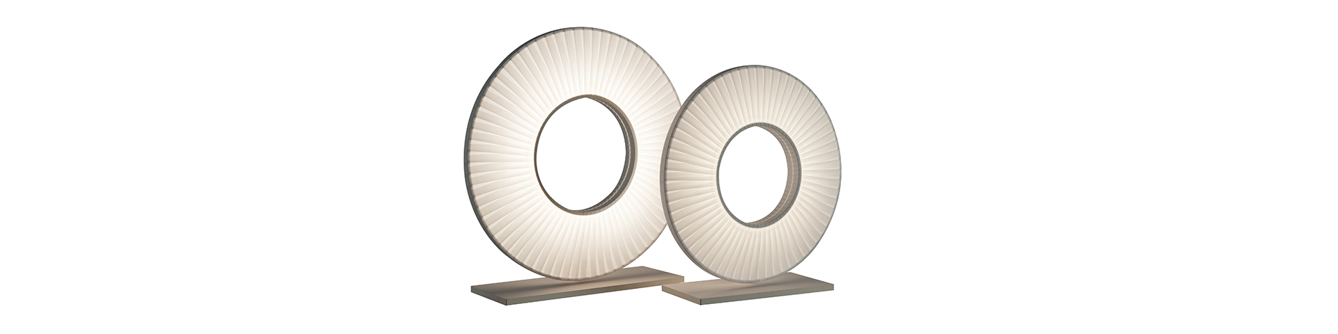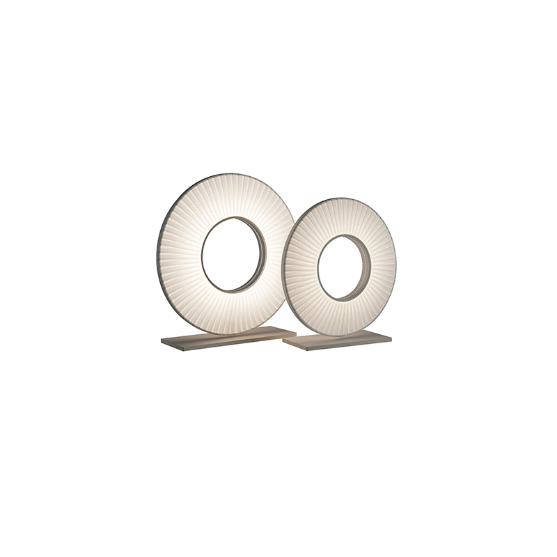 描述:这款台灯的底座为金属,灯罩为一个缠绕着白色丝带可旋转的圆环。