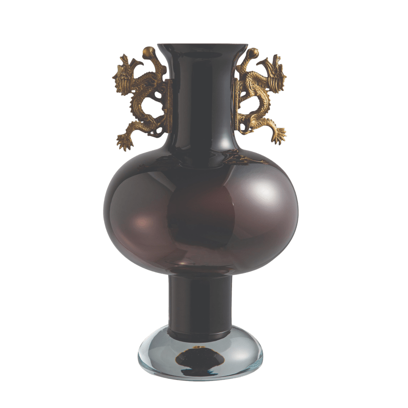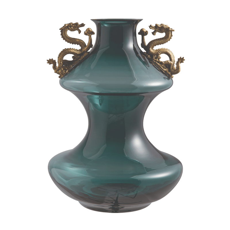 描述:玻璃花瓶,瓶口装饰着青铜制的龙头。