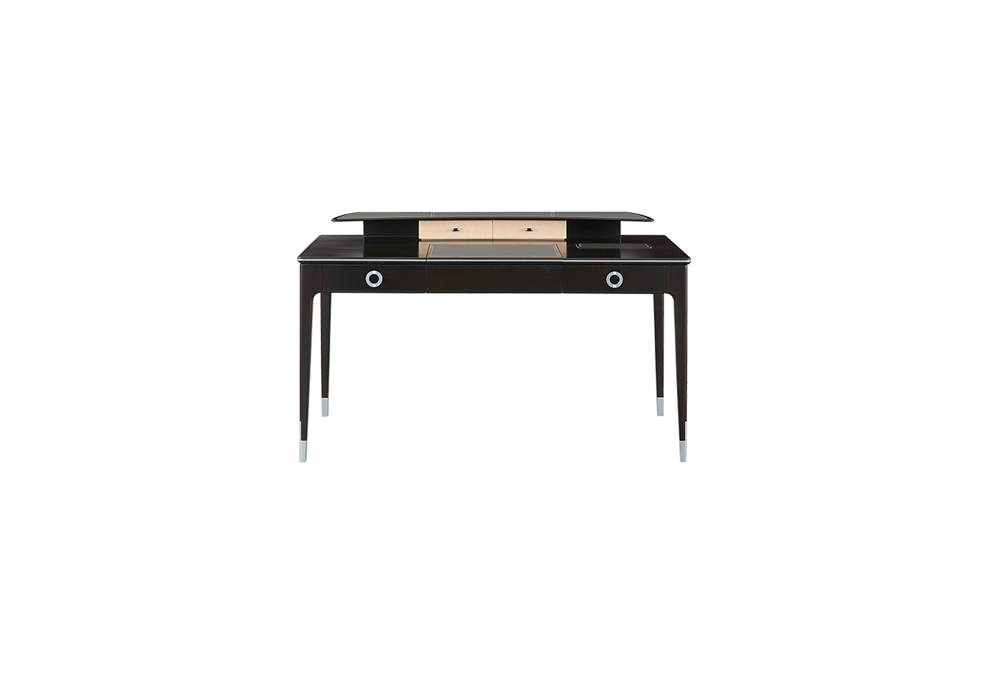 描述:4个抽屉、1个翻盖结构和抽屉面板采用樱桃木。桌面樱桃木贴面,梧桐木制成抽屉结构,采用缝制皮革装饰。多种饰面可选。