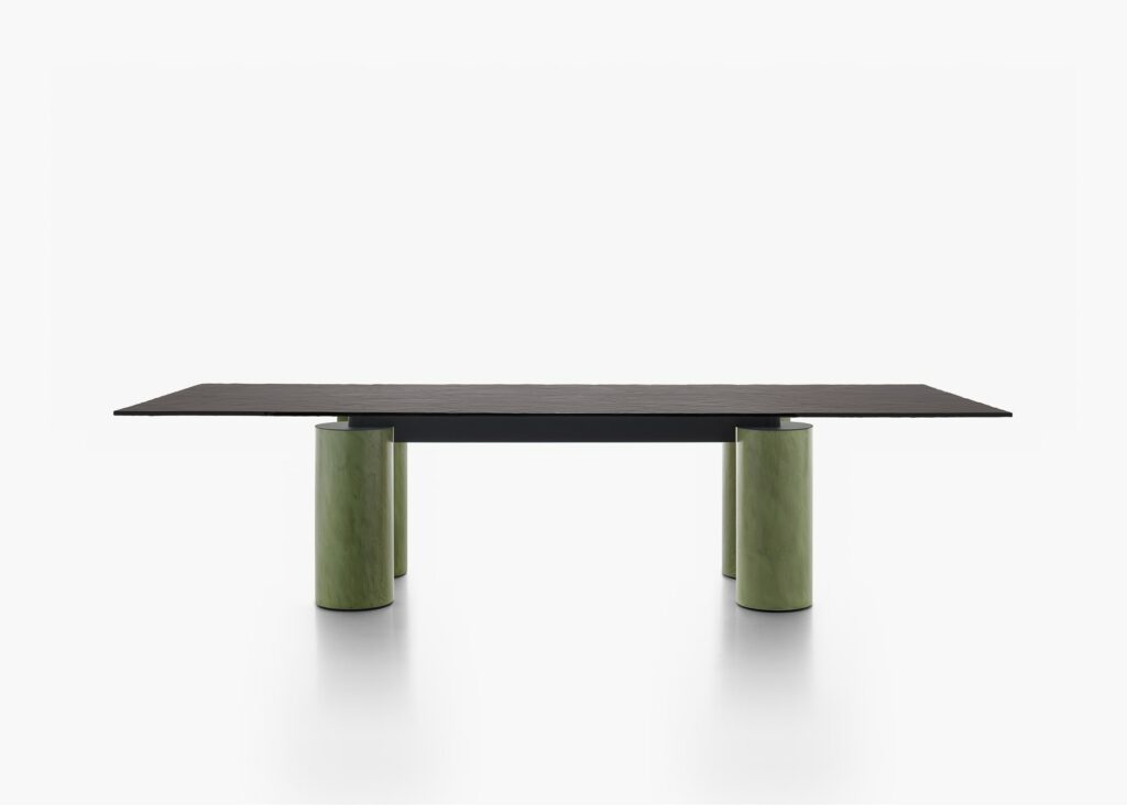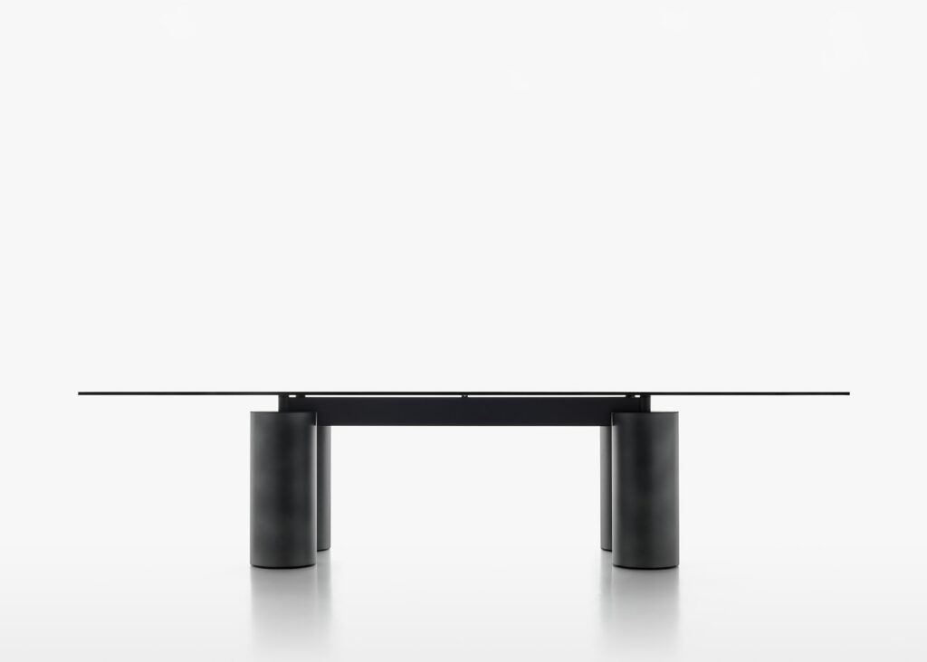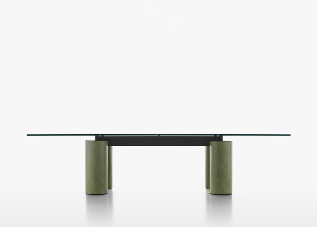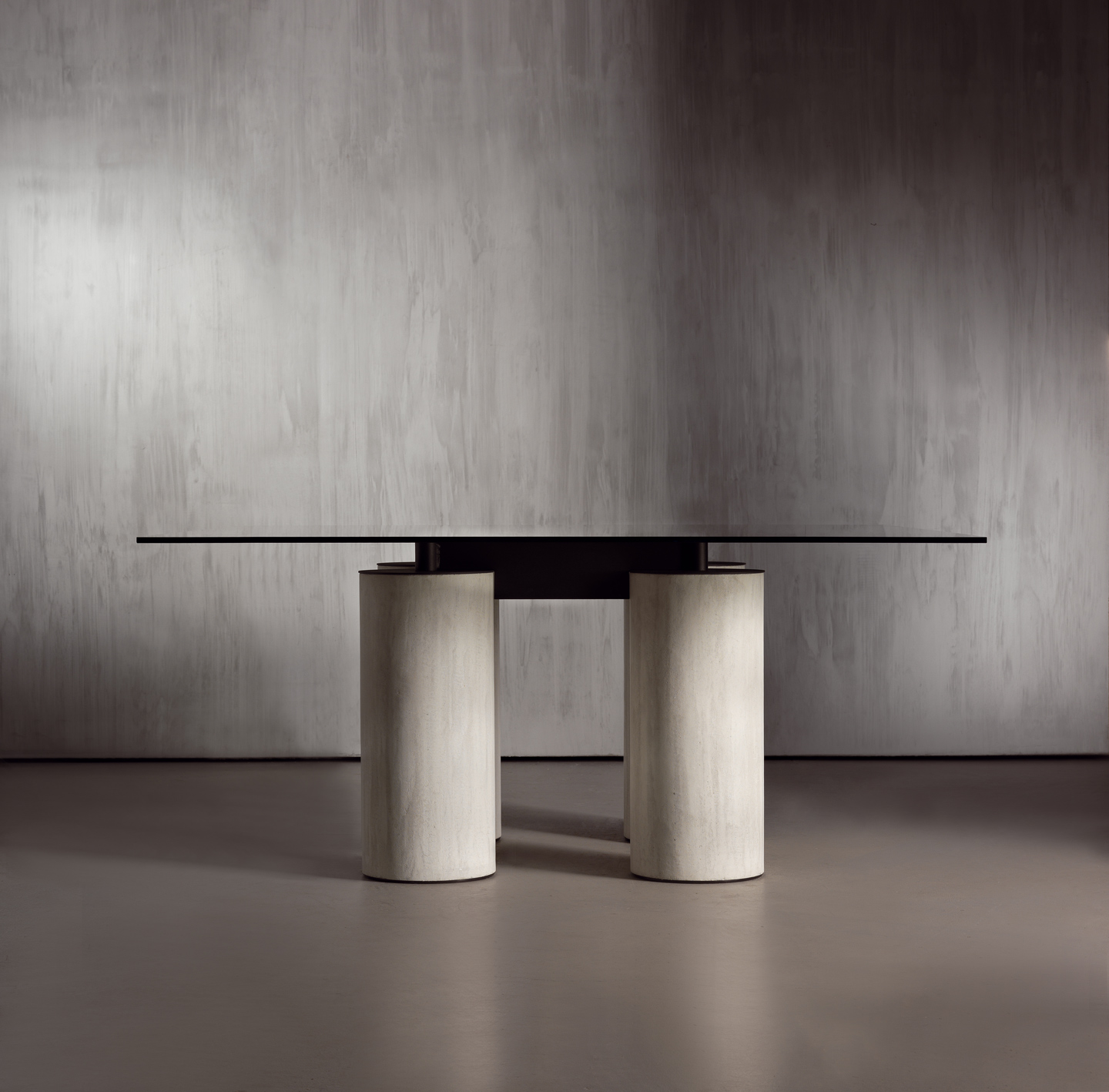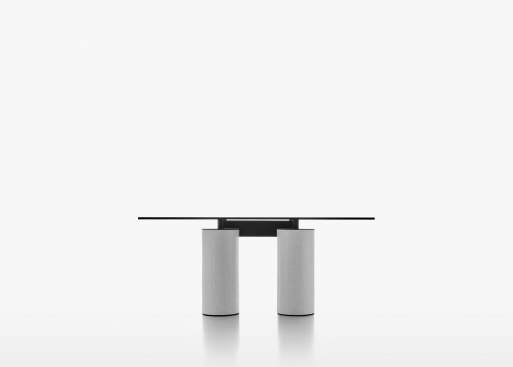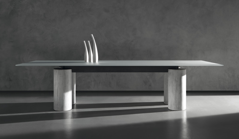 凭借其线条的精确性,Serenissimo 将桌子的概念转化为具有四根柱子和一根水平钢筋的图形组合,使桌面浮动。 与 Lella 和 Massimo Vignelli 的原创设计一致,它是通过其几何形状和材料来表达的创作。 以精致的金属饰面或柔和的威尼斯灰泥色调为特征的基本形式,以及一个长达三米的大玻璃台面——分布在祭坛底座上,赋予了巨大尺寸的和谐组合以生命。