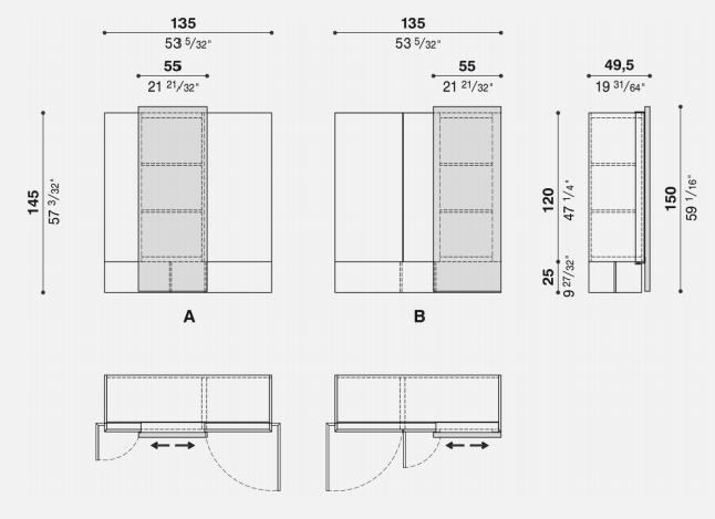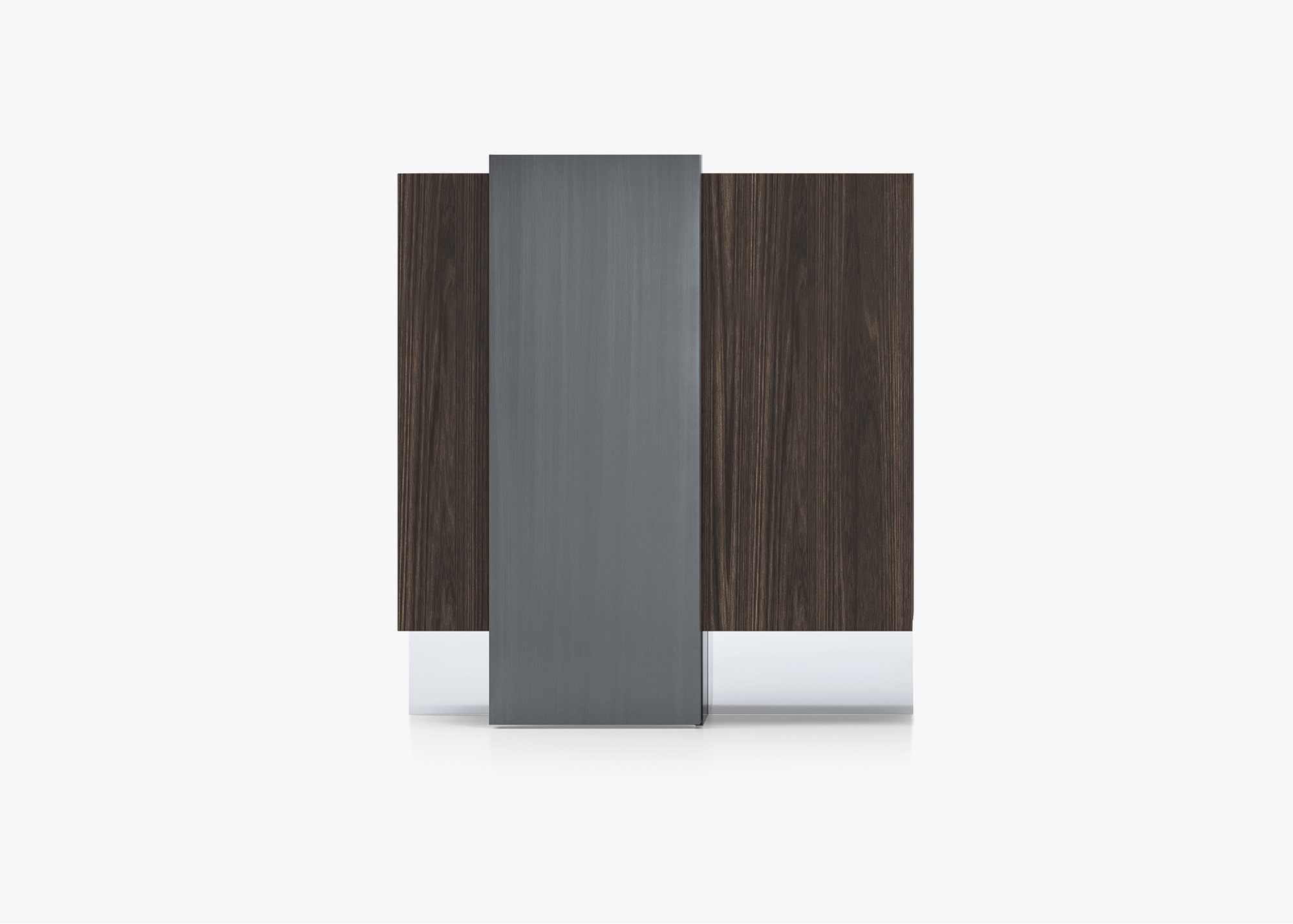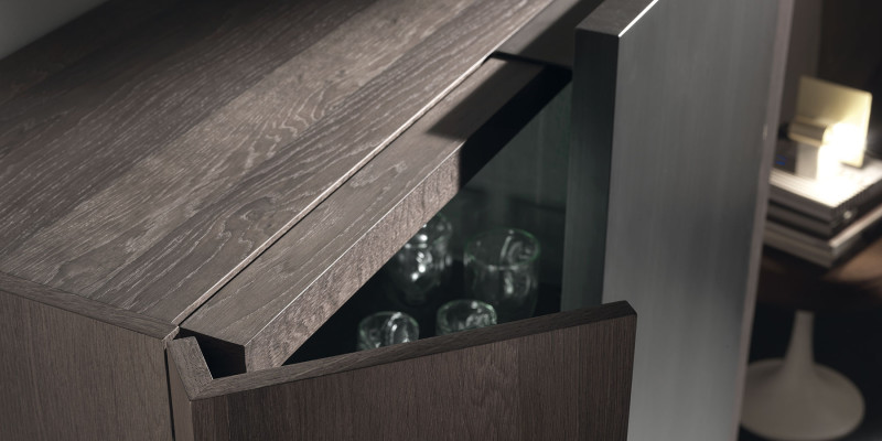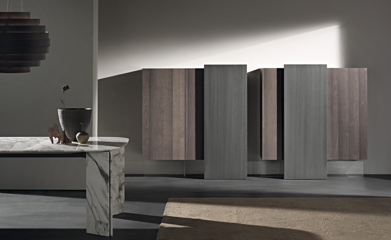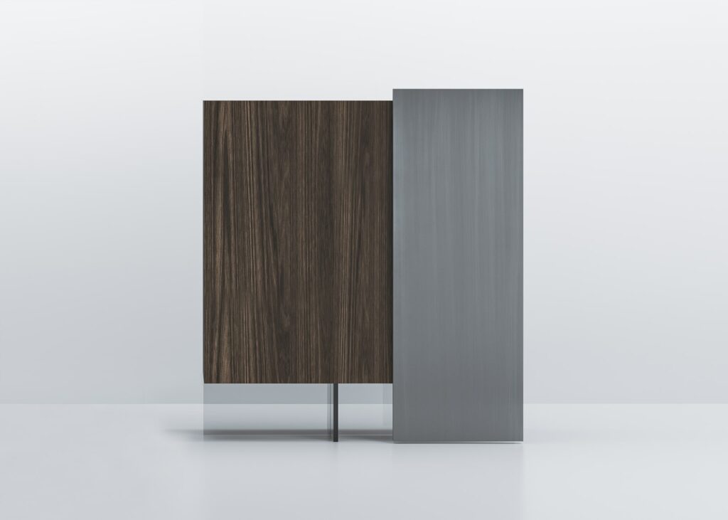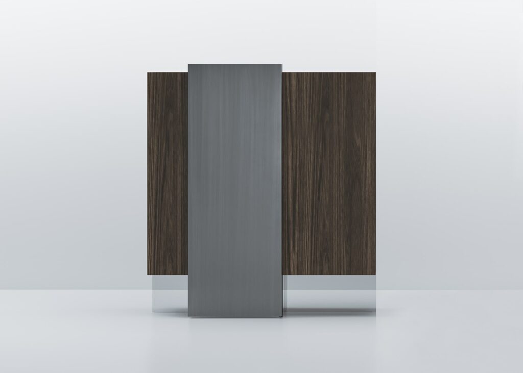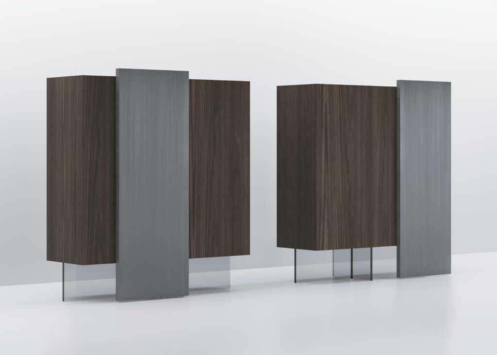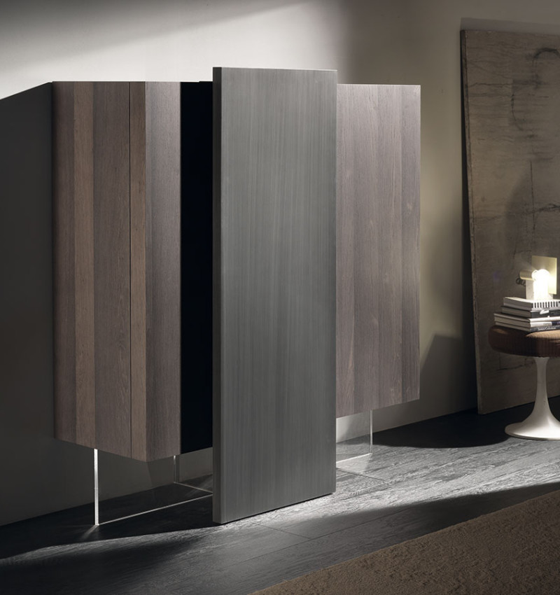 在他为 Acerbis 设计的最新作品中,Giacomo Moor 用两个 Alterego 垂直餐具柜传达了悬挂系统的幻影,这是一个创造性的杰作,这要归功于他们的两个推拉门,这似乎令人难以置信地以一种无形的透明结构支撑重量在主体之下。木材和手工拉丝金属之间的对比突出了餐具柜的手工制作个性。 两个餐具柜的尺寸相同,结构相同,但推拉门的不对称位置使它们每个都独一无二,也非常适合组合。