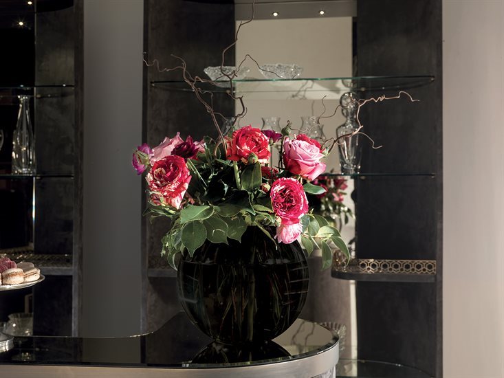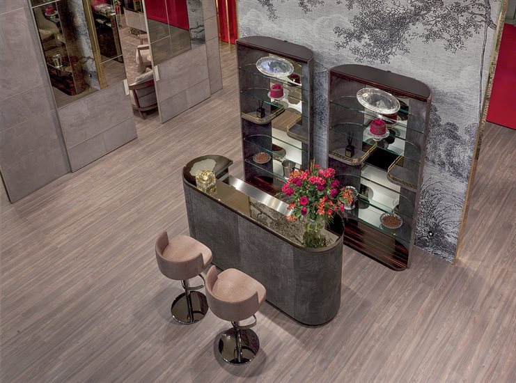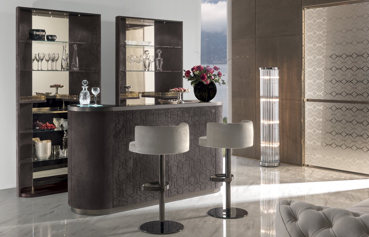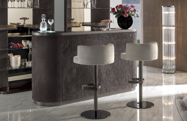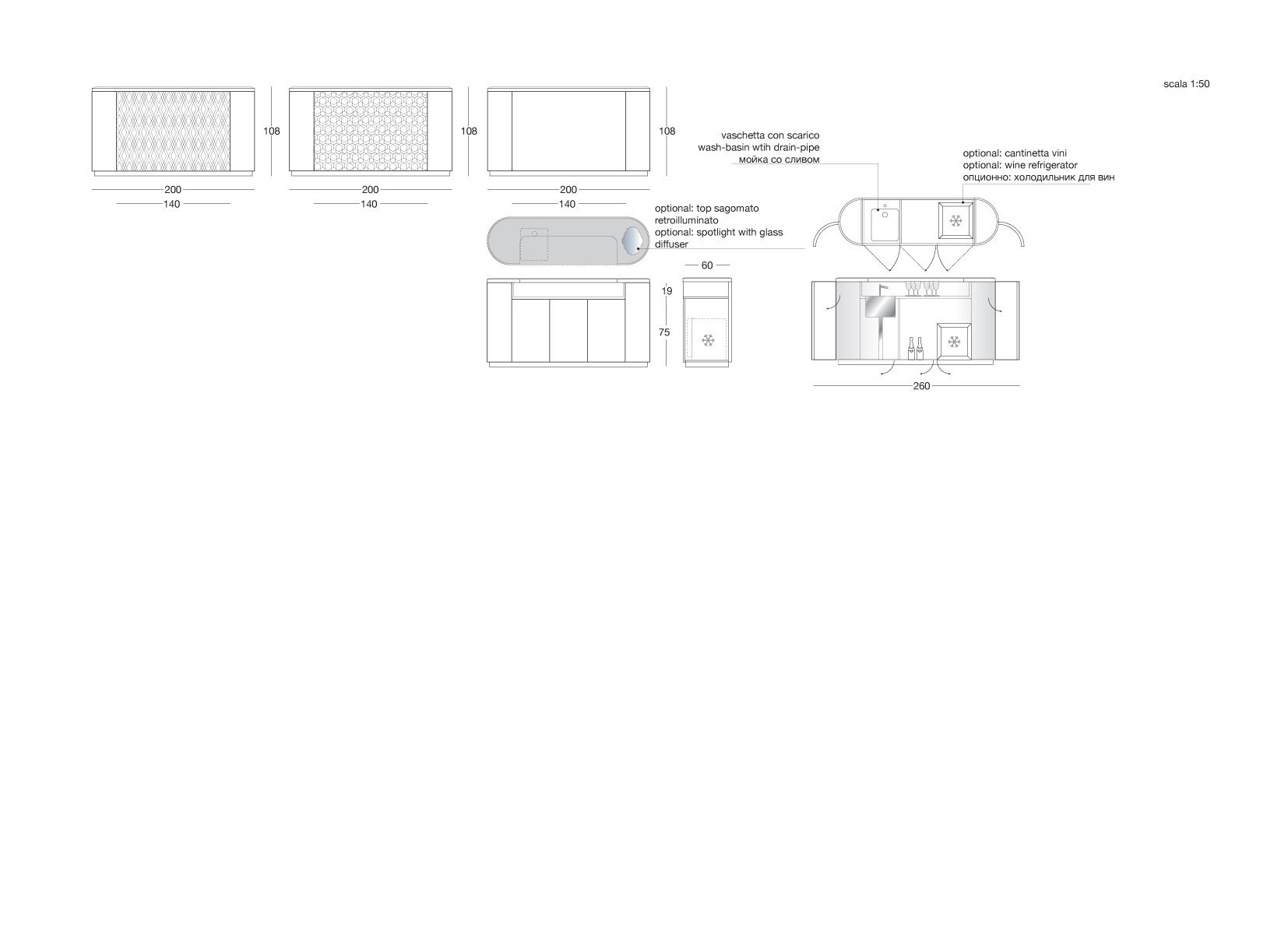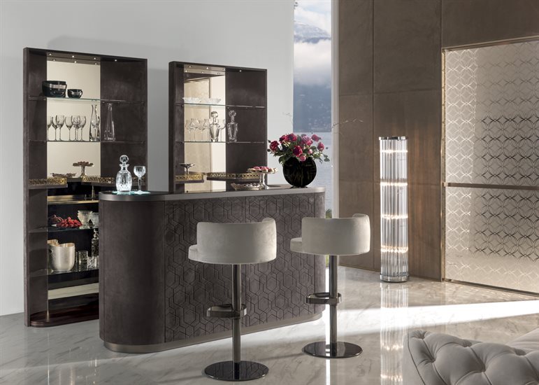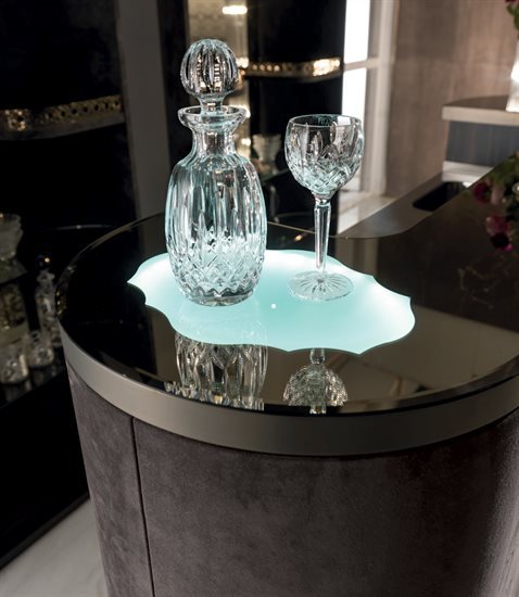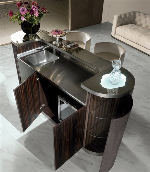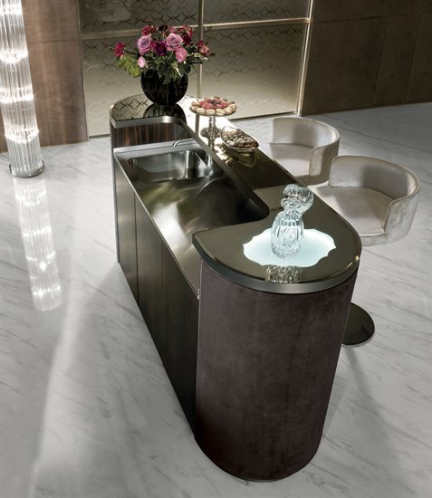 酒吧柜,磨砂钢台面带清洗槽与水龙头。另也可选无配件的完整磨砂钢台面。轮廓造型的上层台面采用带磨斜边青铜色或烟熏色5mm镜面。依要求可定制加装一个灯源照明搭配磨砂玻璃。