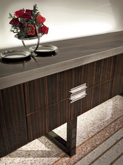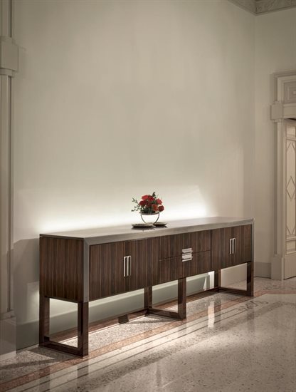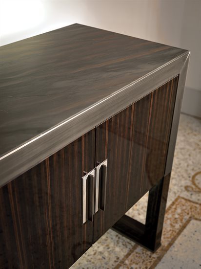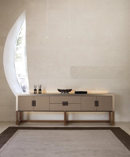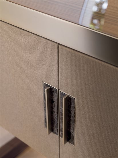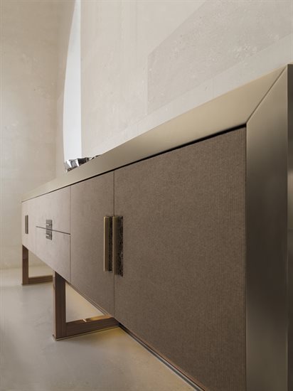 收纳矮柜,带柜门与抽屉,木质柜脚与结构可选:亮光烤漆(颜色依样本挑選)、亮光∕哑光黑檀木、亮光∕哑光卡纳莱托核桃木、亮光∕哑光西克莫槭木。抽屉正面面板可依样本挑选皮料或Loro Piana Interiors开士米羊绒覆面,或与结构相同的木质。金属材质的底座与正面边框以磨削工艺制成,饰面可选:黑玫瑰金、亮光浅金、亮光渐变棕、哑光香槟金、亮光镀铬、亮光镀黑铬、哑光缎面青铜、亮光玫瑰金、哑光玫瑰金。台面可选:磨斜边20mm青铜色或烟熏色镜面、磨斜边20mm黑色涂漆水晶、亮光烤漆(颜色依样本挑選)、亮光∕哑光黑檀木、亮光∕哑光卡纳莱托核桃木、亮光∕哑光西克莫槭木、Sahara Noir大理石(聚酯面漆)、Dover White大理石、Panda White大理石、Verde Guatemala大理石、Corteccia大理石、Port Saint Laurent大理石、Rosso Levanto大理石、Bardiglio Nuvolato大理石、Elegant Brown大理石、Palissandro Oniciato大理石、Emperador Dark大理石、Silver Wave大理石、Agatha Black大理石、Frappuccino大理石、Calacatta Gold大理石、Fusion Light大理石、Patagonia大理石、Explosion Blu大理石、Fusion Multicolor大理石、Quarzo Juliet大理石。把手的大理石,可依样本挑选或与台面相同。选购品:背后可加装两条可调光的led灯条,分别照亮柜子的上方与下方。照明灯源通过碰触开关控制。墙面将获得灯带照明的效果。