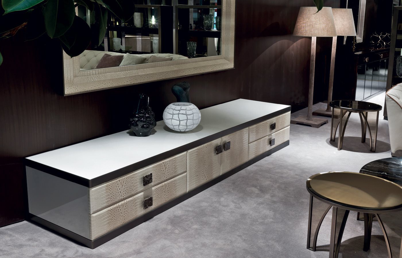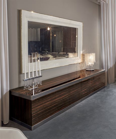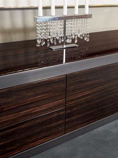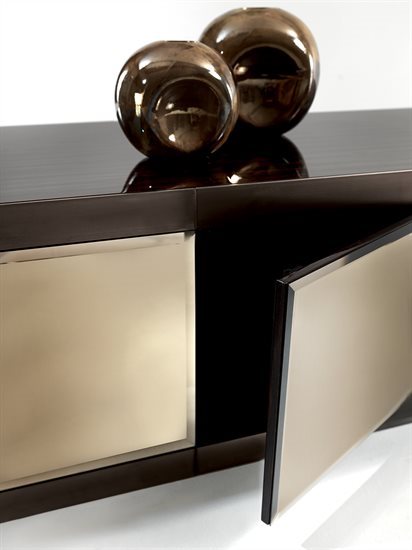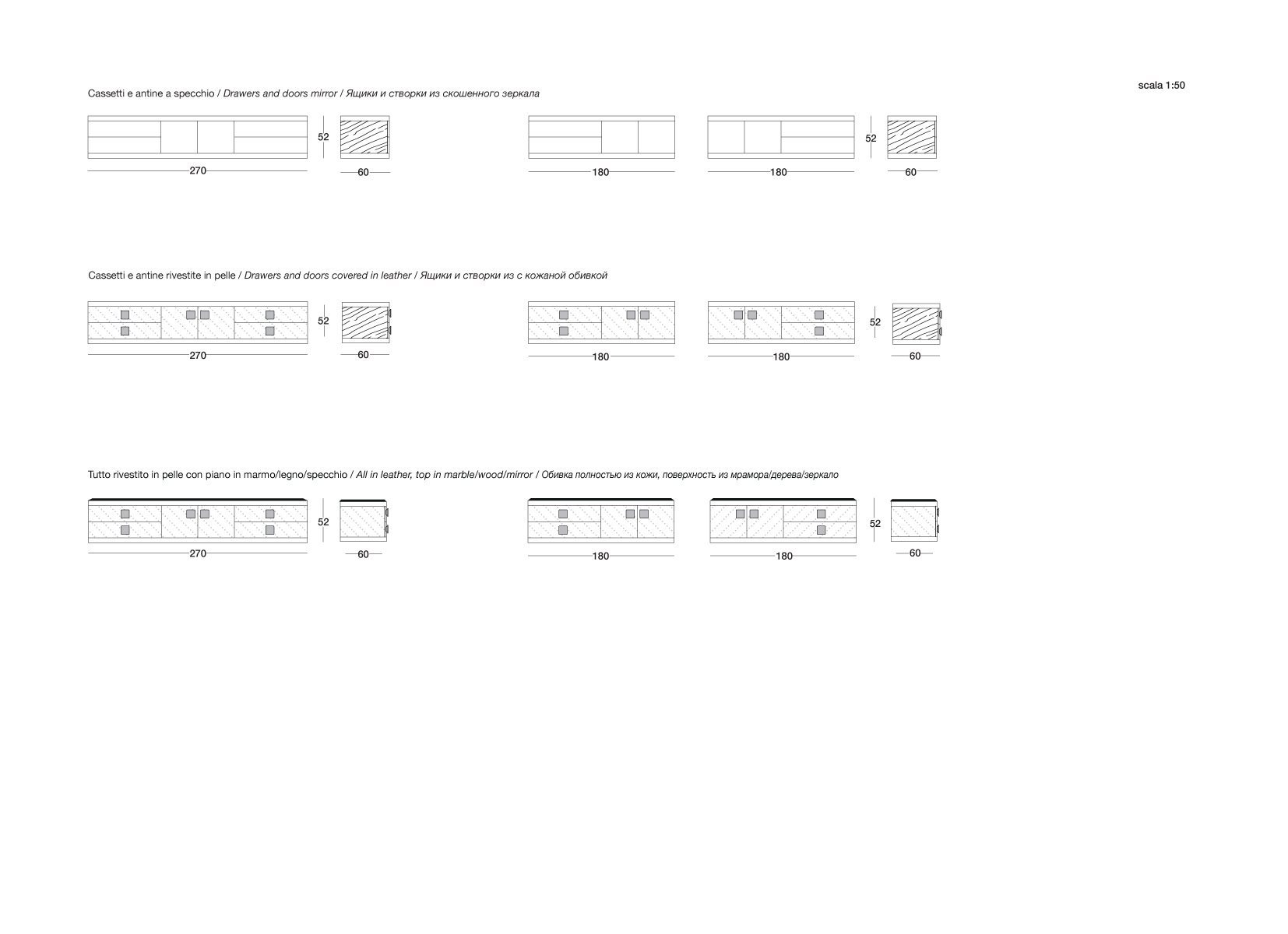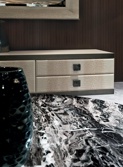 金属边框采用磨削工艺制成,饰面可选:黑玫瑰金、亮光浅金、亮光渐变棕、哑光香槟金、亮光镀铬、亮光镀黑铬、哑光缎面青铜。木质可选:亮光烤漆(颜色依样本挑選)、亮光∕哑光黑檀木、亮光∕哑光卡纳莱托核桃木、亮光∕哑光西克莫槭木、青铜色或烟熏色磨斜边镜面。大理石:Sahara Noir大理石(聚酯面漆)、Dover White大理石、Panda White大理石、Verde Guatemala大理石、Corteccia大理石、Port Saint Laurent大理石、Rosso Levanto大理石、Bardiglio Nuvolato大理石、Elegant Brown大理石、Palissandro Oniciato大理石、Emperador Dark大理石、Silver Wave大理石、Agatha Black大理石、Frappuccino大理石、Calacatta Gold大理石、Fusion Light大理石、Patagonia大理石、Explosion Blu大理石、Fusion Multicolor大理石、Quarzo Juliet大理石、Calcite Azul大理石。皮料覆面版本带大理石把手,而镜面版本搭配按压式开启机制。