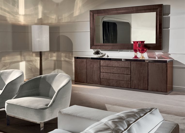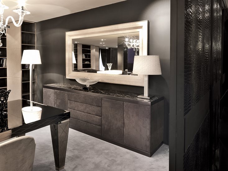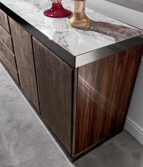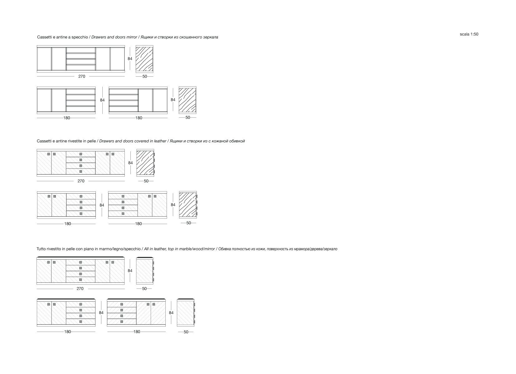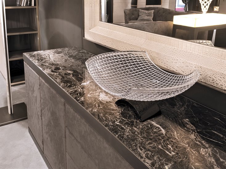 金属边框采用磨削工艺制成,饰面可选:黑玫瑰金、亮光浅金、亮光渐变棕、哑光香槟金、亮光镀铬、亮光镀黑铬、哑光缎面青铜。木质可选:亮光烤漆(颜色依样本挑選)、亮光∕哑光黑檀木、亮光∕哑光卡纳莱托核桃木、亮光∕哑光西克莫槭木、青铜色或烟熏色磨斜边镜面。大理石:Sahara Noir大理石(聚酯面漆)、Dover White大理石、Panda White大理石、Verde Guatemala大理石、Corteccia大理石、Port Saint Laurent大理石、Rosso Levanto大理石、Bardiglio Nuvolato大理石、Elegant Brown大理石、Palissandro Oniciato大理石、Emperador Dark大理石、Silver Wave大理石、Agatha Black大理石、Frappuccino大理石、Calacatta Gold大理石、Fusion Light大理石、Patagonia大理石、Explosion Blu大理石、Fusion Multicolor大理石、Quarzo Juliet大理石、Calcite Azul大理石。皮料覆面版本带大理石把手,而镜面版本搭配按压式开启机制。