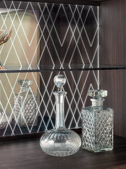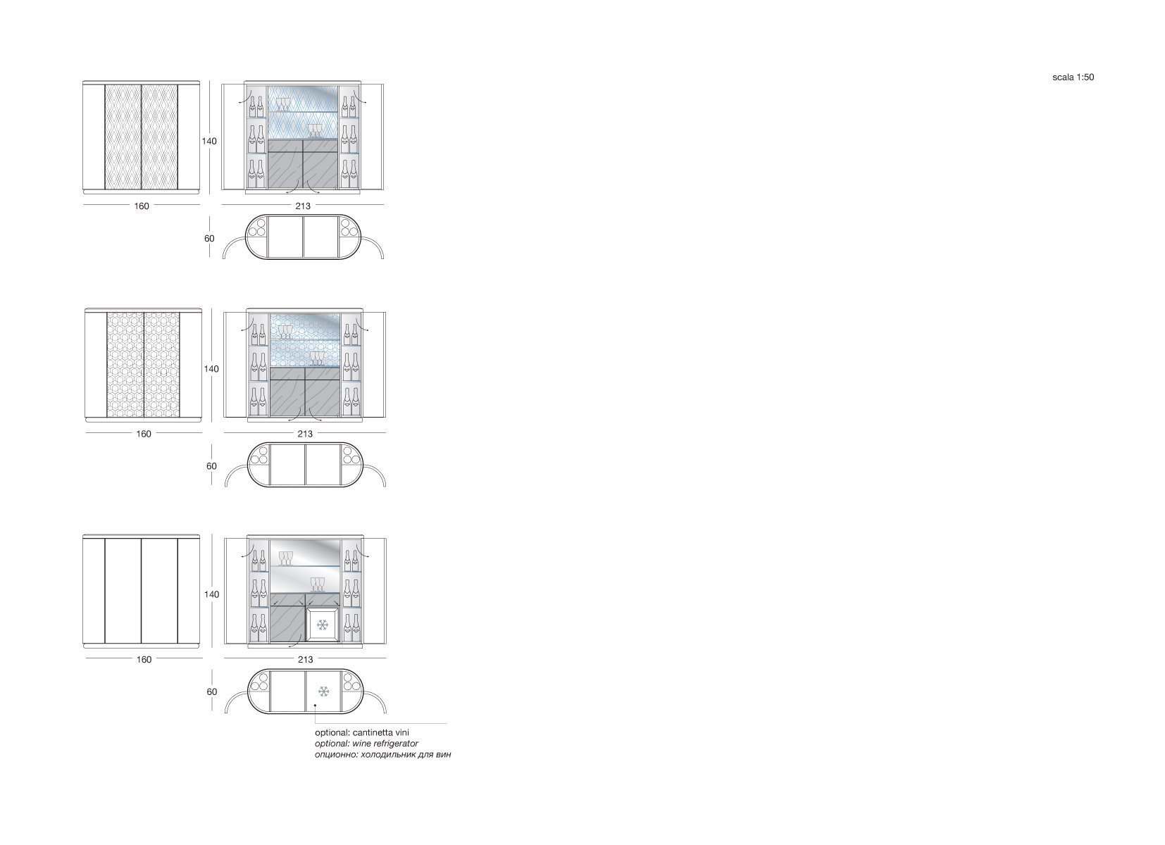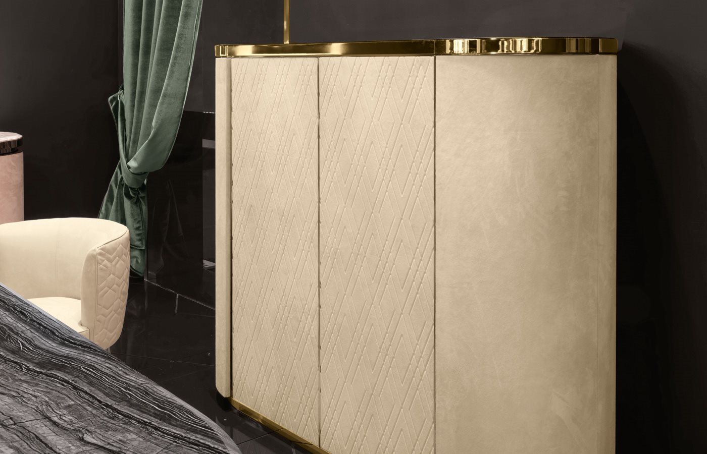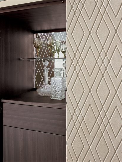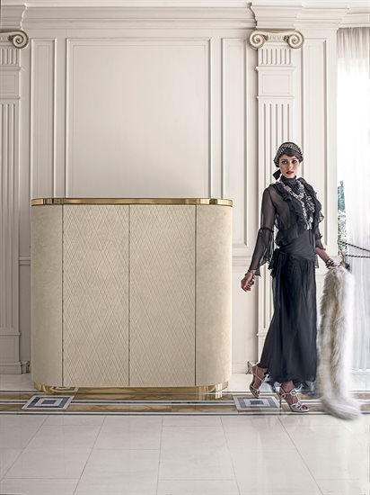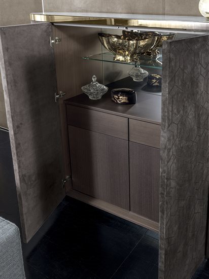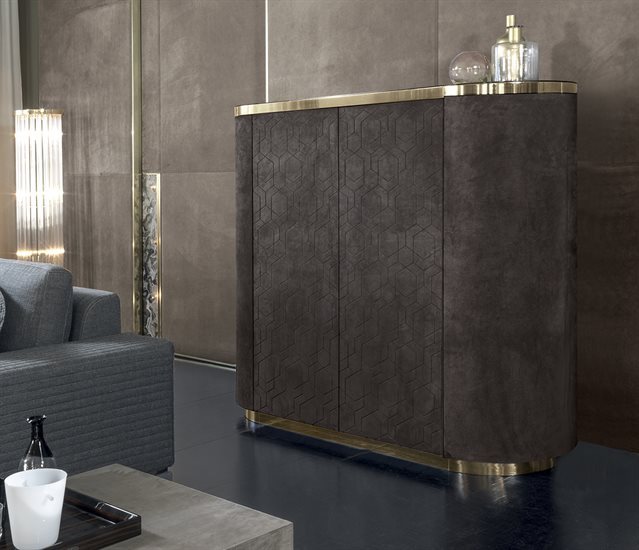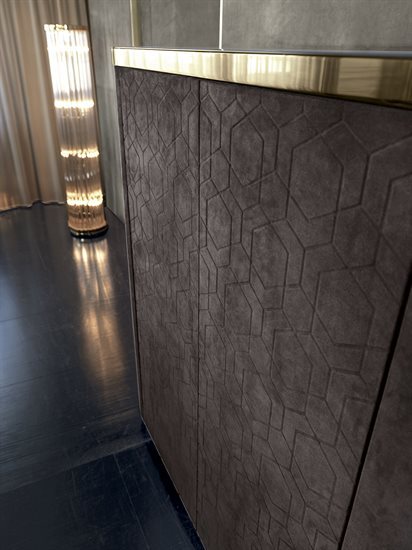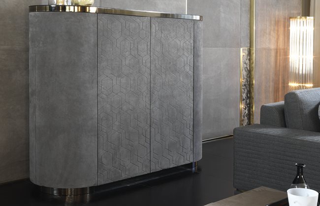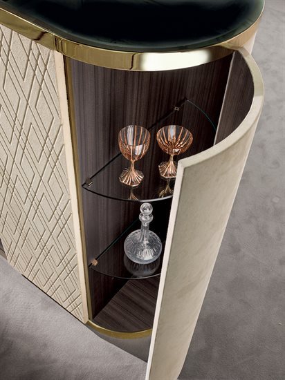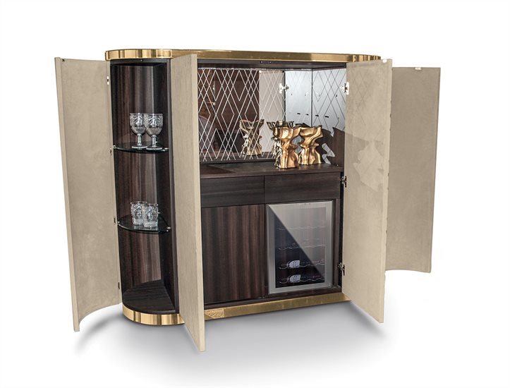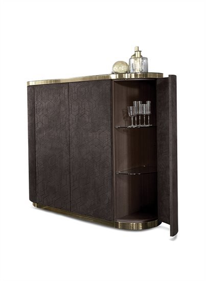 酒吧柜,完全皮料或Loro Piana Interiors开士米羊绒覆面,覆面依样本挑选。内侧采用染暗色斑马木饰面,透明玻璃层板,镜面背板搭配带照明的激光雕刻装饰纹,两格抽屉,以及依要求可定制加装一个迷你储酒冰柜。门板仅推出P.3类Suede与Lusso皮料制成3D效果「Diamond」或「Sequence」浮雕装饰纹覆面。上方台面的饰面可选:磨斜边青铜色或烟熏色5mm镜面。金属底座与边框采用磨削工艺制成,饰面可选:黑玫瑰金、亮光浅金、亮光渐变棕、哑光香槟金、亮光镀铬、亮光镀黑铬、哑光缎面青铜、亮光玫瑰金、哑光玫瑰金。