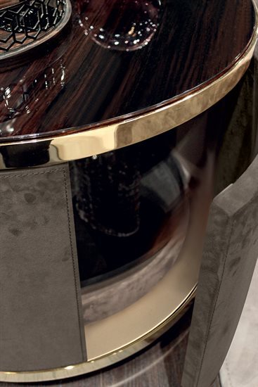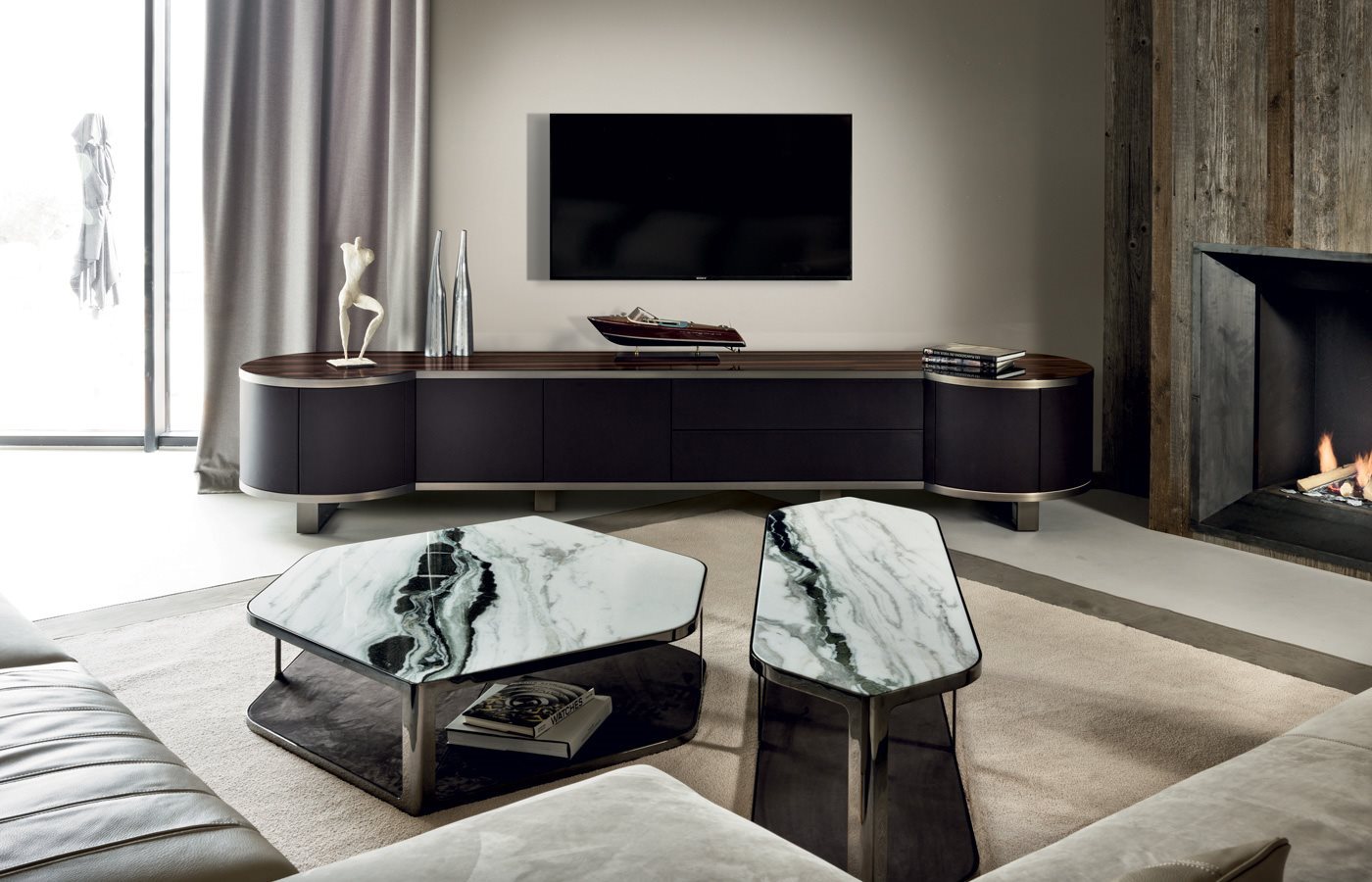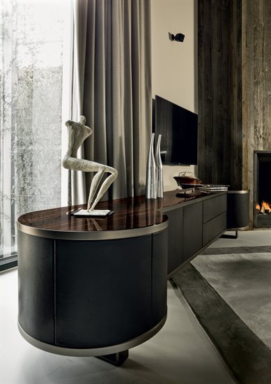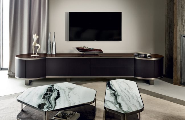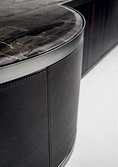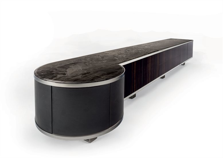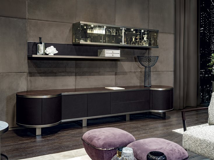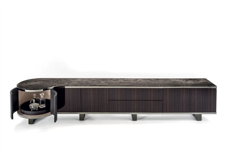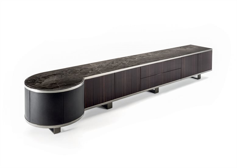 客厅柜带柜门与抽屉,结构可选皮料覆面(依样本挑選)选或木质。木质面饰可选:亮光∕哑光黑檀木、亮光∕哑光西克莫槭木、亮光∕哑光卡纳莱托核桃木、亮光胡桃木树榴。金属边框采用磨削工艺制成,饰面可选:黑玫瑰金、亮光玫瑰金、哑光玫瑰金、亮光浅金、亮光渐变棕、哑光香槟金、亮光镀铬、亮光镀黑铬、哑光缎面青铜。终端圆弧元素的结构仅提供皮料覆面的版本,皮料依样本挑選。台面可选:青铜色或烟熏色镜面,Sahara Noir大理石(聚酯面漆)、Dover White大理石、Panda White大理石、Verde Guatemala大理石、Corteccia大理石、Port Saint Laurent大理石、Rosso Levanto大理石、Bardiglio Nuvolato大理石、Elegant Brown大理石、Palissandro Oniciato大理石、Emperador Dark大理石、Silver Wave大理石、Agatha Black大理石、Frappuccino大理石、Calacatta Gold大理石、Fusion Light大理石、Patagonia大理石、Explosion Blu大理石、Fusion Multicolor大理石、Quarzo Juliet大理石。或者木质版本。