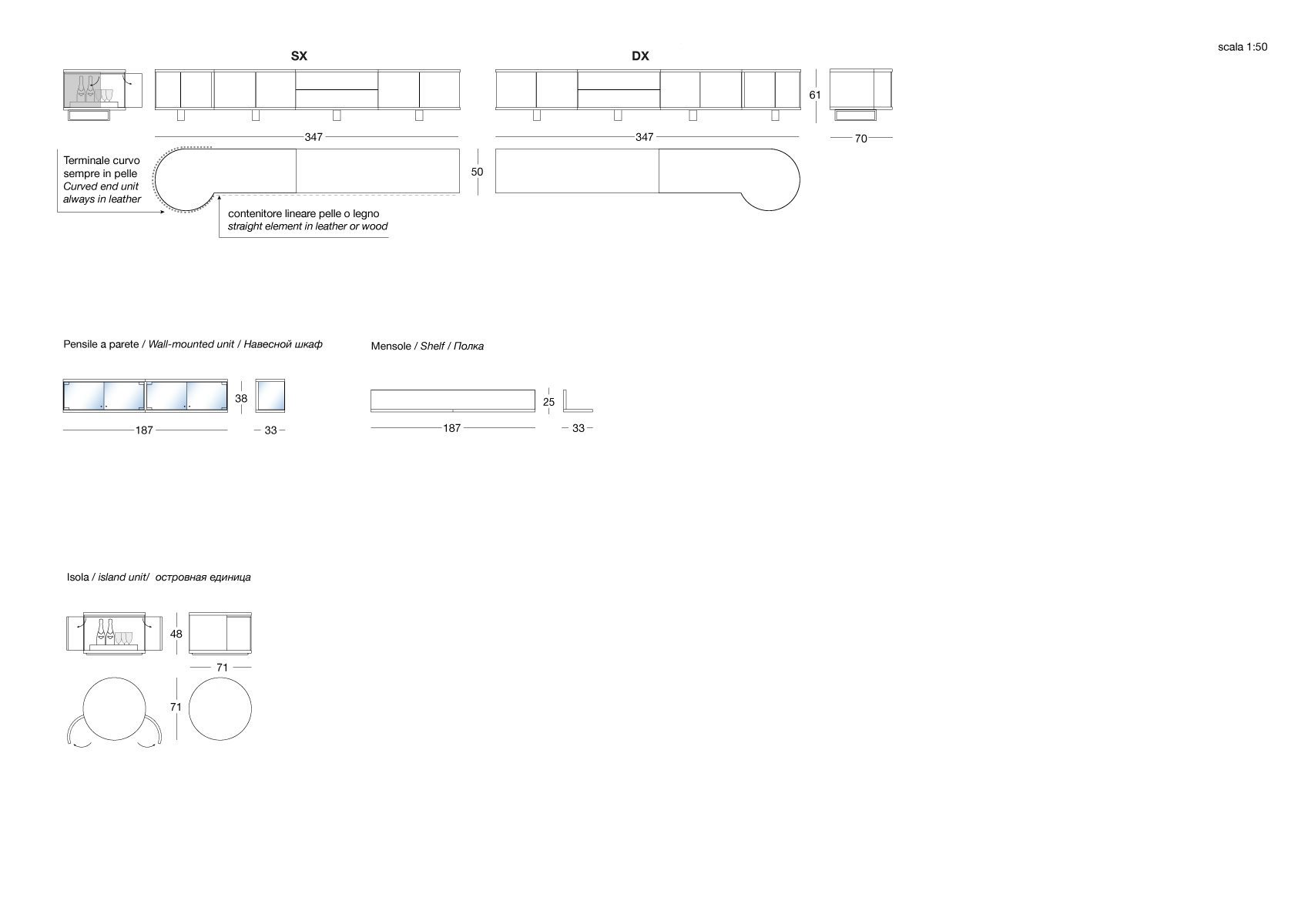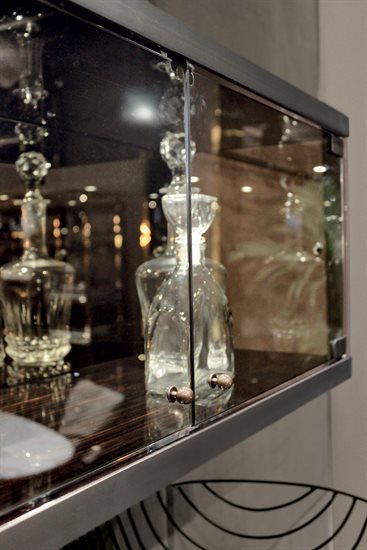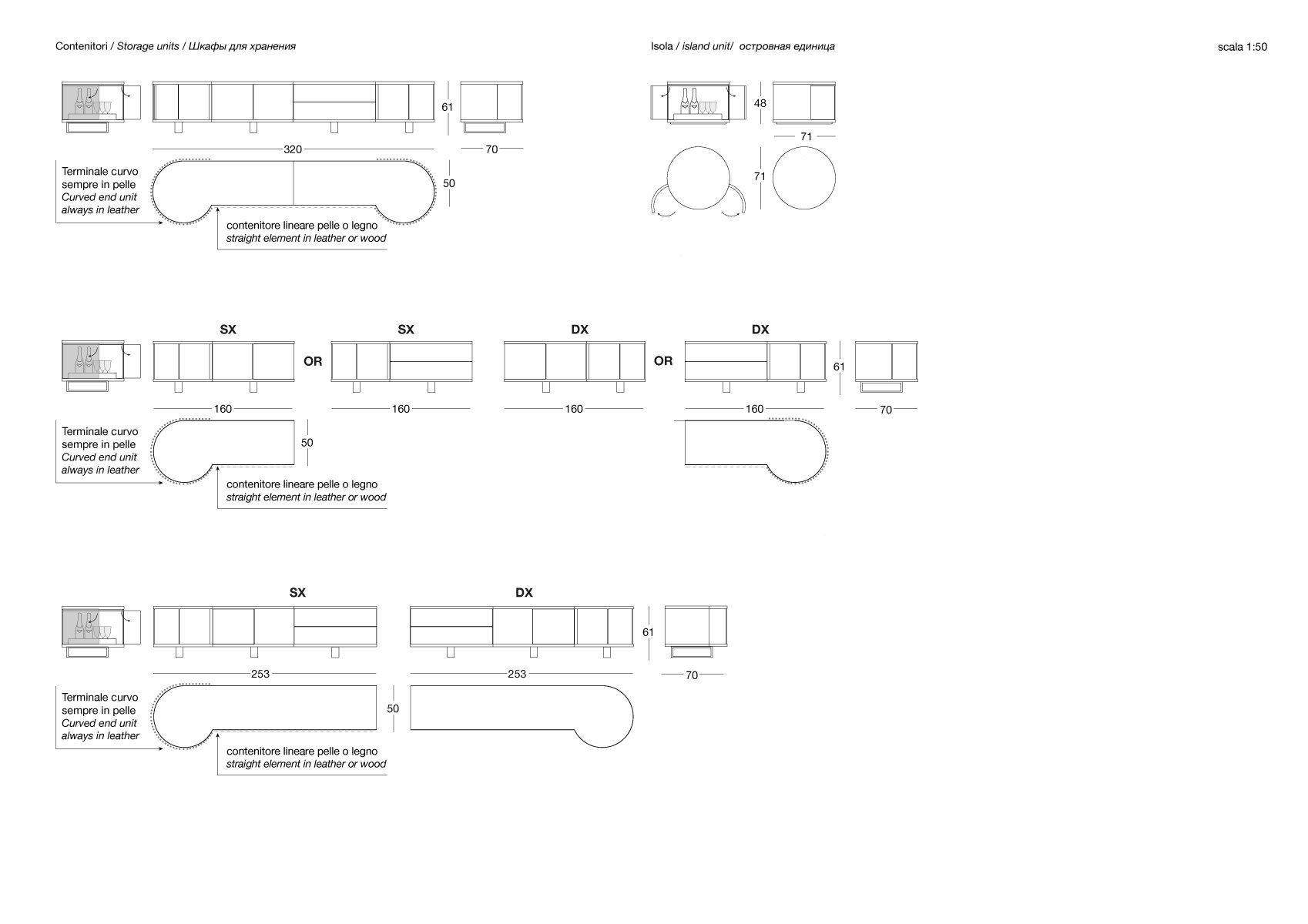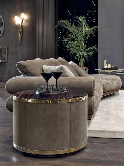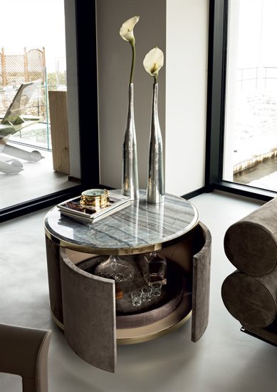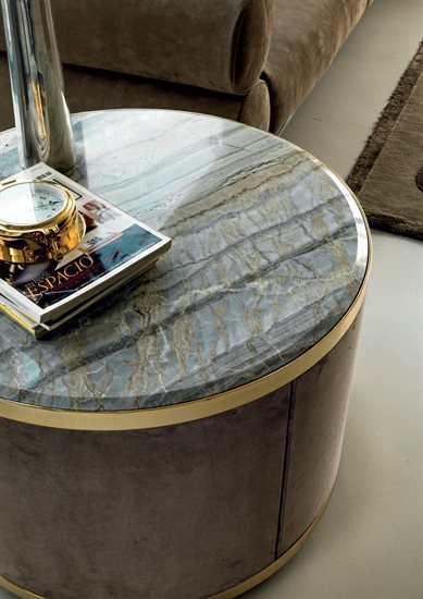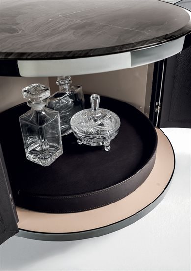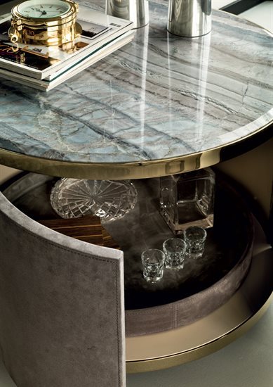 客厅柜带柜门与抽屉,结构可选皮料覆面(依样本挑選)选或木质。木质面饰可选:亮光∕哑光黑檀木、亮光∕哑光西克莫槭木、亮光∕哑光卡纳莱托核桃木、亮光胡桃木树榴。金属边框采用磨削工艺制成,饰面可选:黑玫瑰金、亮光玫瑰金、哑光玫瑰金、亮光浅金、亮光渐变棕、哑光香槟金、亮光镀铬、亮光镀黑铬、哑光缎面青铜。终端圆弧元素的结构仅提供皮料覆面的版本,皮料依样本挑選。台面可选:青铜色或烟熏色镜面,Sahara Noir大理石(聚酯面漆)、Dover White大理石、Panda White大理石、Verde Guatemala大理石、Corteccia大理石、Port Saint Laurent大理石、Rosso Levanto大理石、Bardiglio Nuvolato大理石、Elegant Brown大理石、Palissandro Oniciato大理石、Emperador Dark大理石、Silver Wave大理石、Agatha Black大理石、Frappuccino大理石、Calacatta Gold大理石、Fusion Light大理石、Patagonia大理石、Explosion Blu大理石、Fusion Multicolor大理石、Quarzo Juliet大理石。或者木质版本。