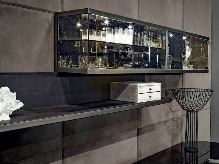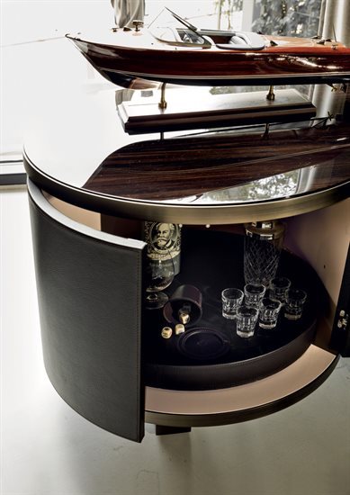 按压式柜门,内部漆饰哑光青铜色。底座金属柜脚,金属漆饰青铜色。终端圆弧元素与岛柜的内侧,采用亮光蜜粉色烤漆,配备旋转托盘与自动点亮的led灯照明。托盘皮料覆面可依样本挑选(与结构搭配成套)。