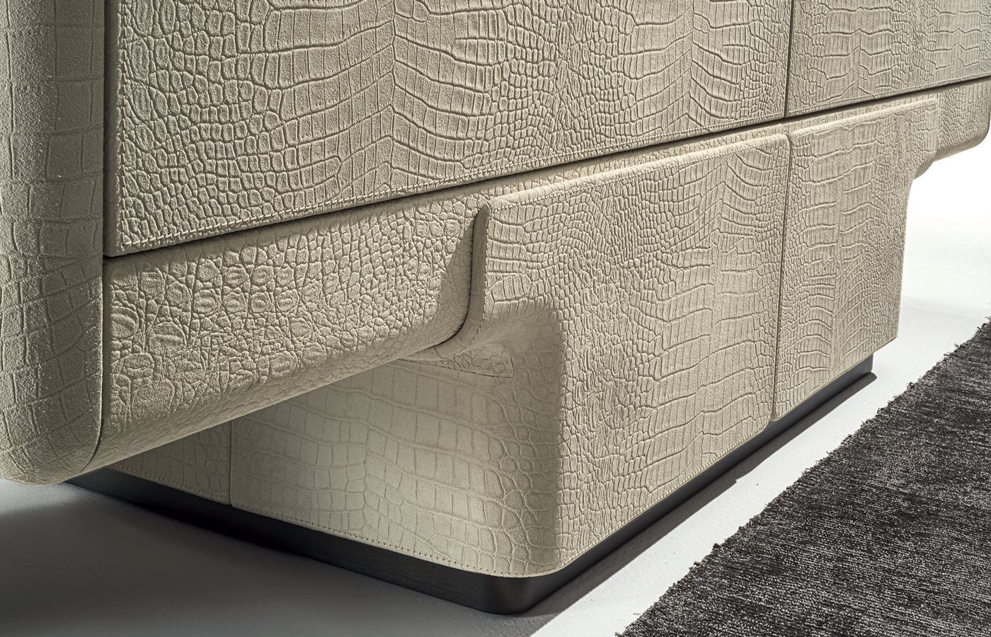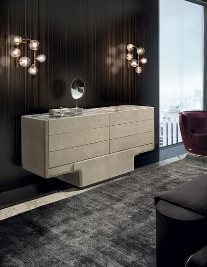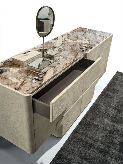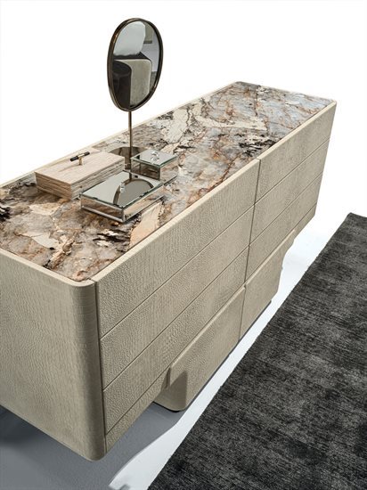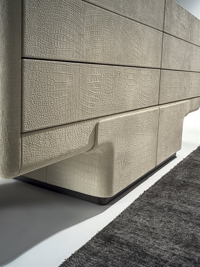 四斗柜。柜脚与结构可依样本挑选皮料或Loro Piana Interiors开士米羊绒覆面,或可选木质:亮光烤漆(颜色依样本挑选)、亮光∕哑光黑檀木、亮光∕哑光卡纳莱托核桃木、亮光∕哑光西克莫槭木。