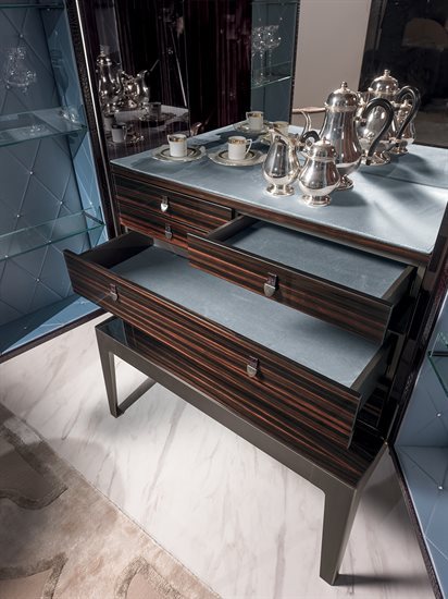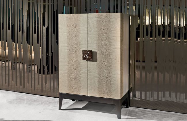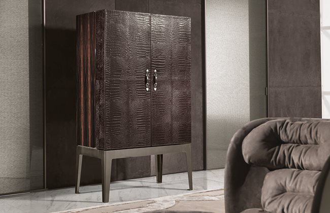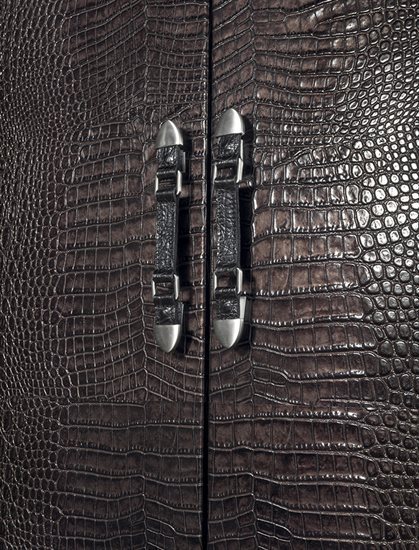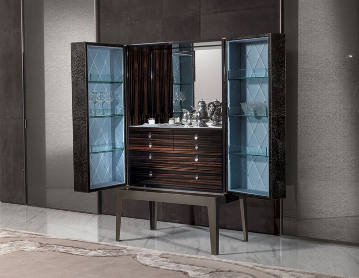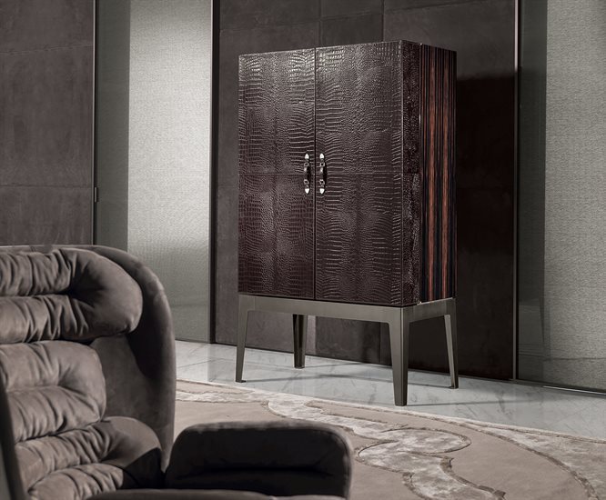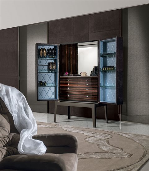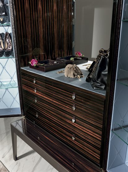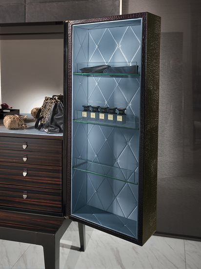 木质高柜,门板皮料覆面(依样本挑选),内侧缎面或天鹅绒覆面带菱纹绗缝与「施华洛世奇」钮扣。透明玻璃层板,皮革把手。中央带6格抽屉柜,抽屉底板天鹅绒覆面。开放格镜面背板,带led灯照明。可依要求定制加装鞋架支撑件。柜子的饰面可选:亮光烤漆(颜色依样本挑選)、亮光∕哑光黑檀木、亮光∕哑光卡纳莱托核桃木、亮光∕哑光西克莫槭木。金属底座采用磨削工艺制成,饰面可选:亮光浅金、亮光渐变棕、哑光香槟金、亮光镀铬、亮光镀黑铬、哑光缎面青铜、黑玫瑰金。