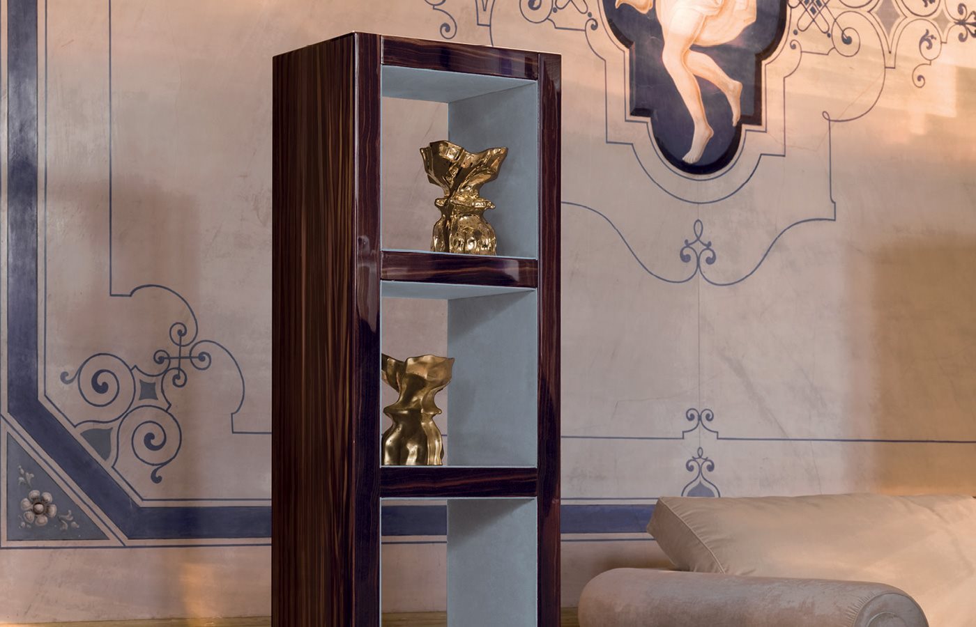 木质高柱形开放格书架,饰面:- 亮光或哑光黑檀木,搭配内侧P3类Suede与Lusso皮料覆面,或青铜色或烟熏色镜面;- 亮光或哑光西克莫槭木,搭配内侧P3类Suede与Lusso皮料覆面,或青铜色或烟熏色镜面;- 亮光或哑光卡纳莱托核桃木,搭配内侧P3类Suede与Lusso皮料覆面,或青铜色或烟熏色镜面;- 亮光象牙白烤漆,搭配内侧P3类Suede与Lusso皮料覆面,或青铜色或烟熏色镜面。