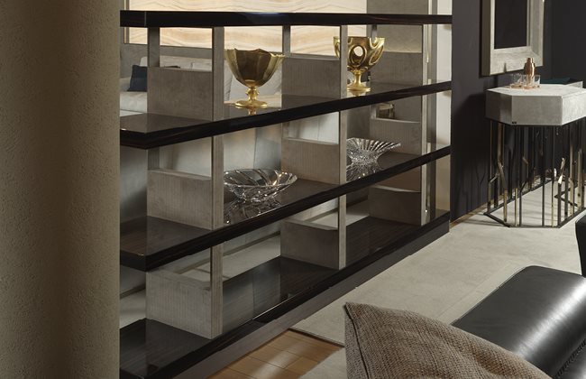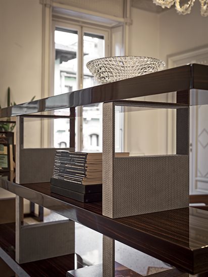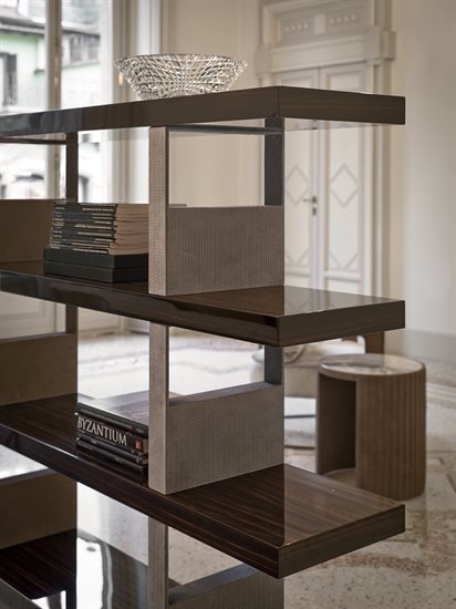 组合式书架,由不同长度的两片层板搭配金属支撑件∕垂直隔件组成,隔件皮料覆面可依样本挑选。台面可选:- 亮光烤漆,颜色依样本挑选;- 亮光∕哑光黑檀木;- 亮光∕哑光卡纳莱托核桃木;- 亮光∕哑光西克莫槭木。金属底座。