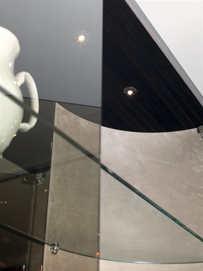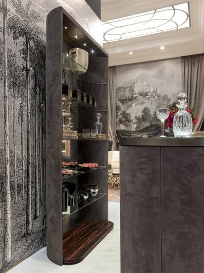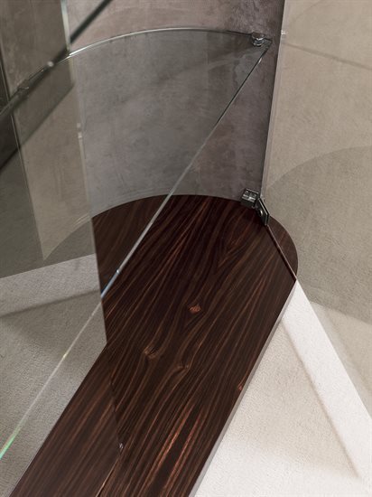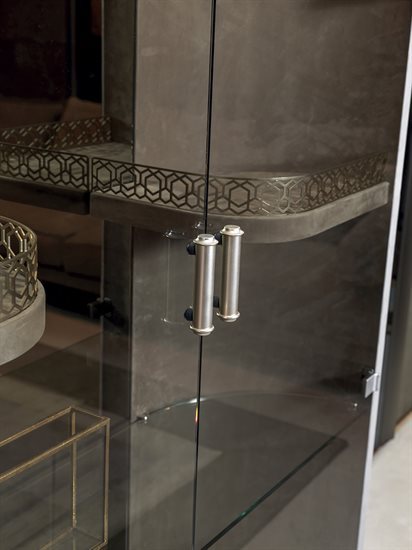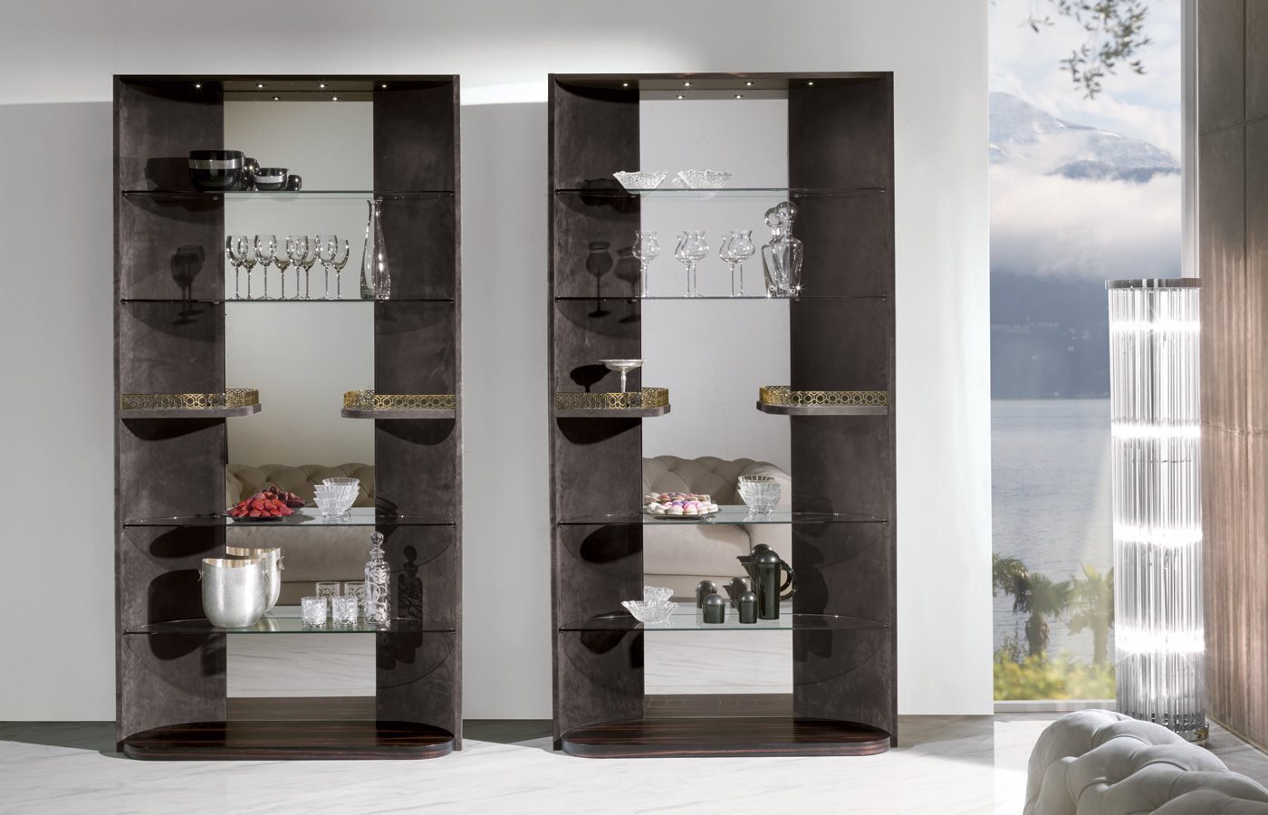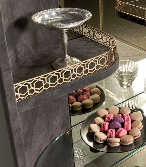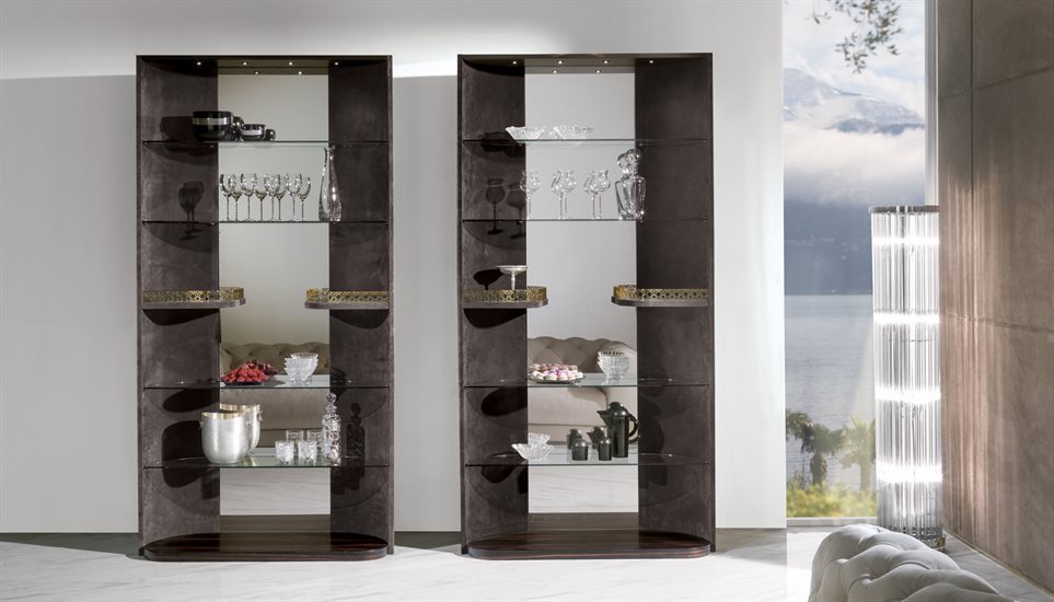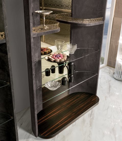 开放式展示柜与玻璃橱窗柜,青铜色或烟熏色玻璃门板。圆弧侧板皮料覆面,覆面依样本挑选。中央青铜色或烟熏色镜面。8mm透明水晶层板。托盘皮料覆面带激光切割「Sequence」装饰纹金属边框,金属可选以下饰面:黑玫瑰金、亮光浅金、亮光渐变棕、哑光香槟金、亮光镀铬、亮光镀黑铬、哑光缎面青铜、亮光玫瑰金、哑光玫瑰金。哑光黑檀木底座与台面,台面带三个led聚光灯。