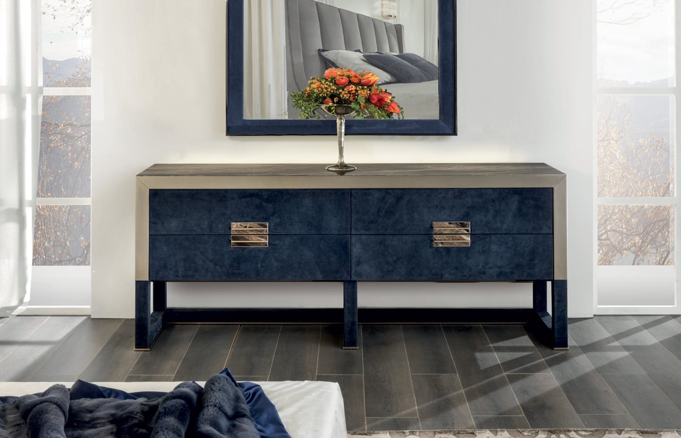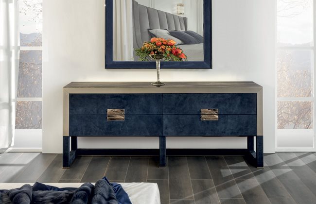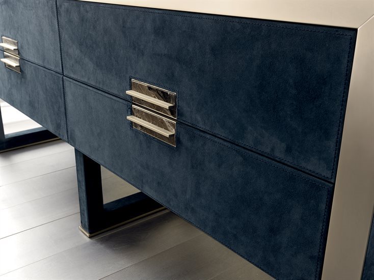 柜腿和框架由样品系列中Loro Piana Interiors皮革和 羊绒覆裹,或者也可选用下列木纹: 光面/哑光黑檀木; 光面/哑光Canaletto胡桃木; 光面象牙白烤漆。 底座轮廓和边框使用抛光金属,可选用下列表面处理: 光面浅金色; 哑光香槟金;