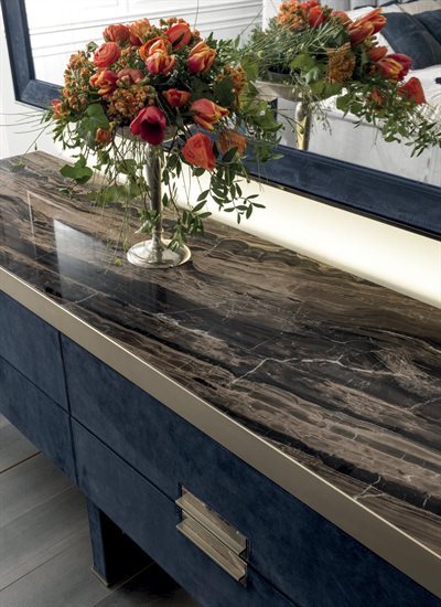 光面镀铬; 光面黑色镀铬; 哑光磨砂古铜。表面处理: 古铜色或烟灰色镜面; 黑色漆面水晶; 光面/哑光黑檀木; 光面/哑光Canaletto胡桃木; 光面象牙白烤漆。20毫米厚度大理石: Port Saint Laurent大理石; Rosso Levanto大理石; Bardiglio Nuvolato大理石; Elegant Brown大理石; Palissandro Oniciato大理石; Emperador Dark大理石; Silver Wave大理石;