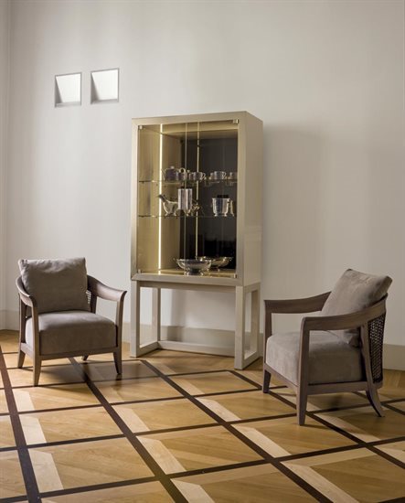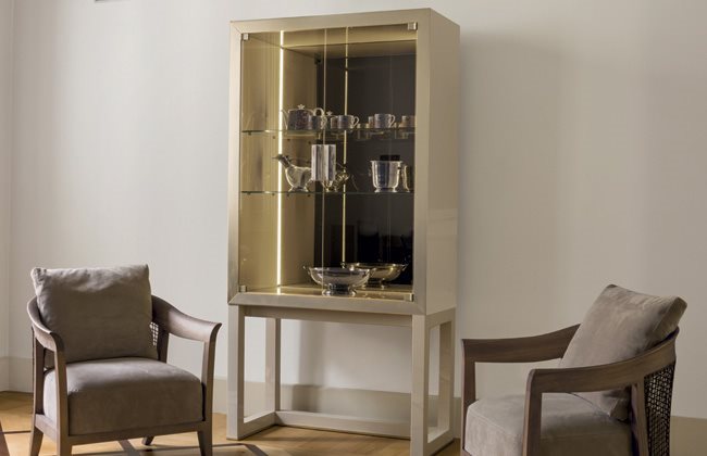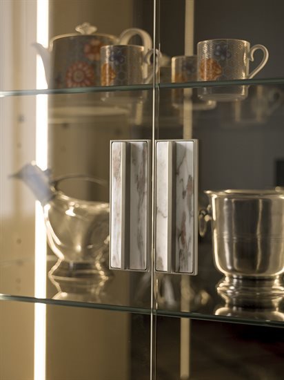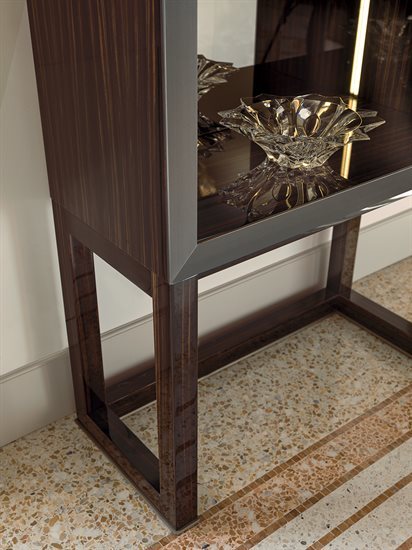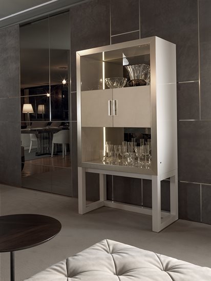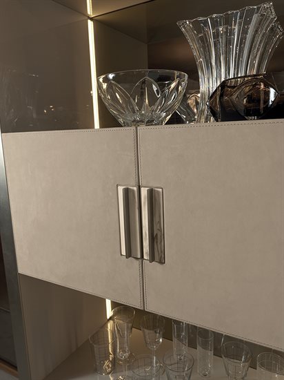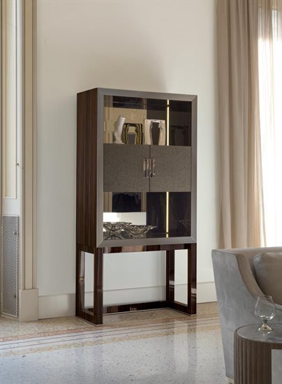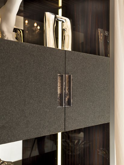 高柜版储藏柜/收纳柜,中央2片柜门可依样本挑选皮料或Loro Piana Interiors开士米羊绒覆面,或2片青铜色或烟熏色玻璃,搭配内侧透明水晶两片隔板。木质底座与结构,可选:亮光烤漆(颜色依样本挑選)、亮光∕哑光黑檀木、亮光∕哑光卡纳莱托核桃木、亮光∕哑光西克莫槭木。金属材质的底座与边框以磨削工艺制成,饰面可选:黑玫瑰金、亮光浅金、亮光渐变棕、哑光香槟金、亮光镀铬、亮光镀黑铬、哑光缎面青铜、亮光玫瑰金、哑光玫瑰金。把手的大理石可挑选。柜子的内侧背板采用青铜色或烟熏色镜面。内侧背板的两侧带可调光led灯条,为柜内空间提供照明。照明灯源通过碰触开关控制。