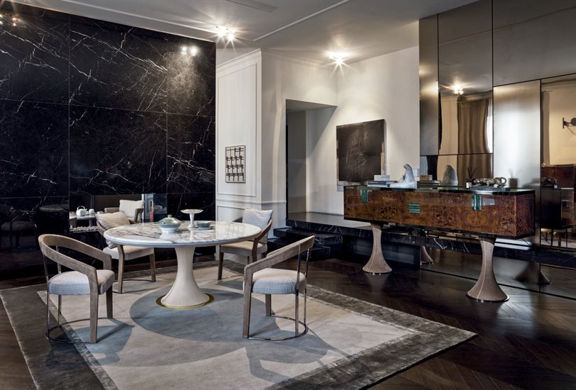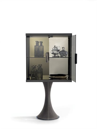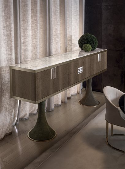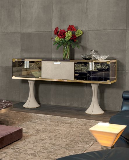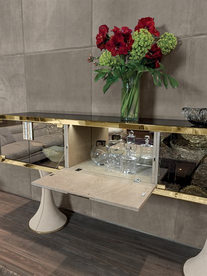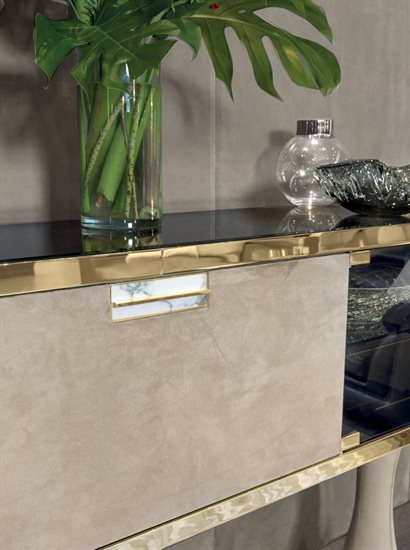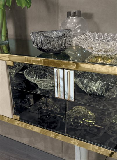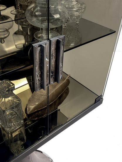 F - 餐具柜:钢化玻璃青铜色门板与侧板(烤漆木材后背板)。皮料覆面(依样本挑選)下掀式中央柜门。下掀门内侧采用P.3 Suede皮料覆面。内部无色镜面,青铜色8mm钢化玻璃中央隔板。可调光led灯条照明。照明灯源通过碰触开关控制。台面可选:磨斜边青铜色或烟熏色4mm镜面。金属把手带大理石嵌饰(依样本挑選)。底座金属板以及金属边框的饰面可选:黑玫瑰金、亮光浅金、亮光渐变棕、哑光香槟金、亮光镀铬、亮光镀黑铬、哑光缎面青铜、亮光玫瑰金、哑光玫瑰金。