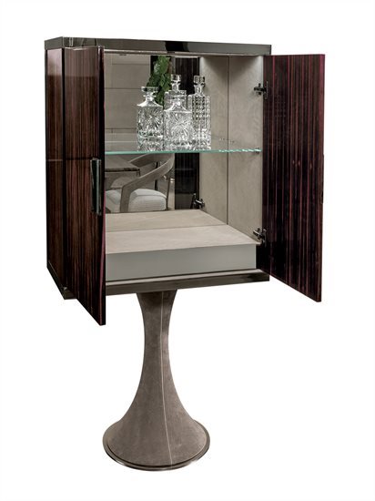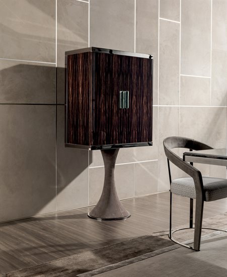 A/B – 木质或皮料覆面储藏柜:木质收纳柜,可选:亮光∕哑光黑檀木、亮光∕哑光卡纳莱托核桃木、亮光∕哑光西克莫槭木、亮光胡桃木树榴。柜门的木质与收纳柜的结构相同,或皮料覆面(依样本挑选)。内侧P.3 Suede皮料覆面。收纳格内部配备一个金属面板的抽屉,以及一片8mm透明钢化玻璃中央隔板。无色镜面内侧背板。可调光led灯条照明。照明灯源通过碰触开关控制。金属把手带大理石嵌饰(依样本挑選)。底座金属板以及金属边框的饰面可选:黑玫瑰金、亮光浅金、亮光渐变棕、哑光香槟金、亮光镀铬、亮光镀黑铬、哑光缎面青铜、亮光玫瑰金、哑光玫瑰金。台面可选磨斜边青铜色或烟熏色4mm镜面。
