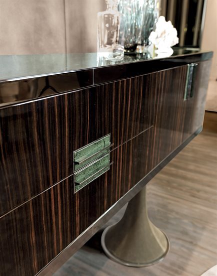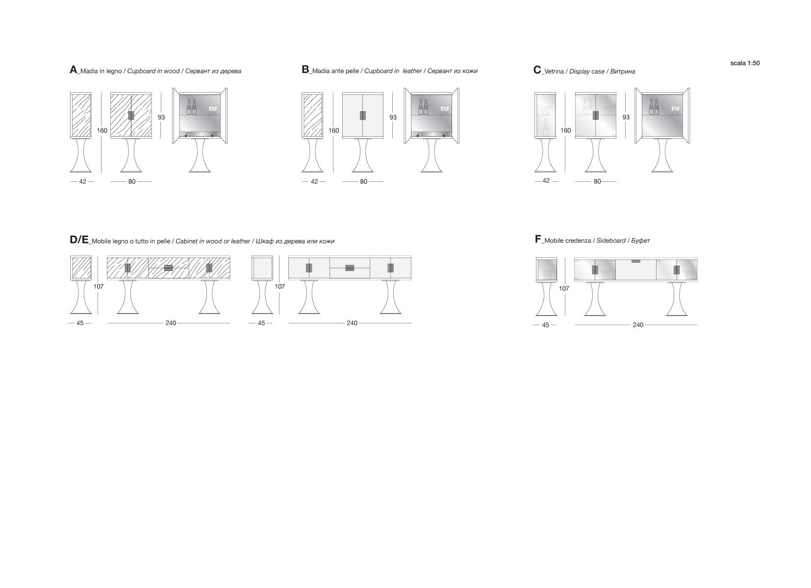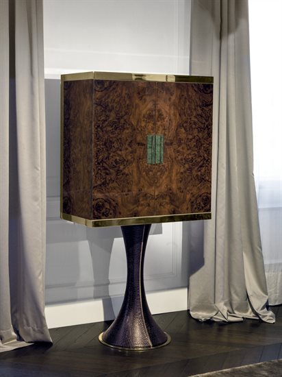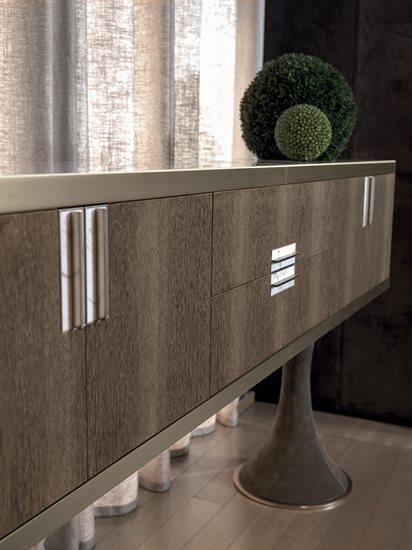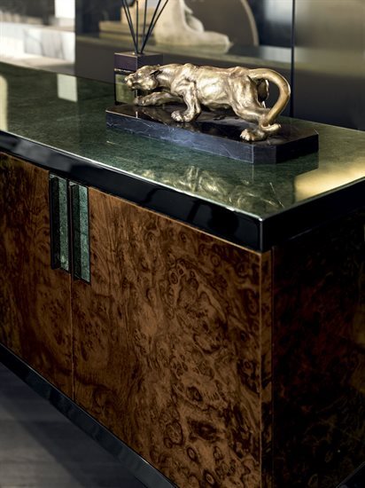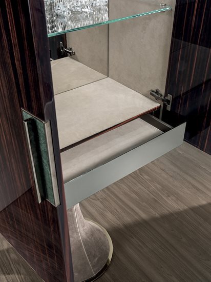 D/E – 木质或皮料覆面收纳柜:木质收纳柜,可选:亮光∕哑光黑檀木、亮光∕哑光卡纳莱托核桃木、亮光∕哑光西克莫槭木、亮光胡桃木树榴。柜门与抽屉正面面板的木质与收纳柜的结构相同,或皮料覆面(依样本挑选)。内侧烤漆哑光青铜色。台面可选:磨斜边青铜色或烟熏色4mm镜面,Sahara Noir大理石(聚酯面漆)、Dover White大理石、Panda White大理石、Verde Guatemala大理石、Corteccia大理石、Port Saint Laurent大理石、Rosso Levanto大理石、Bardiglio Nuvolato大理石、Elegant Brown大理石、Palissandro Oniciato大理石、Emperador Dark大理石、Silver Wave大理石、Agatha Black大理石、Frappuccino大理石、Calacatta Gold大理石、Fusion Light大理石、Patagonia大理石、Explosion Blu大理石、Fusion Multicolor大理石、Quarzo Juliet大理石。金属把手带大理石嵌饰(依样本挑選与台面配套的饰面)。底座金属板以及金属边框的饰面可选:黑玫瑰金、亮光浅金、亮光渐变棕、哑光香槟金、亮光镀铬、亮光镀黑铬、哑光缎面青铜、亮光玫瑰金、哑光玫瑰金。
