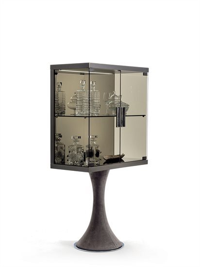 C – 展示柜:钢化玻璃青铜色门板与侧板(烤漆木材后背板)。收纳格内部配备一片透明8mm钢化玻璃中央隔板。可调光led灯条照明。照明灯源通过碰触开关控制。金属把手带大理石嵌饰(依样本挑選)。底座金属板以及金属边框的饰面可选:黑玫瑰金、亮光浅金、亮光渐变棕、哑光香槟金、亮光镀铬、亮光镀黑铬、哑光缎面青铜、亮光玫瑰金、哑光玫瑰金。台面可选磨斜边青铜色或烟熏色4mm镜面。