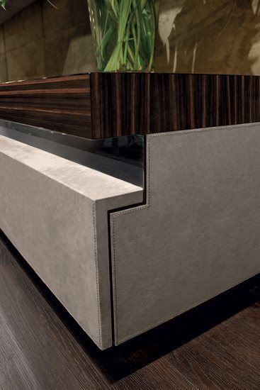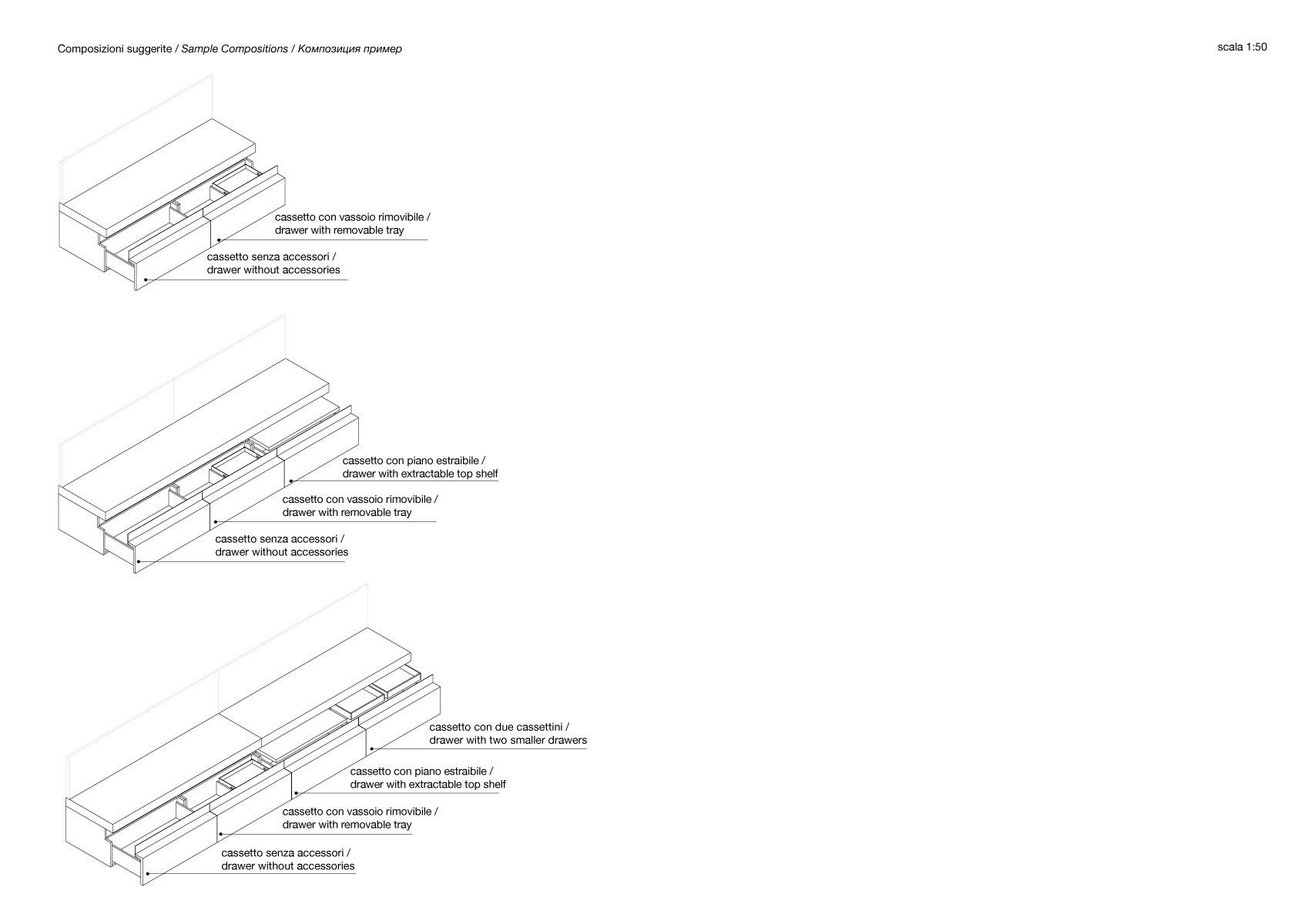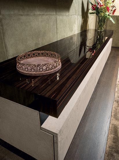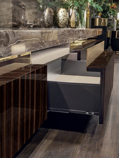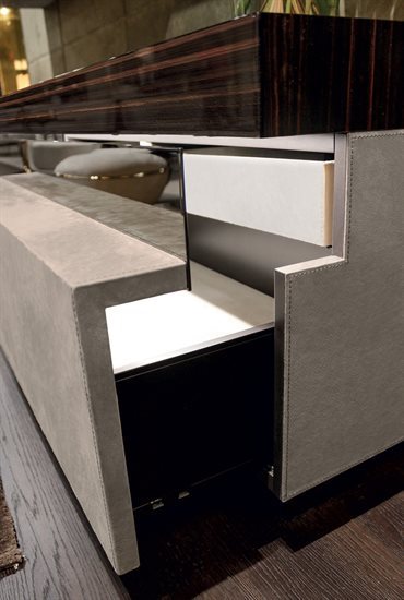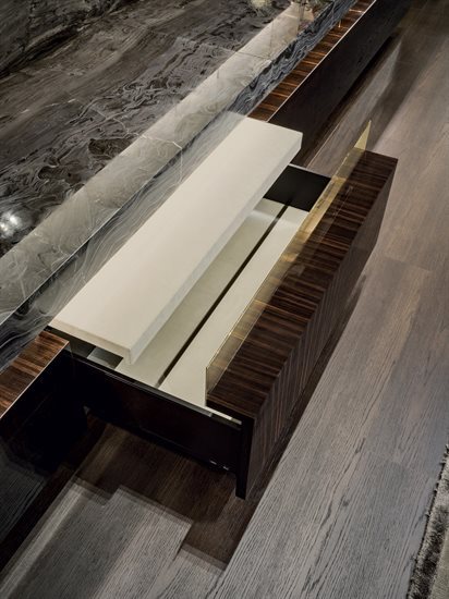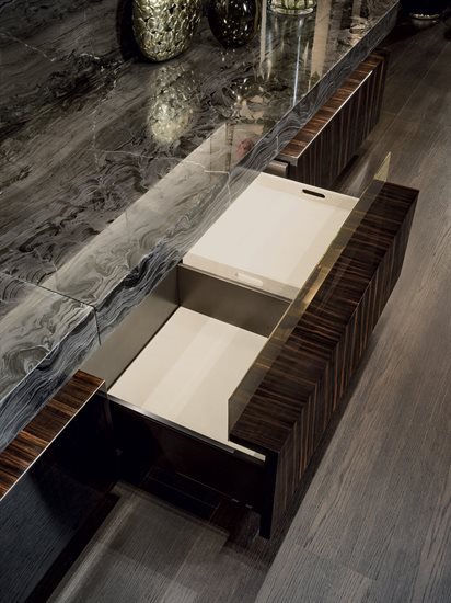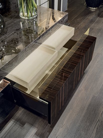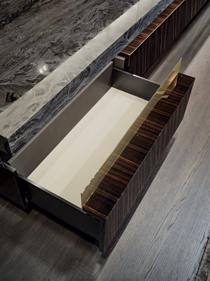 组合式模块化系统客厅收纳柜,由木质大抽屉组成,木质可选:亮光∕哑光黑檀木、亮光∕哑光卡纳莱托核桃木、亮光∕哑光西克莫槭木、亮光胡桃木树榴、亮光烤漆(象牙白、草绳褐、摩卡棕色)、或皮料覆面。金属柜脚底座,漆饰青铜色。按压式开关抽屉,凹槽内侧金属片采用磨削工艺制成,饰面可选:黑玫瑰金、亮光玫瑰金、哑光玫瑰金、亮光浅金、亮光渐变棕、哑光香槟金、亮光镀铬、亮光镀黑铬、哑光缎面青铜。凹槽内侧带可调光led灯,通过碰触开关控制。抽屉内侧漆饰青铜色,底板p.3 Suede皮料覆面。可选木质或10cm大理石台面,大理石可选:Dover White大理石、Panda White大理石、Corteccia大理石、Port Saint Laurent大理石、Rosso Levanto大理石、Bardiglio Nuvolato大理石、Elegant Brown大理石、Palissandro Oniciato大理石、Emperador Dark大理石、Silver Wave大理石、Agatha Black大理石、Frappuccino大理石、Calacatta Gold大理石、Fusion Light大理石、Patagonia大理石、Explosion Blu大理石、Fusion Multicolor大理石。为了拥有多样化组合特性,系统提供抽屉内部3种不同的配置:
