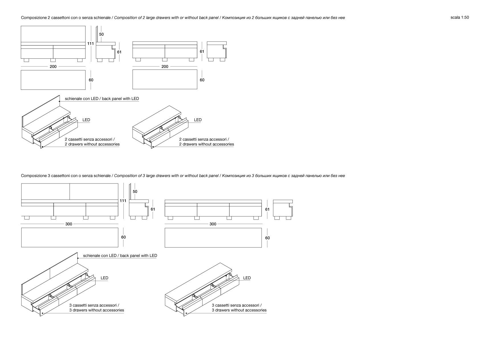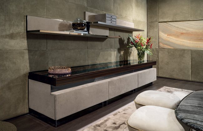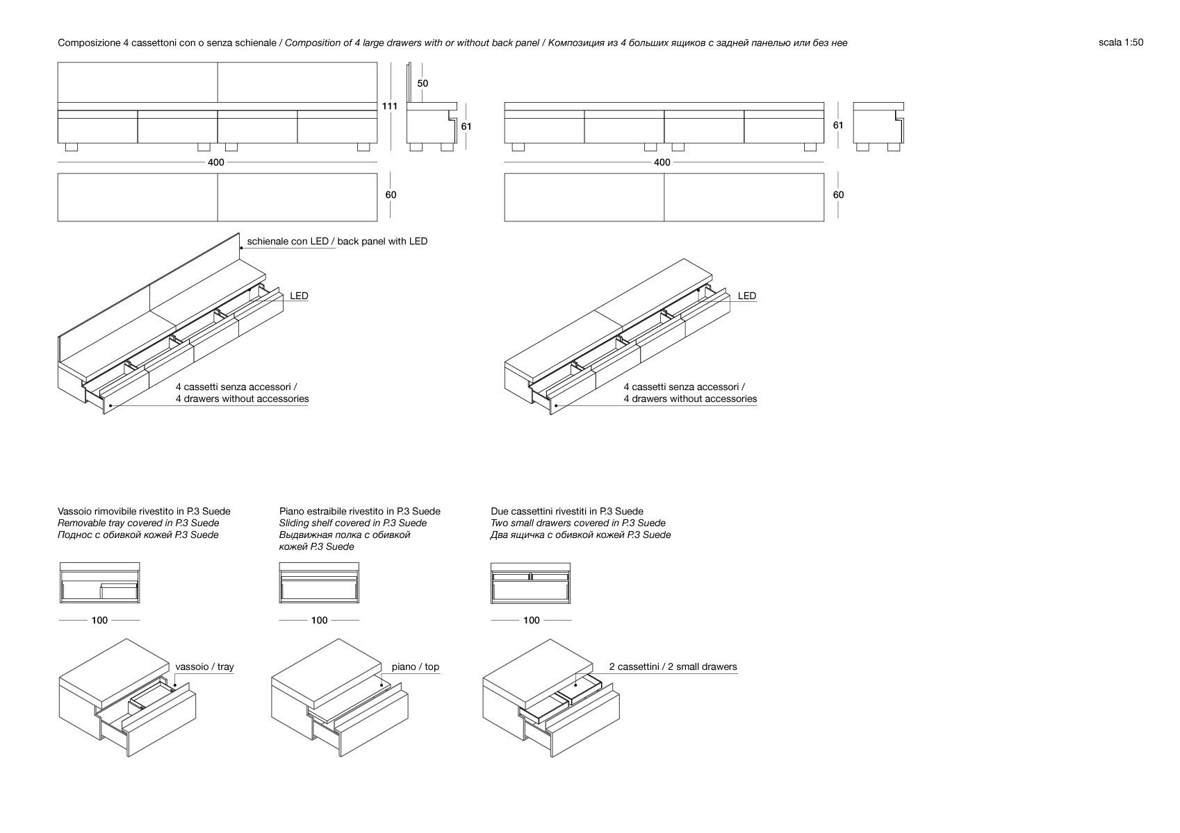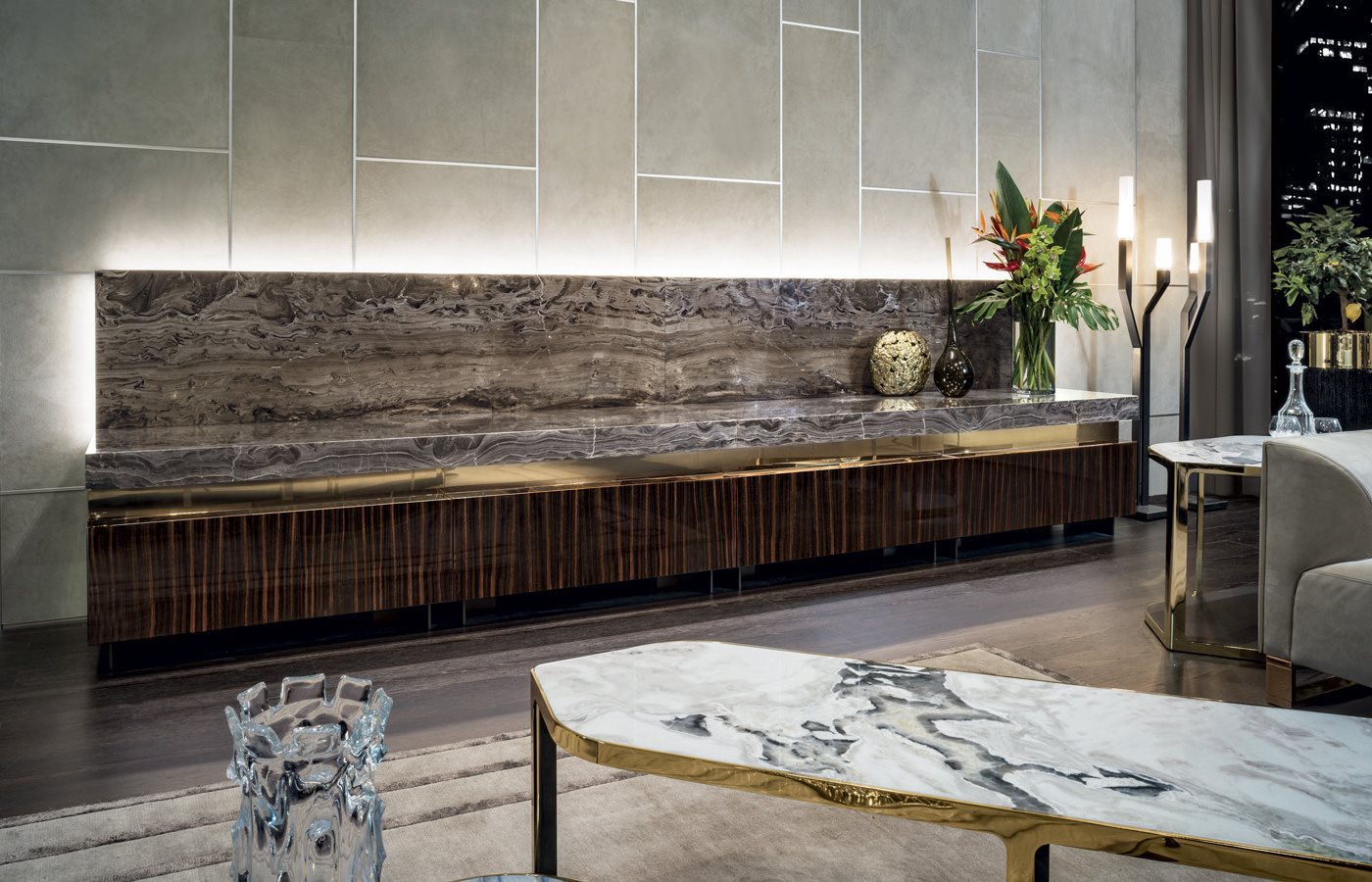 组合式模块化系统客厅收纳柜,由木质大抽屉组成,木质可选:亮光∕哑光黑檀木、亮光∕哑光卡纳莱托核桃木、亮光∕哑光西克莫槭木、亮光胡桃木树榴、亮光烤漆(象牙白、草绳褐、摩卡棕色)、或皮料覆面。金属柜脚底座,漆饰青铜色。按压式开关抽屉,凹槽内侧金属片采用磨削工艺制成,饰面可选:黑玫瑰金、亮光玫瑰金、哑光玫瑰金、亮光浅金、亮光渐变棕、哑光香槟金、亮光镀铬、亮光镀黑铬、哑光缎面青铜。凹槽内侧带可调光led灯,通过碰触开关控制。抽屉内侧漆饰青铜色,底板p.3 Suede皮料覆面。可选木质或10cm大理石台面,大理石可选:Dover White大理石、Panda White大理石、Corteccia大理石、Port Saint Laurent大理石、Rosso Levanto大理石、Bardiglio Nuvolato大理石、Elegant Brown大理石、Palissandro Oniciato大理石、Emperador Dark大理石、Silver Wave大理石、Agatha Black大理石、Frappuccino大理石、Calacatta Gold大理石、Fusion Light大理石、Patagonia大理石、Explosion Blu大理石、Fusion Multicolor大理石。为了拥有多样化组合特性,系统提供抽屉内部3种不同的配置: