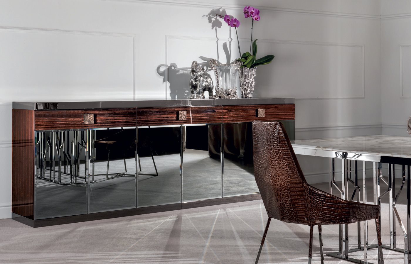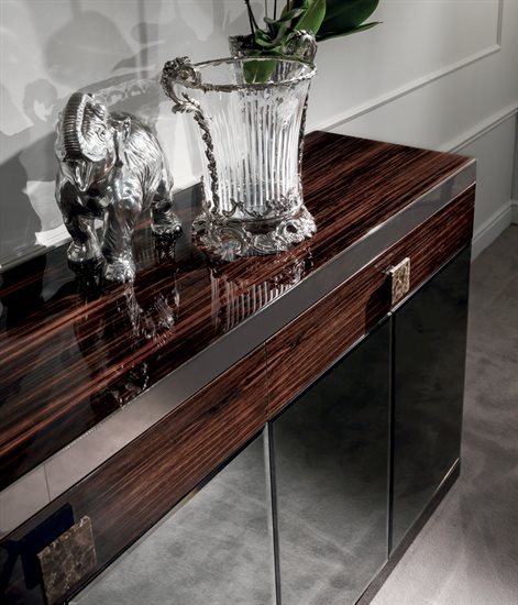 客厅柜,带柜门与抽屉。以下不同版本可供选择:A – 全木质;B – 木质结构搭配大理石或镜面台面;C – 木质侧板与台面,正面皮料覆面(依样本挑选)或镜面;D – 全皮料覆面(依样本挑选),搭配大理石或镜面台面;E – 木质侧板,大理石或镜面台面,正面皮料覆面(依样本挑选)或镜面。金属边框采用磨削工艺制成,饰面可选:黑玫瑰金、亮光浅金、亮光渐变棕、哑光香槟金、亮光镀铬、亮光镀黑铬、哑光缎面青铜。木质可选:亮光烤漆(颜色依样本挑選)、亮光∕哑光黑檀木、亮光∕哑光卡纳莱托核桃木、亮光∕哑光西克莫槭木、青铜色或烟熏色磨斜边镜面。大理石:Sahara Noir大理石(聚酯面漆)、Dover White大理石、Panda White大理石、Verde Guatemala大理石、Corteccia大理石、Port Saint Laurent大理石、Rosso Levanto大理石、Bardiglio Nuvolato大理石、Elegant Brown大理石、Palissandro Oniciato大理石、Emperador Dark大理石、Silver Wave大理石、Agatha Black大理石、Frappuccino大理石、Calacatta Gold大理石、Fusion Light大理石、Patagonia大理石、Explosion Blu大理石、Fusion Multicolor大理石、Quarzo Juliet大理石、Calcite Azul大理石。皮料覆面版本带大理石把手,而镜面版本搭配按压式开启机制。