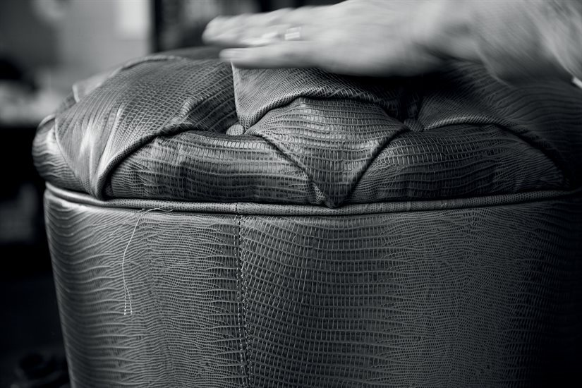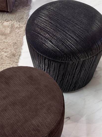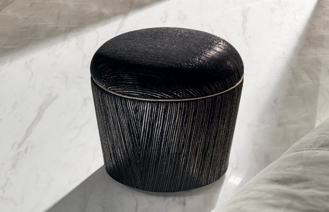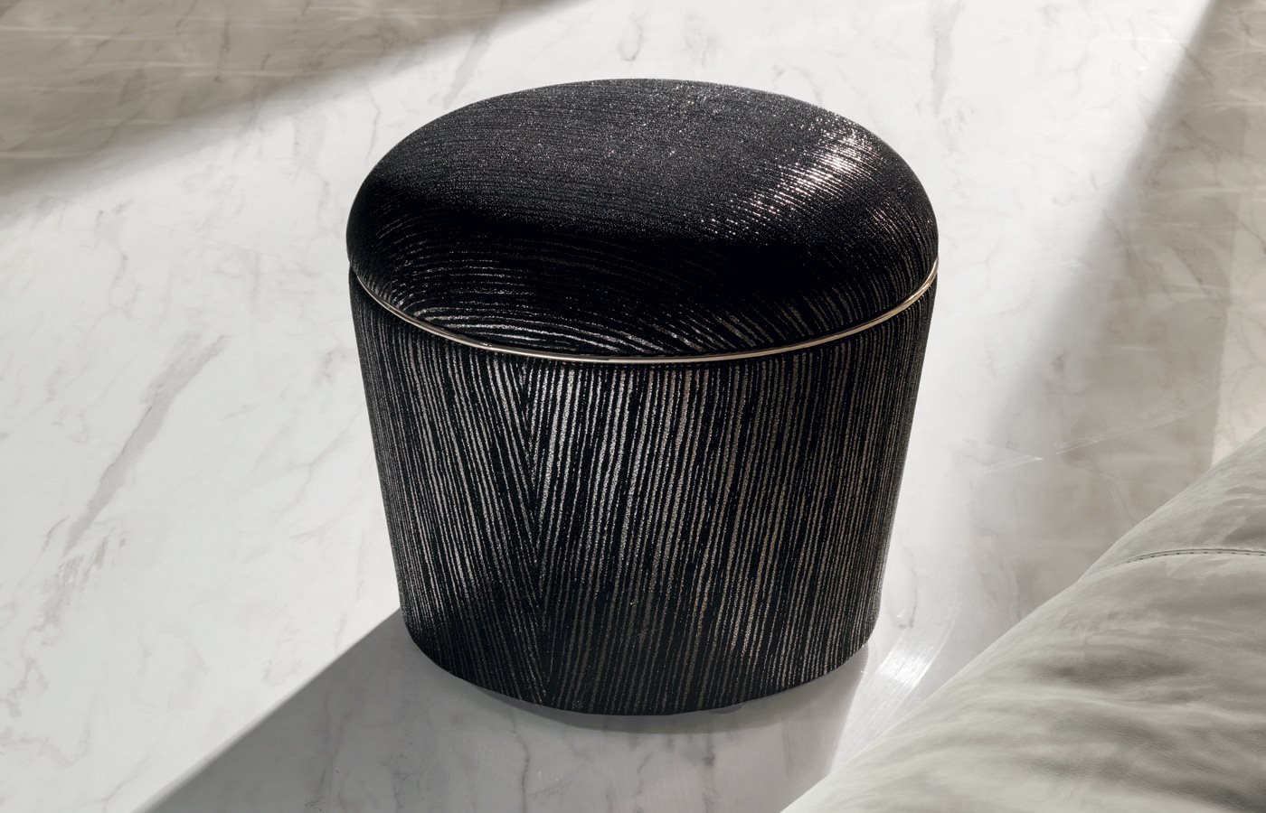 沙发凳,玻璃纤维结构,坐面木材结构外覆高密度聚氨酯泡沫,皮料覆面。金属饰环的饰面可选:亮光浅金、亮光渐变棕、黑玫瑰金、哑光香槟金、亮光镀铬、亮光镀黑铬、哑光缎面青铜、亮光玫瑰金、哑光玫瑰金。皮料或布料覆面皆不可拆卸。