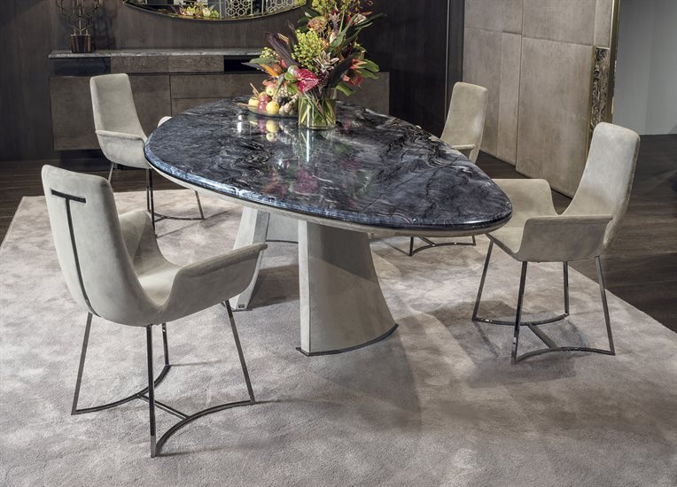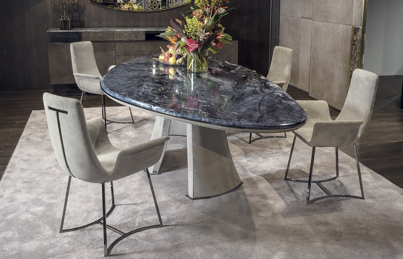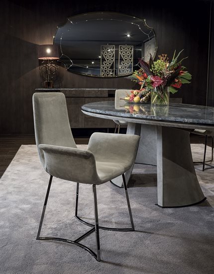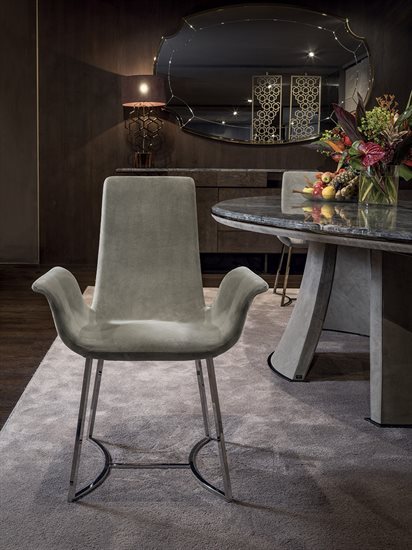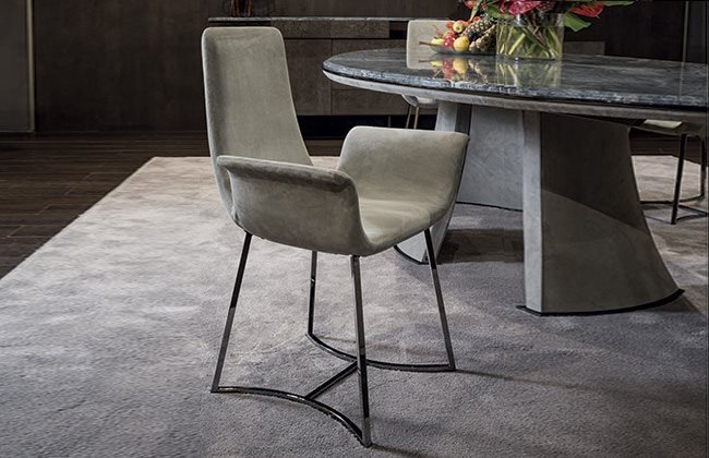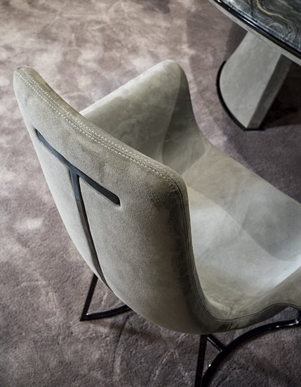 内侧铁结构,冷模压成型发泡。底座与优雅的椅背支撑嵌件采用金属制成,可选以下镀锌饰面:亮光浅金、亮光渐变棕、哑光香槟金、亮光镀铬、亮光镀黑铬、哑光缎面青铜、亮光玫瑰金、哑光玫瑰金、黑玫瑰金。覆面附着黏合于主体的形态上,不可拆卸。