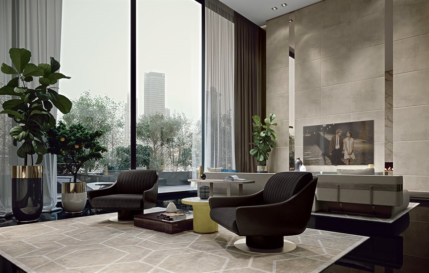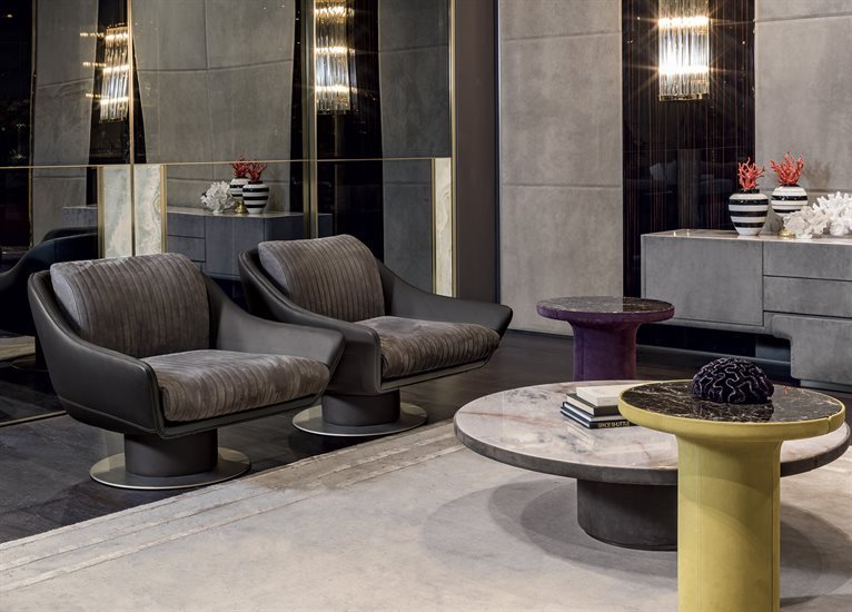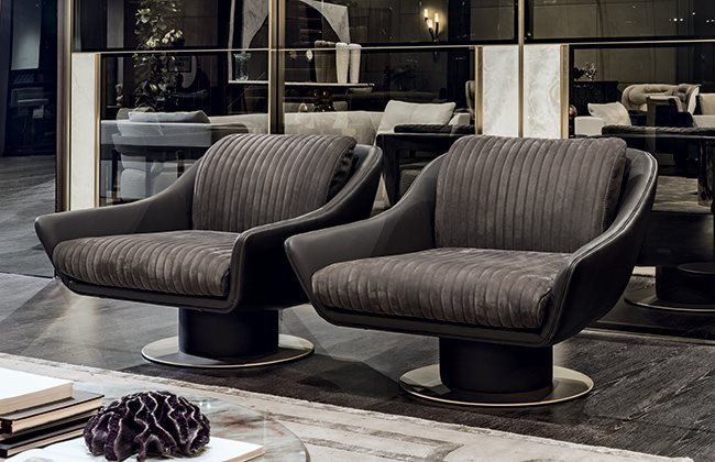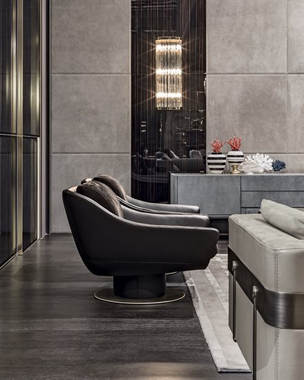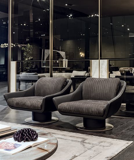 木材结构外覆高密度聚氨酯泡沫。坐面与靠背则为中∕硬聚氨酯泡沫,皆饰以罗纹绗缝。椅脚支柱带木材框架,覆面材料与扶手椅的饰面相同,内部配备带自动调准机制的360°旋转销轴。金属底座采用激光切割,饰面可选:亮光浅金、亮光渐变棕、哑光香槟金、亮光镀铬、亮光镀黑铬、哑光镀镍、漆饰青铜色。