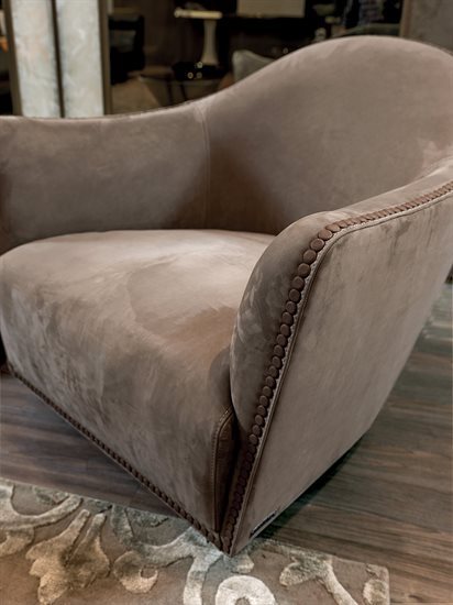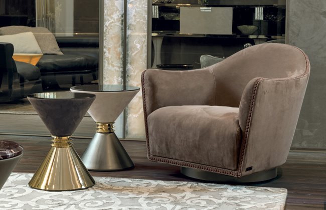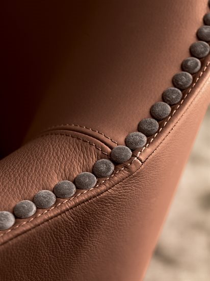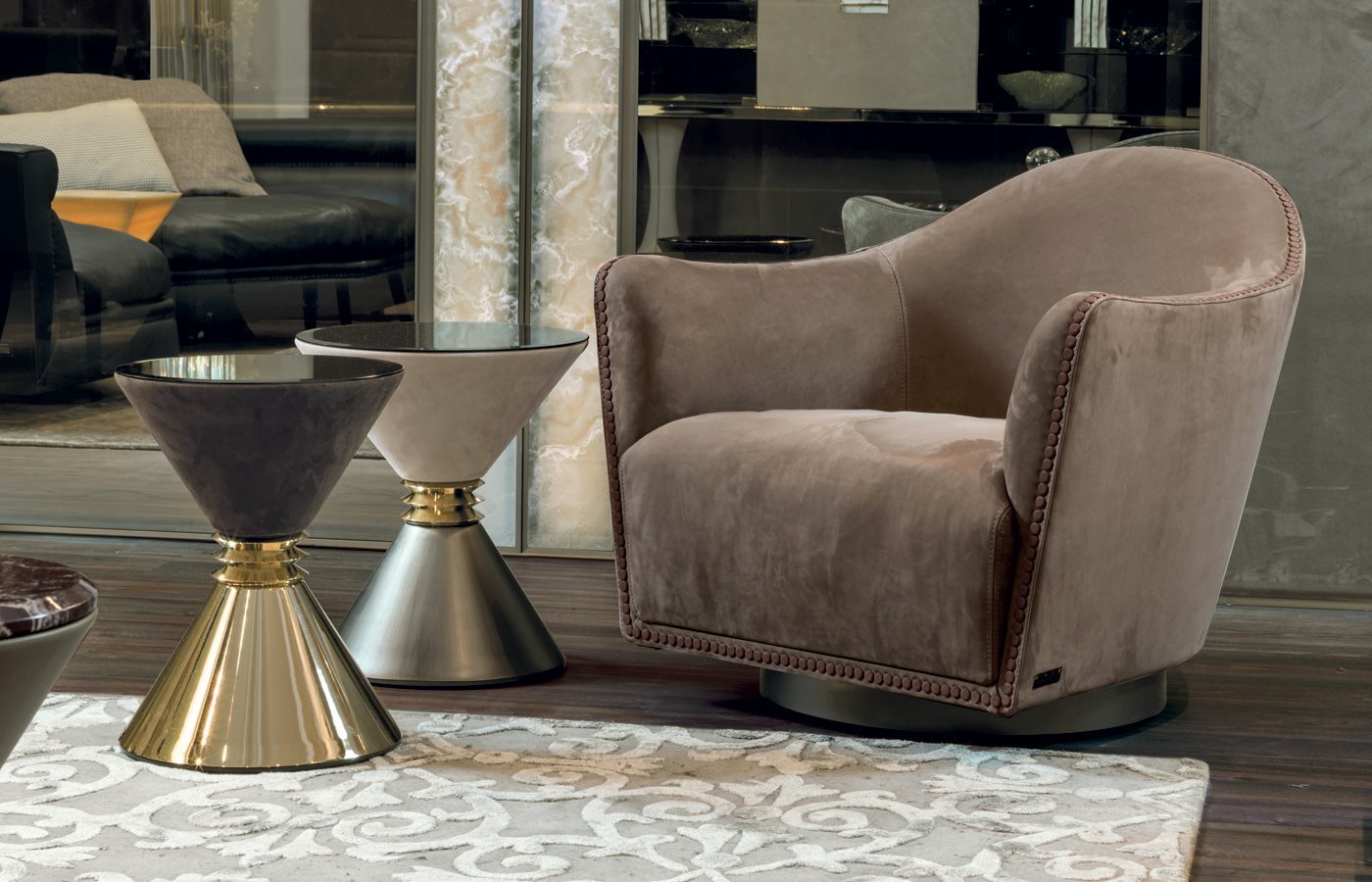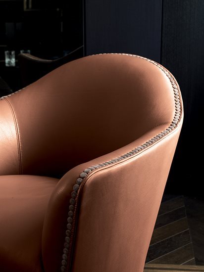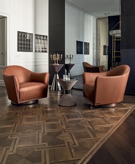 360°旋转扶手椅,以皮料或布料覆面搭配手工逐一放置的装饰扣展现特色,饰扣可选:亮光镀铬、哑光黑色、亮光浅金、亮光渐变棕与哑光复古金;或者皮料覆面与,在可执行的前提下,也可选用丝绒覆面。结构采用山毛榉木与杉木胶合板制成,搭配高耐度松紧带,外覆高密度聚氨酯泡沫。