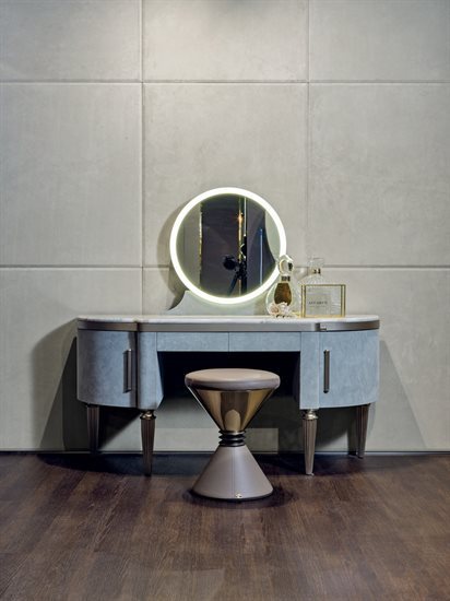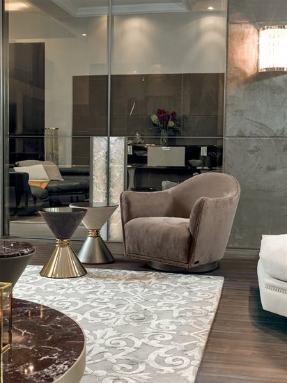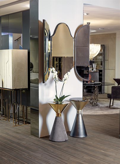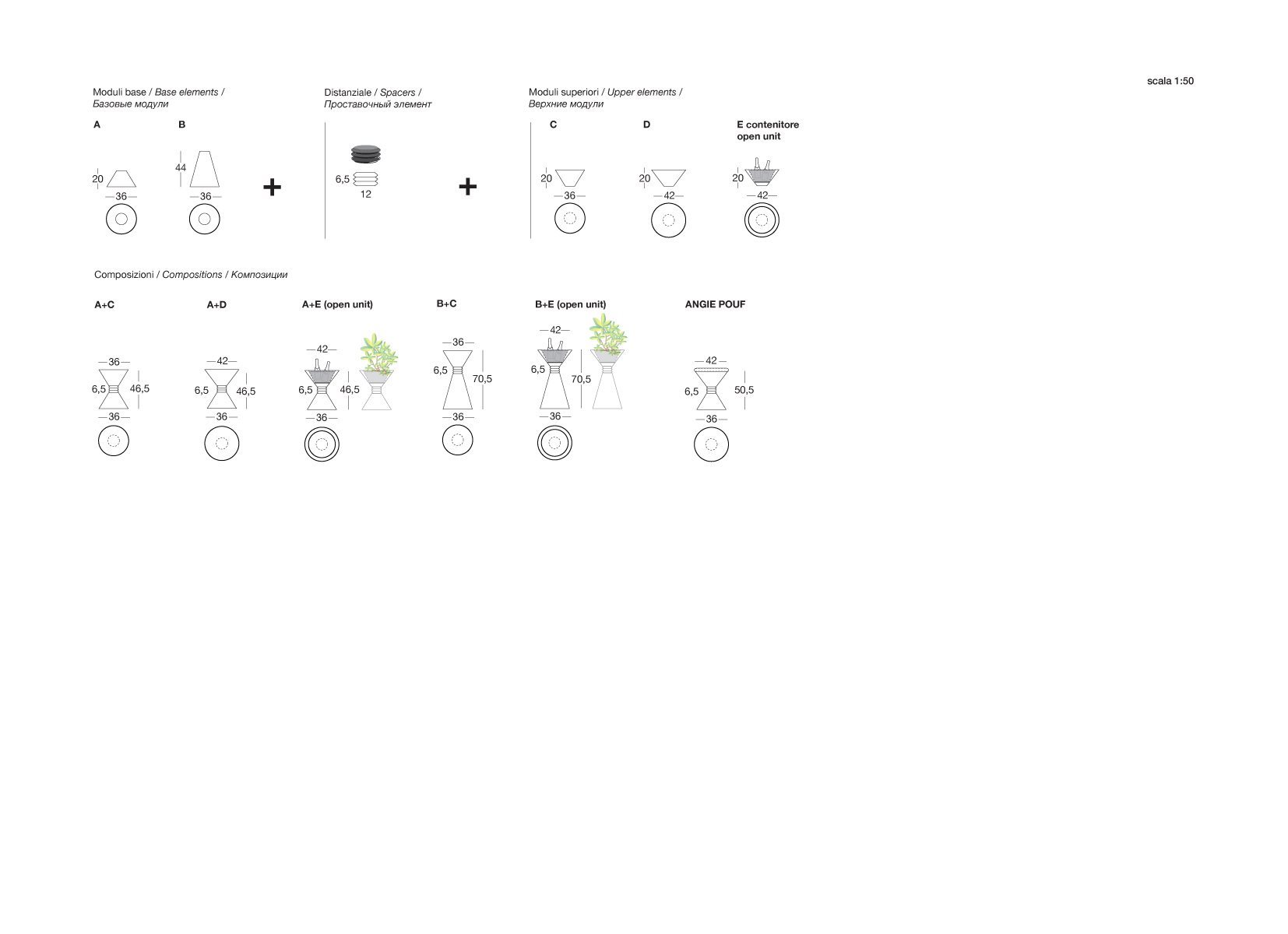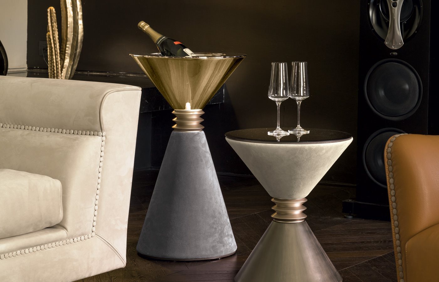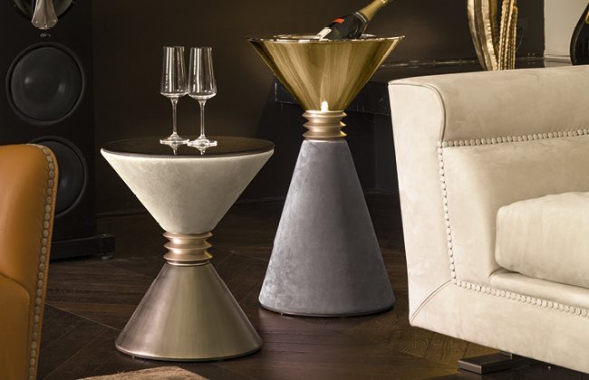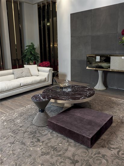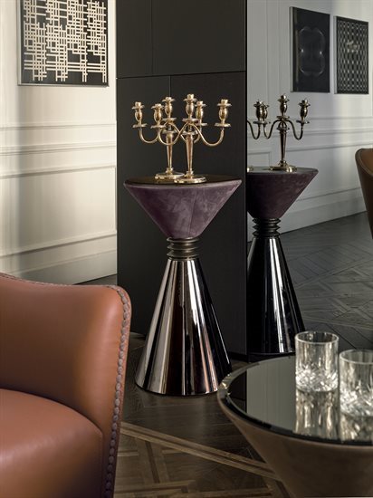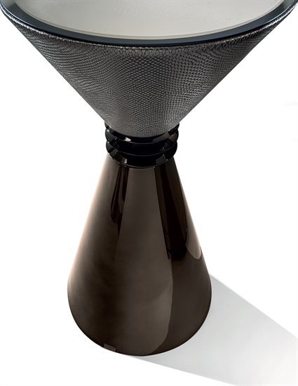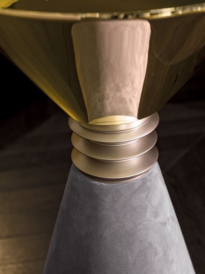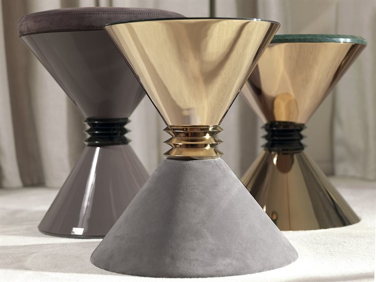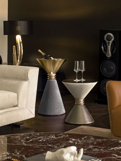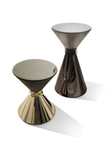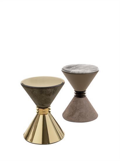 组合式系列金属茶几,圆锥形底座,推出多种尺寸与饰面。金属结构:黑玫瑰金、亮光浅金、亮光渐变棕、哑光香槟金、亮光镀铬、亮光镀黑铬、哑光缎面青铜、亮光玫瑰金、哑光玫瑰金、亮光烤漆(颜色依样本挑选)、皮料覆面(依样本挑选)。车削金属间隔件,饰面可选:黑玫瑰金、亮光浅金、亮光渐变棕、哑光香槟金、亮光镀铬、亮光镀黑铬、哑光缎面青铜、亮光玫瑰金、哑光玫瑰金。只有上半部分可选金属搭配不锈钢盆的元素,其中的盆状容器可用于摆放酒瓶或植物花卉。台面可选:磨斜边青铜色或烟熏色4mm镜面;厚度20mm磨斜边20mm大理石:Portoro大理石、Azul Macauba大理石、Sahara Noir大理石(聚酯面漆)、Dover White大理石、Panda White大理石、Verde Guatemala大理石、Corteccia大理石、Port Saint Laurent大理石、Rosso Levanto大理石、Bardiglio Nuvolato大理石、Elegant Brown大理石、Palissandro Oniciato大理石、Emperador Dark大理石、Silver Wave大理石、Agatha Black大理石、Frappuccino大理石、Calacatta Gold大理石、Fusion Light大理石、Patagonia大理石、Explosion Blu大理石、Fusion Multicolor大理石、Quarzo Juliet大理石、Calcite Azul大理石。仅用于容器模块的桌面(带嵌入盆状容器的圆孔)为金属材质,金属饰面依样本挑选。 ANGIE pouf茶几搭配枕垫即变成椅凳∕沙发凳,枕垫的皮料覆面可依样本挑选。