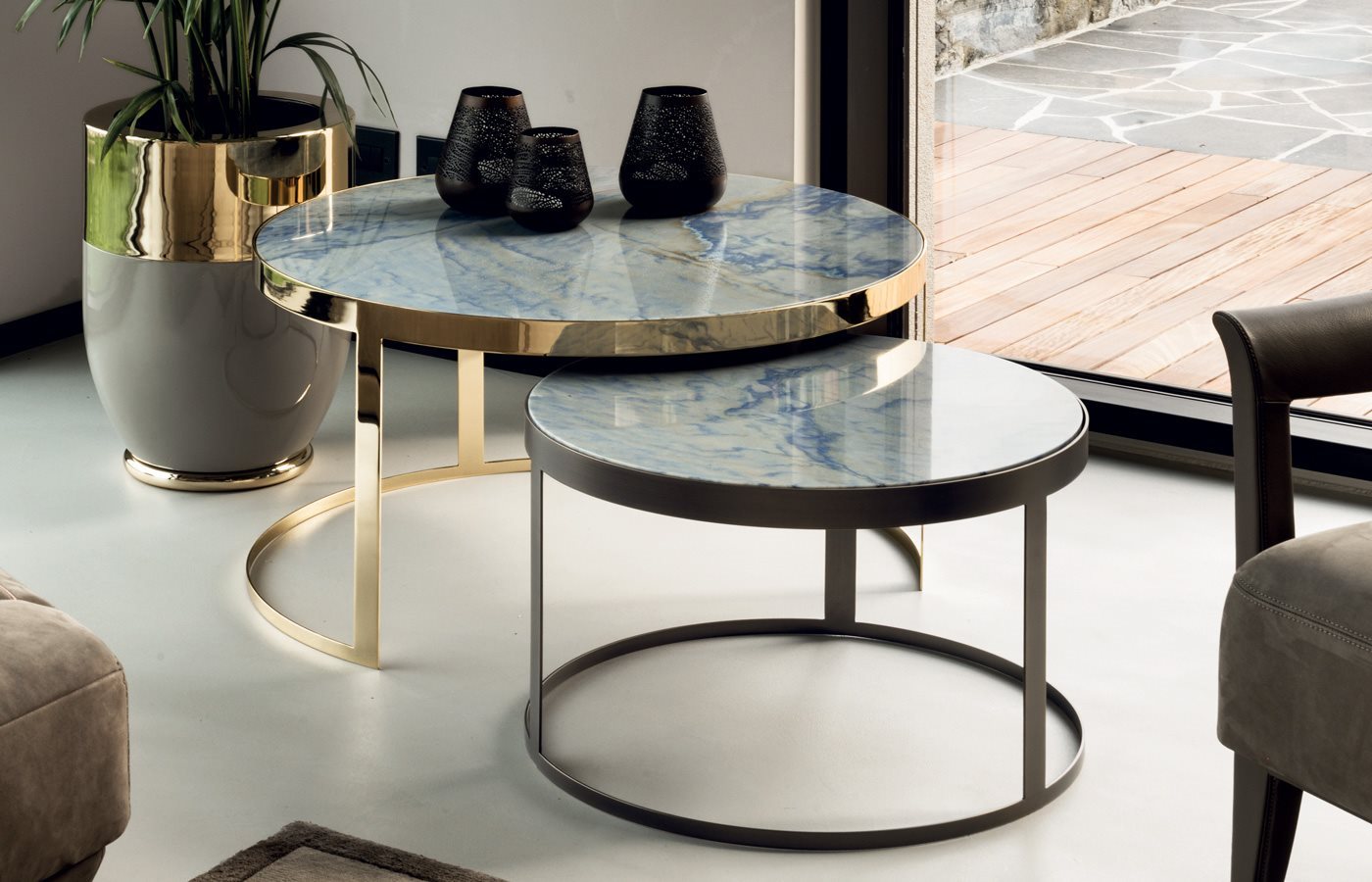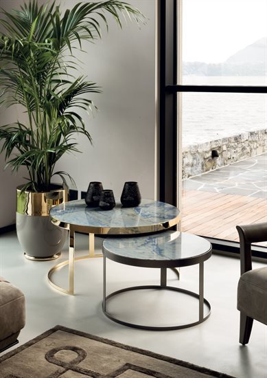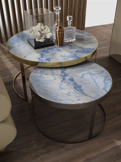 茶几,预设在配对摆设时能最佳展现其互嵌的造型,金属结构采用磨削工艺搭配激光切割制成。结构饰面:黑玫瑰金、亮光浅金、亮光渐变棕、哑光香槟金、亮光镀铬、亮光镀黑铬、哑光缎面青铜、亮光玫瑰金、哑光玫瑰金。台面可选:青铜色或烟熏色镜面,Portoro大理石、Azul Macauba大理石、Sahara Noir大理石(聚酯面漆)、Dover White大理石、Panda White大理石、Verde Guatemala大理石、Corteccia大理石、Port Saint Laurent大理石、Rosso Levanto大理石、Bardiglio Nuvolato大理石、Elegant Brown大理石、Palissandro Oniciato大理石、Emperador Dark大理石、Silver Wave大理石、Agatha Black大理石、Frappuccino大理石、Calacatta Gold大理石、Fusion Light大理石、Patagonia大理石、Explosion Blu大理石、Fusion Multicolor大理石、Quarzo Juliet大理石、Calcite Azul大理石、红色缟玛瑙。