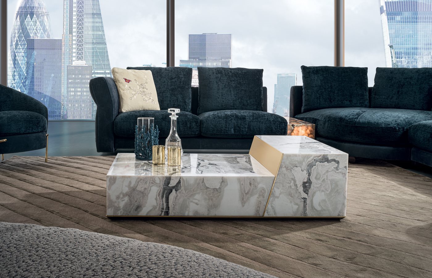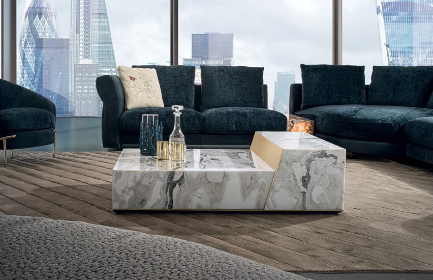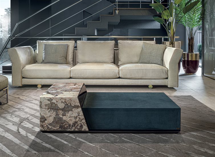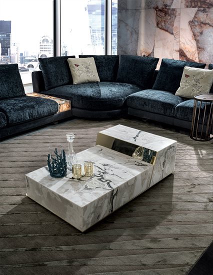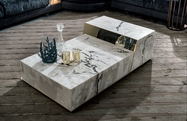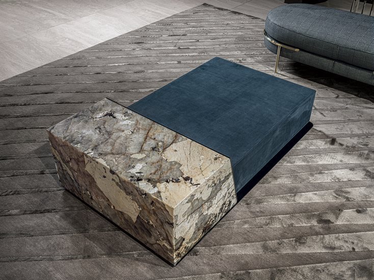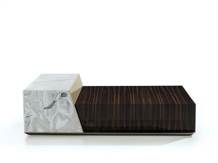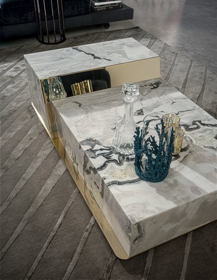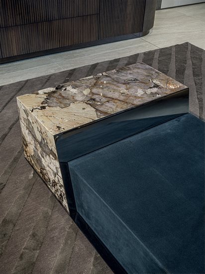 矮茶几,由两个不同高度的块状结构组成,金属嵌饰的饰面可选:亮光渐变棕、黑玫瑰金、亮光浅金、哑光香槟金、亮光镀铬、亮光镀黑铬、哑光缎面青铜、亮光玫瑰金、哑光玫瑰金。较低的块体可选皮料覆面(依样本挑选)、亮光烤漆木材(颜色依样本挑选)、亮光∕哑光黑檀木、亮光∕哑光染Macadamia色卡纳莱托核桃木、亮光∕哑光西克莫槭木,或Emperador Dark大理石、Verde Guatemala大理石、Bardiglio Nuvolato大理石、Palissandro Oniciato大理石、Silver Wave大理石、Agatha Black大理石、Calacatta Gold大理石、Dover White大理石、Rosso Levanto大理石、Elegant Brown大理石、Frappuccino大理石、Corteccia大理石、Panda White大理石、Port Saint Laurent大理石、Fusion Light大理石、Patagonia大理石、Explosion Blu大理石、Fusion Multicolor大理石、Azul Macauba大理石、Portoro大理石、红色缟玛瑙、象牙白缟玛瑙、白色缟玛瑙。高块体则仅可选大理石∕缟玛瑙,石材饰面可选上列的选项。