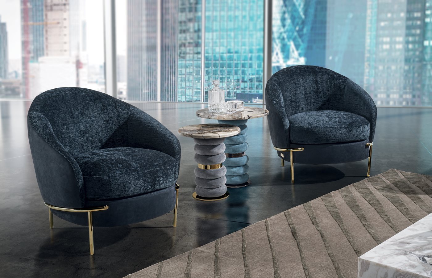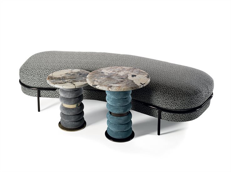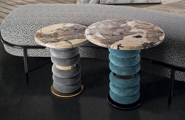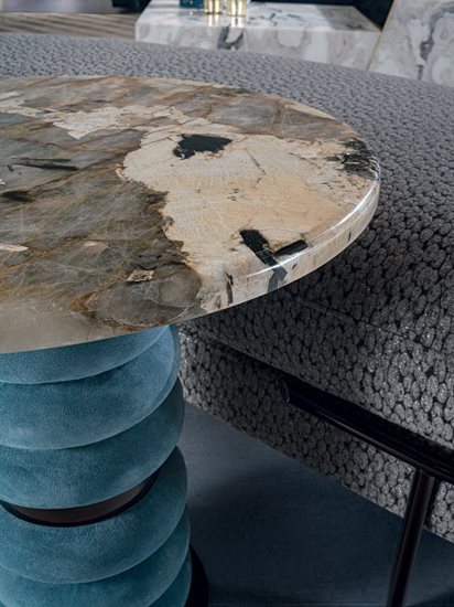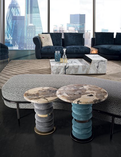 环圈底座茶几,环状元素外覆P.3类Suede皮料或P.9类Nabuck皮料,带30mm金属嵌饰,饰面可选:亮光渐变棕、黑玫瑰金、亮光浅金、哑光香槟金、亮光镀铬、亮光镀黑铬、哑光缎面青铜、亮光玫瑰金、哑光玫瑰金。台面可选:磨斜边青铜色或烟熏色5mm镜面;厚度20mm外侧半圆磨边大理石:Emperador Dark大理石、Verde Guatemala大理石、Bardiglio Nuvolato大理石、Palissandro Oniciato大理石、Silver Wave大理石、Agatha Black大理石、Calacatta Gold大理石、Dover White大理石、Rosso Levanto大理石、Elegant Brown大理石、Frappuccino大理石、Corteccia大理石、Panda White大理石、Sahara Noir大理石(聚酯面漆)、Calcite Azul大理石、Port Saint Laurent大理石、Fusion Light大理石、Patagonia大理石、Explosion Blu大理石、Fusion Multicolor大理石、Quarzo Juliet大理石、Azul Macauba大理石、Portoro大理石、红色缟玛瑙、象牙白缟玛瑙、白色缟玛瑙。